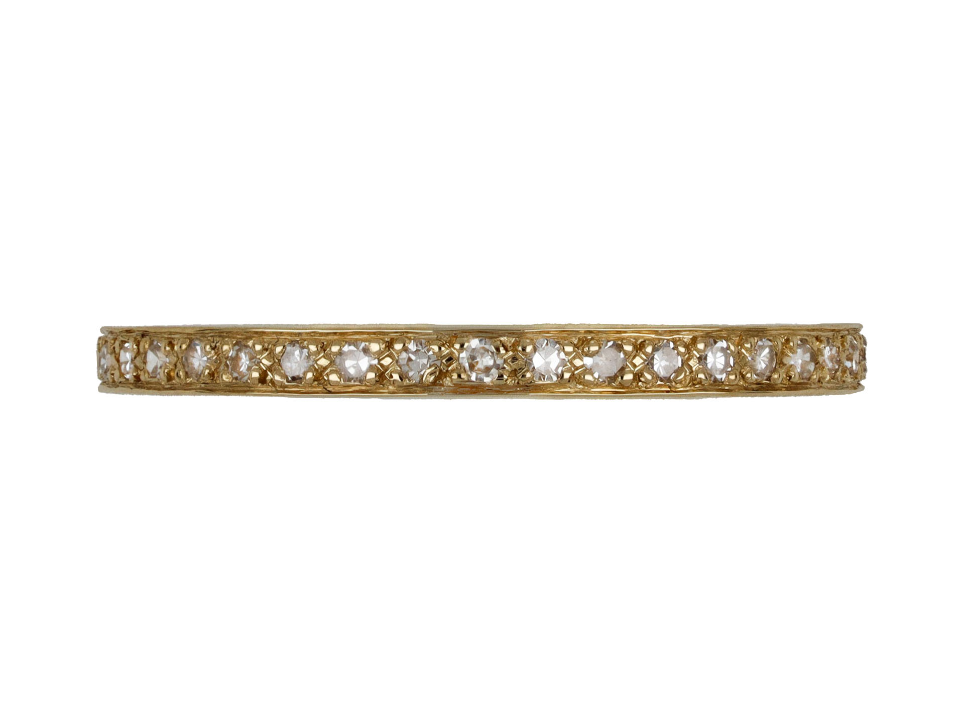 Diamond full eternity ring. Set with thirty-eight round eight-cut diamonds in open back grain settings with an approximate combined weight of 0.38 carats, to a full eternity band featuring polished edges, a solid gallery and square open backholing, approximately 1.9 mm in width. Tested 18 carat yellow gold, circa 1950.