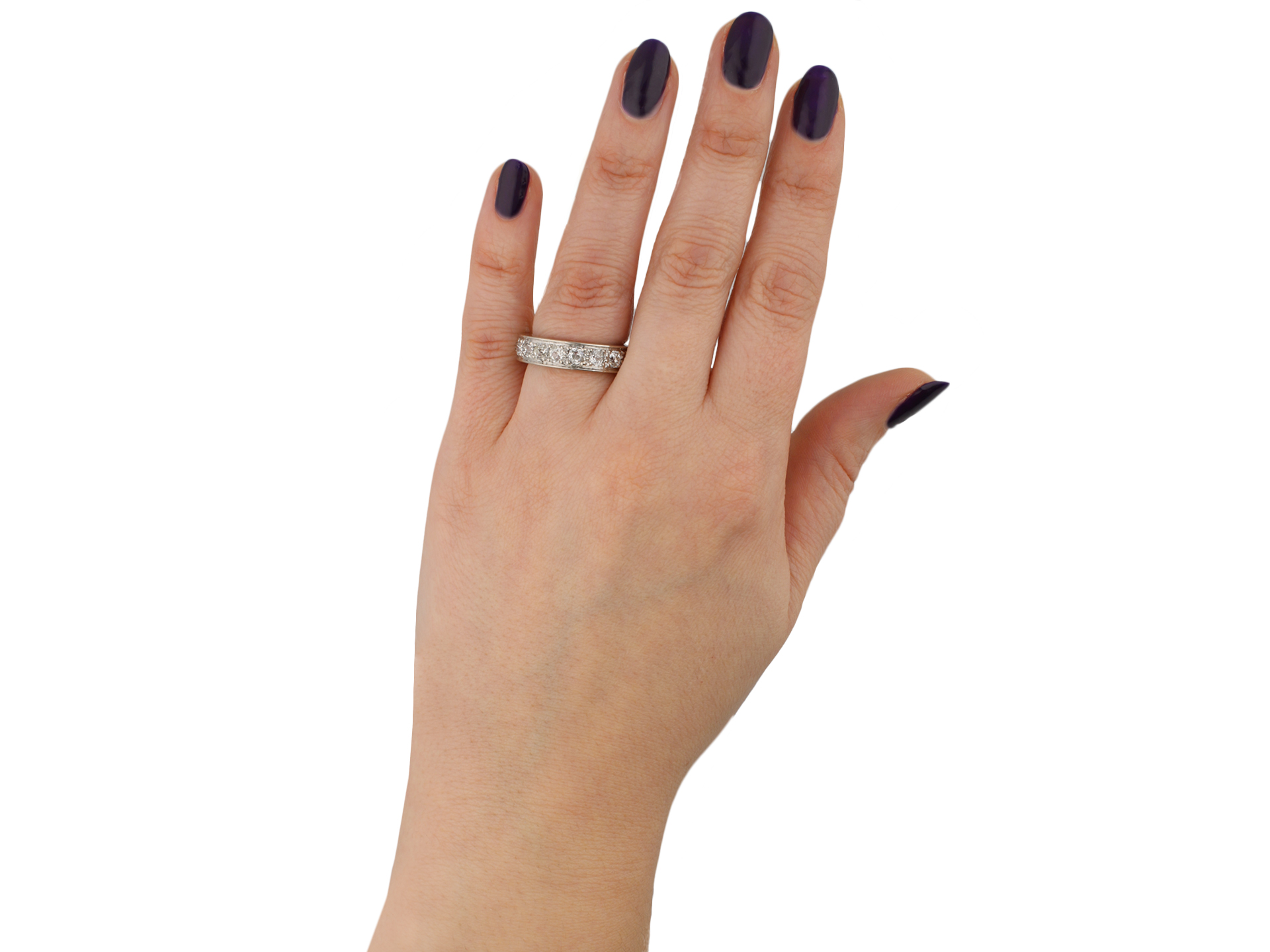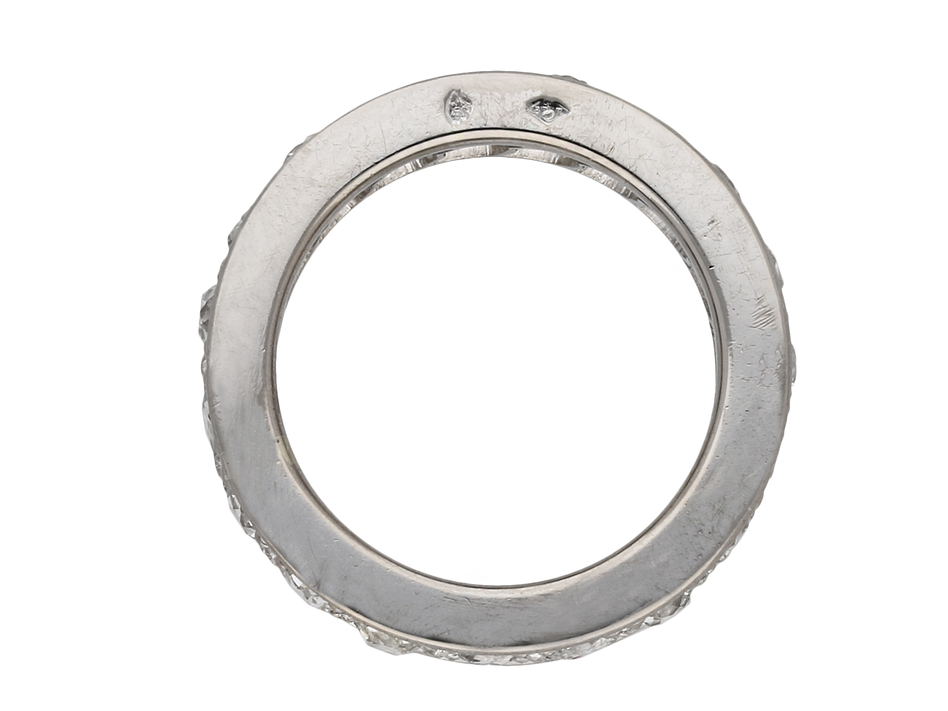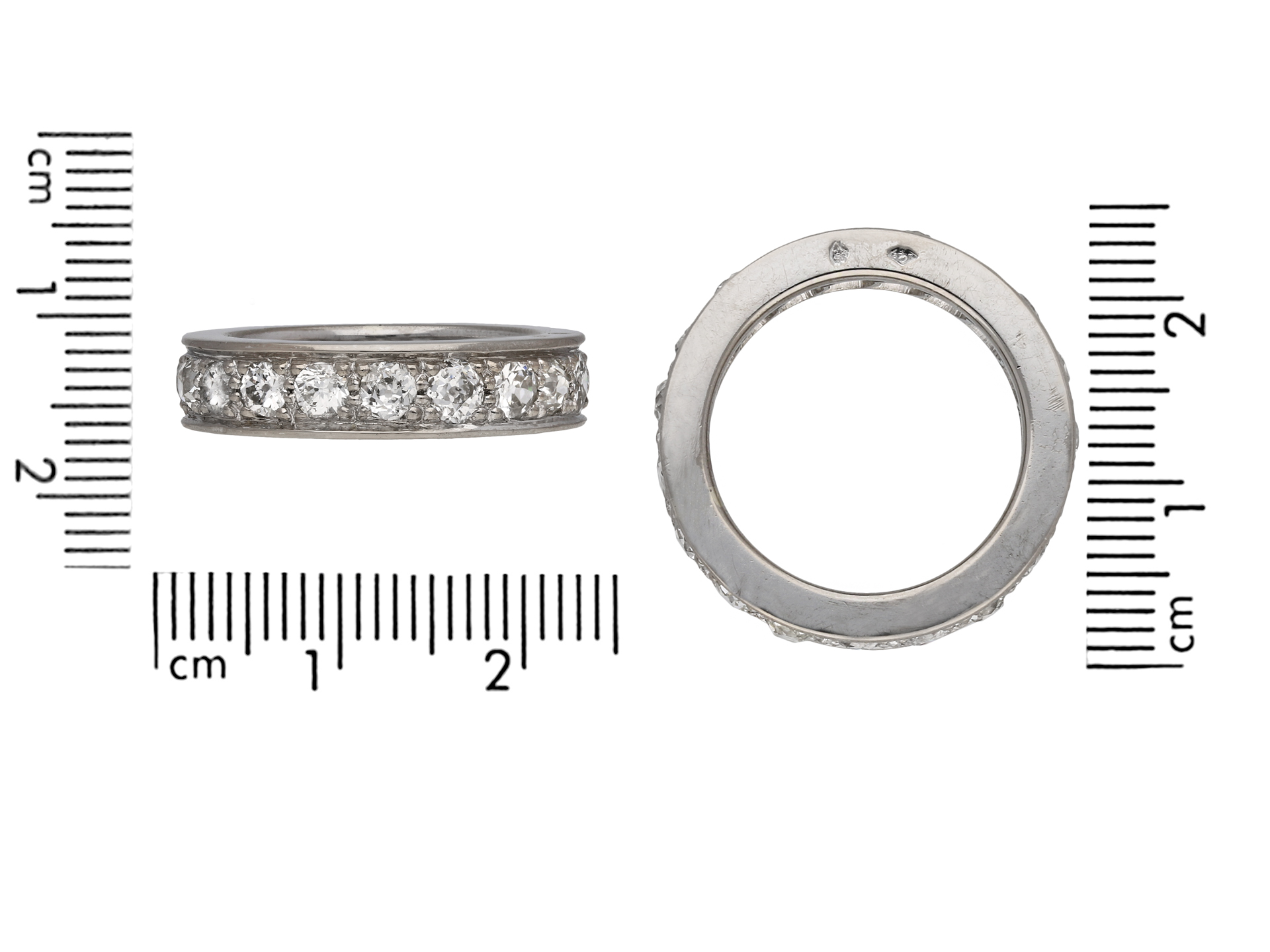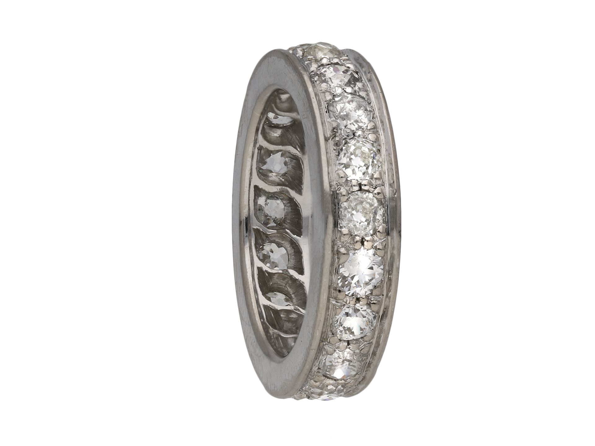 Diamond full eternity ring. Set with nineteen cushion shape old mine diamonds in open back grain settings with a combined approximate weight of 3.50 carats to a smoothly conforming full eternity band with polished edges and fancy shape open backholing, approximately 5 mm in width. Marked 18 carat white gold, maker's mark 'BT', French, circa 1950.