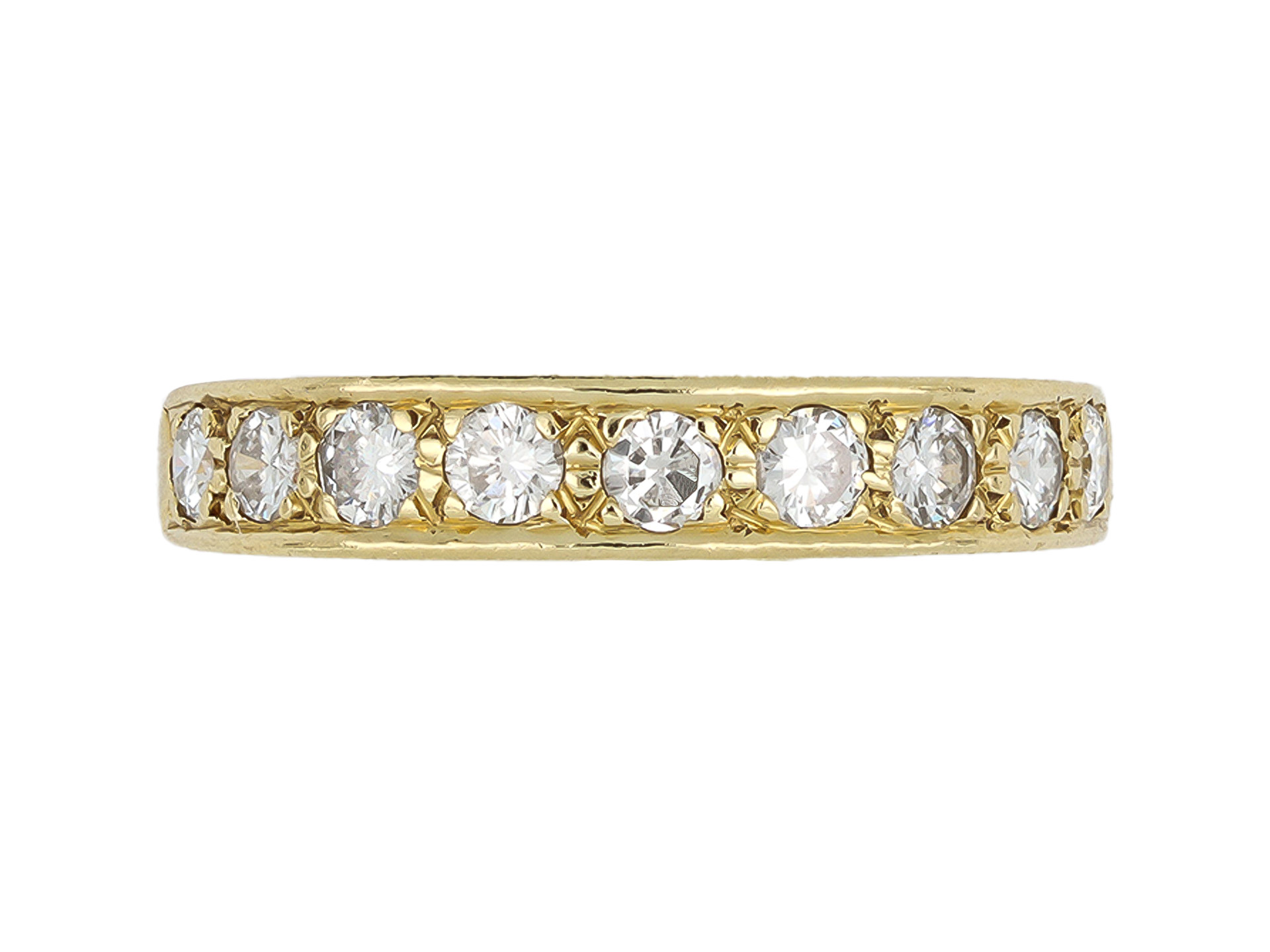 Diamond half eternity ring. Set with nine round brilliant cut diamonds in open back grain settings with a combined approximate weight of 0.90 carats, to an elegant half eternity ring featuring polished edges and square open backholing, approximately 4mm in width. Marked 18 carat yellow gold, maker's mark 'EO', full hallmarks for London, English, 1974.