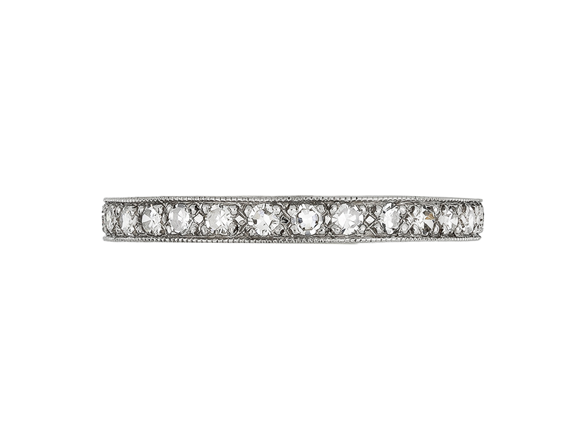 Diamond set eternity ring. Set with twenty-eight round eight cut diamonds in open back grain settings with an approximate combined weight of 0.85 carats, to a smoothly conforming eternity band with polished borders and intricately pierced rope open backholing, approximately 2.5mm in width. Tested platinum, circa 1925.