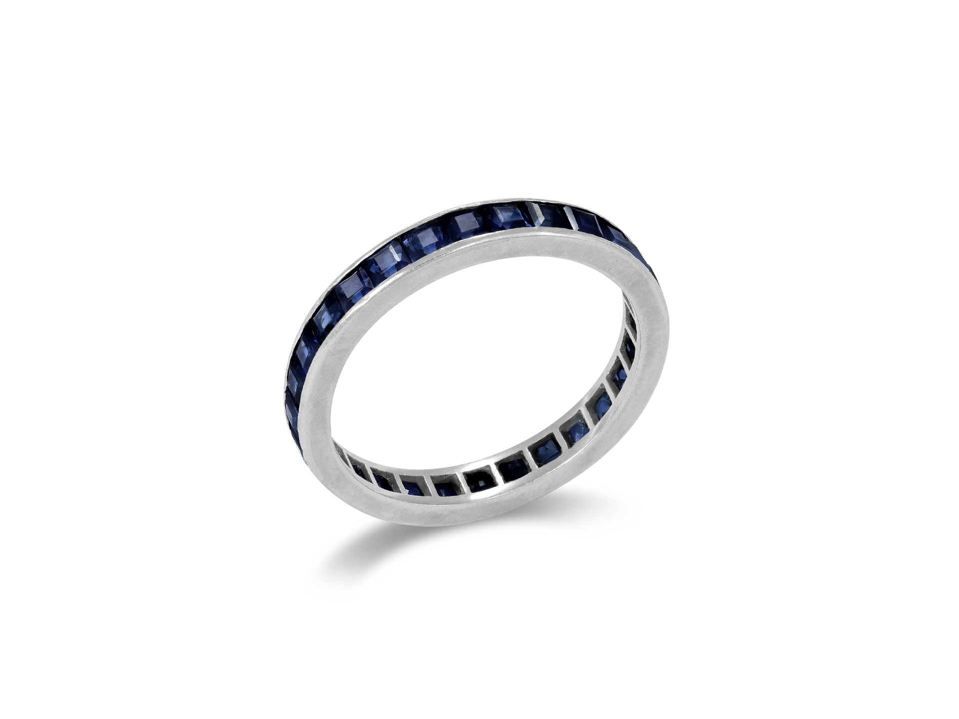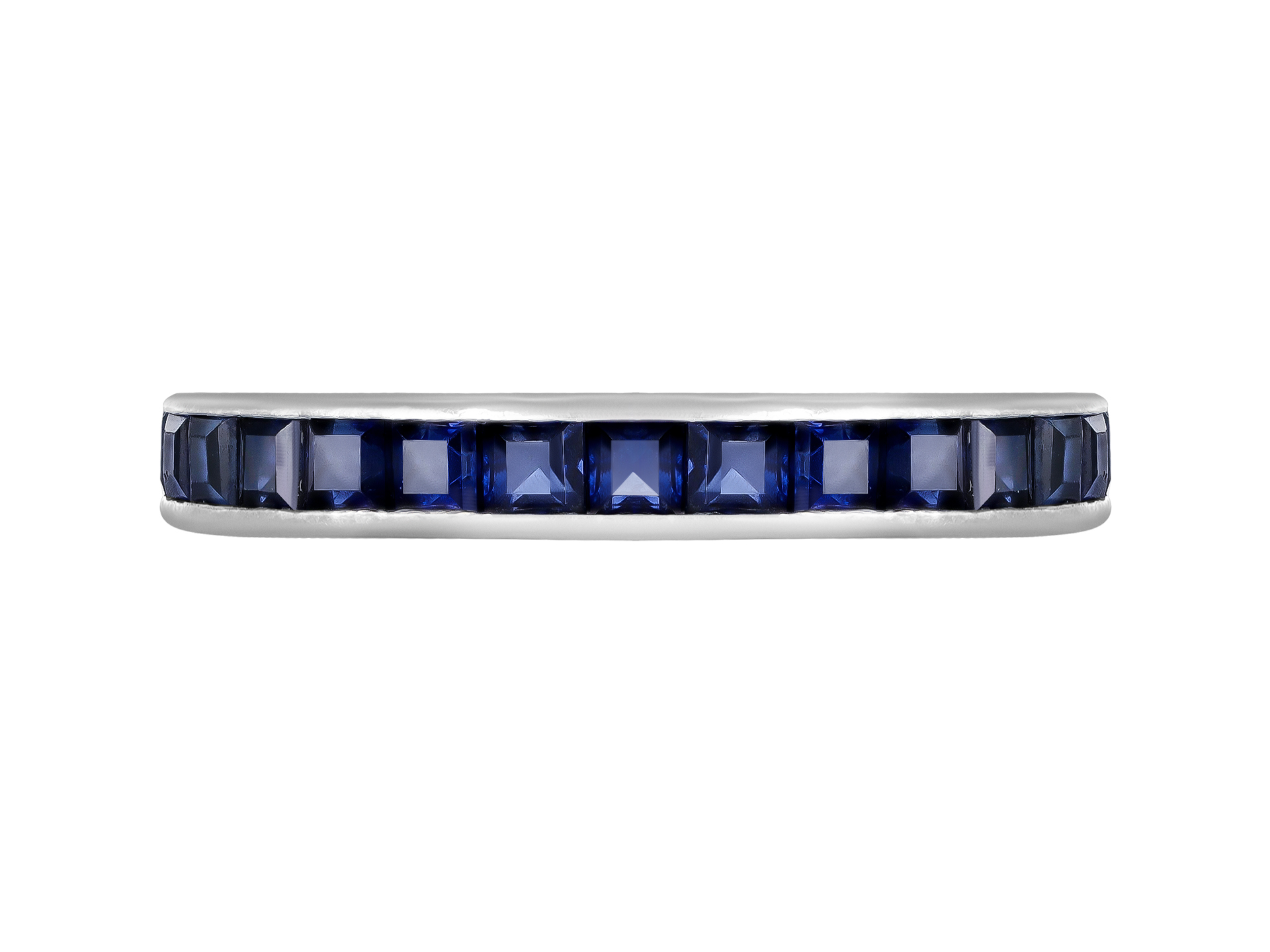 Sapphire full eternity ring. Set with twenty-eight square step-cut sapphires in open back channel settings with a combined approximate weight of 1.70 carats, to a smoothly conforming full eternity ring featuring polished edges and square open backholing, approximately 2.8mm in width. Tested platinum and iridium, American, circa 1920.