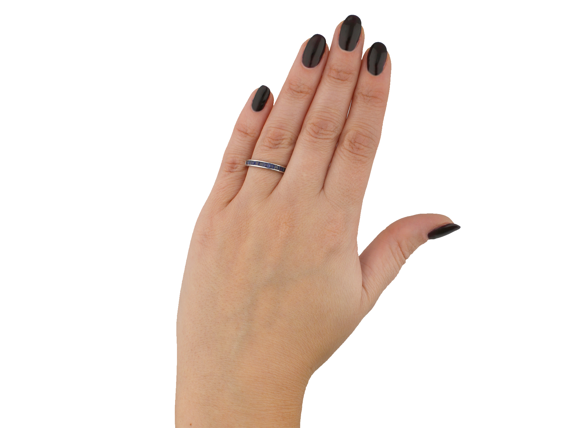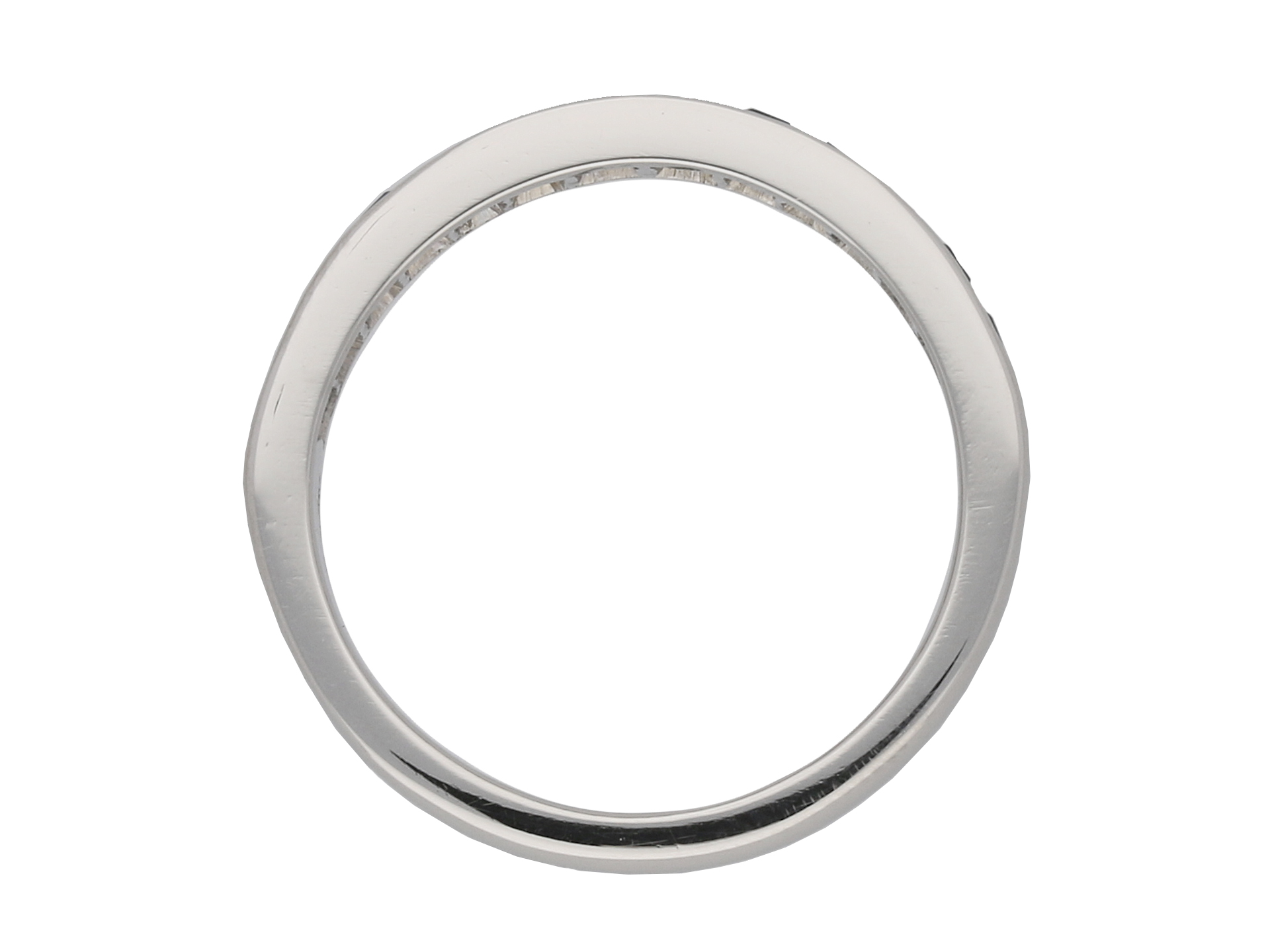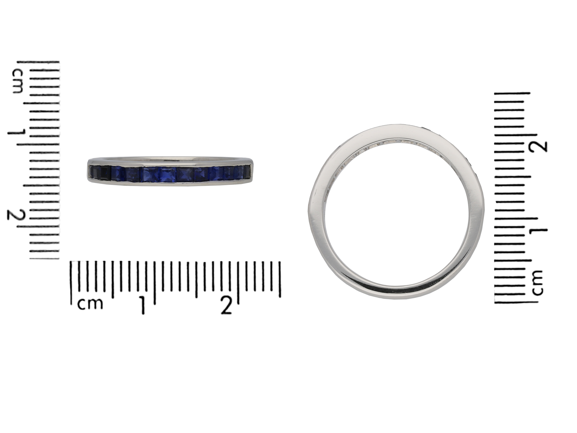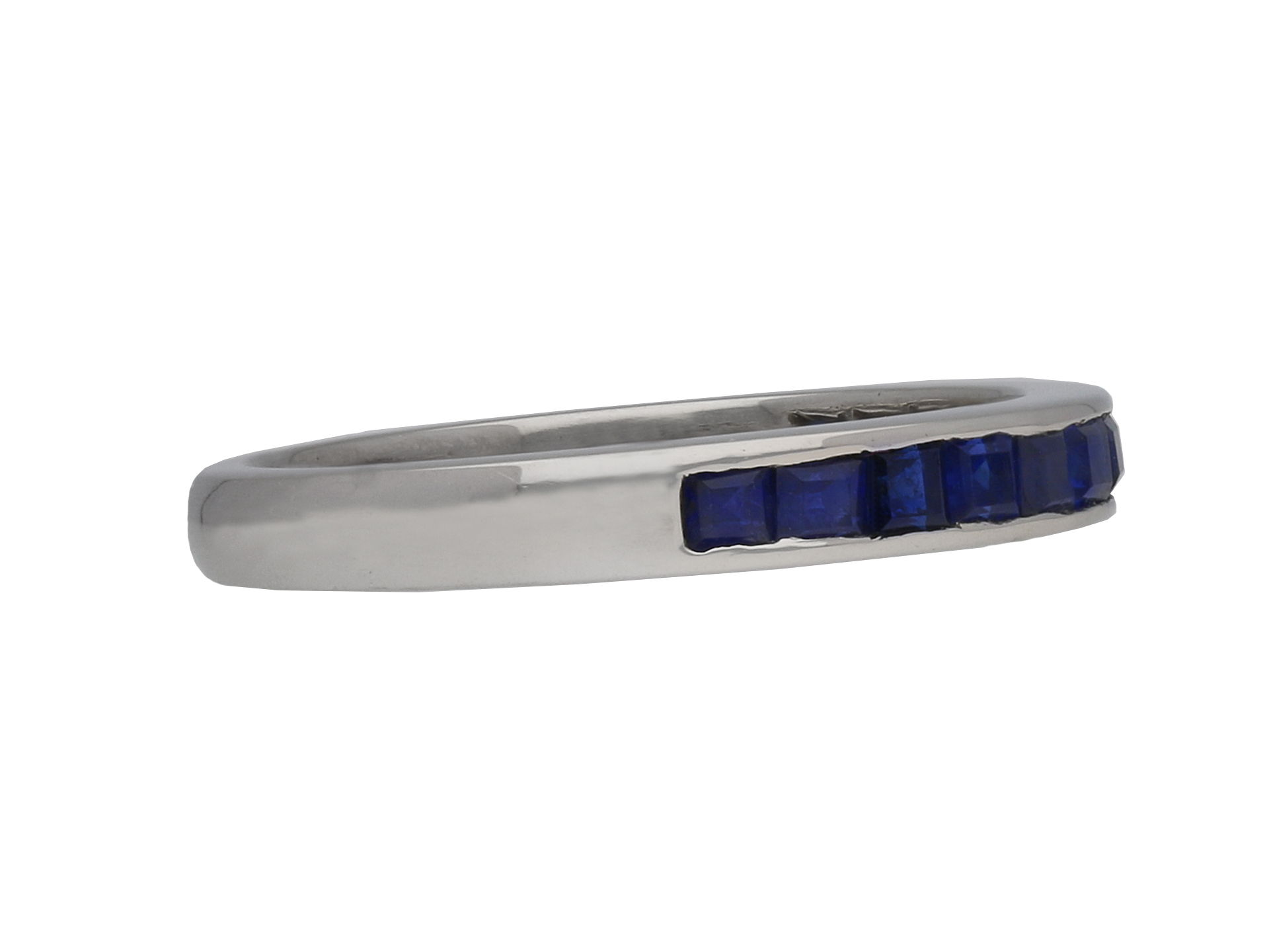 Vintage half eternity sapphire ring. Horizontally set with thirteen square step cut natural unehanced sapphires in open back channel settings with a combined approximate weight of 0.78 carats, to a smoothly conforming half eternity band with polished borders and square open backholing, flanked by slightly trumpeting shoulders which flow through to a solid tapering D-shape shank. Marked platinum, circa 1950.