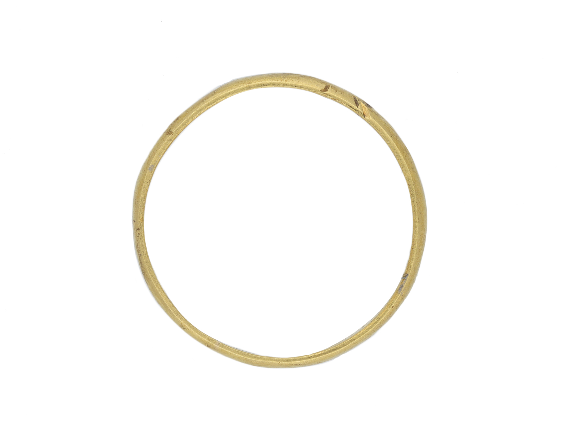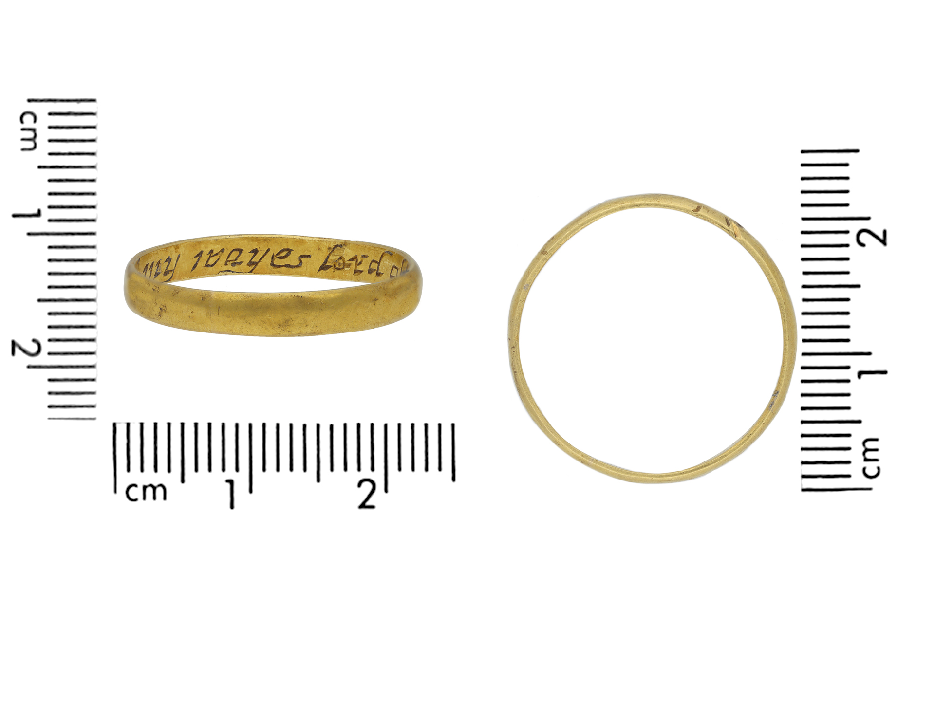 Gold posy ring 'Direct my wayes Lord all my dayes'. A yellow gold half round band, interior engraved in italic script 'Direct my wayes Lord all my dayes', approximately 3.1mm in width. Tested yellow gold, approxiamtely 3.46 grams in weight, maker's mark 'CB', late 18th century.