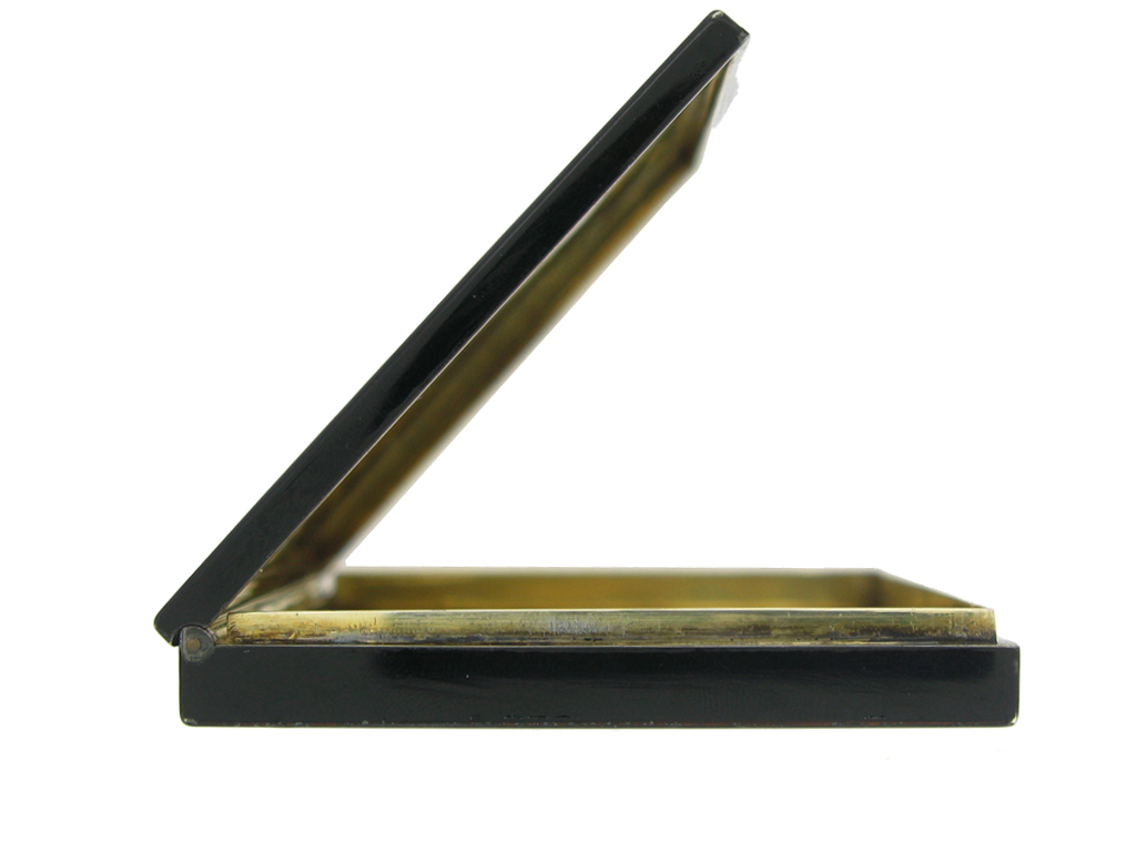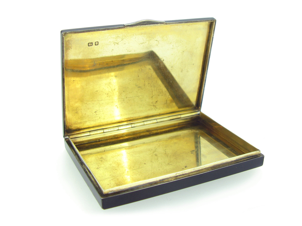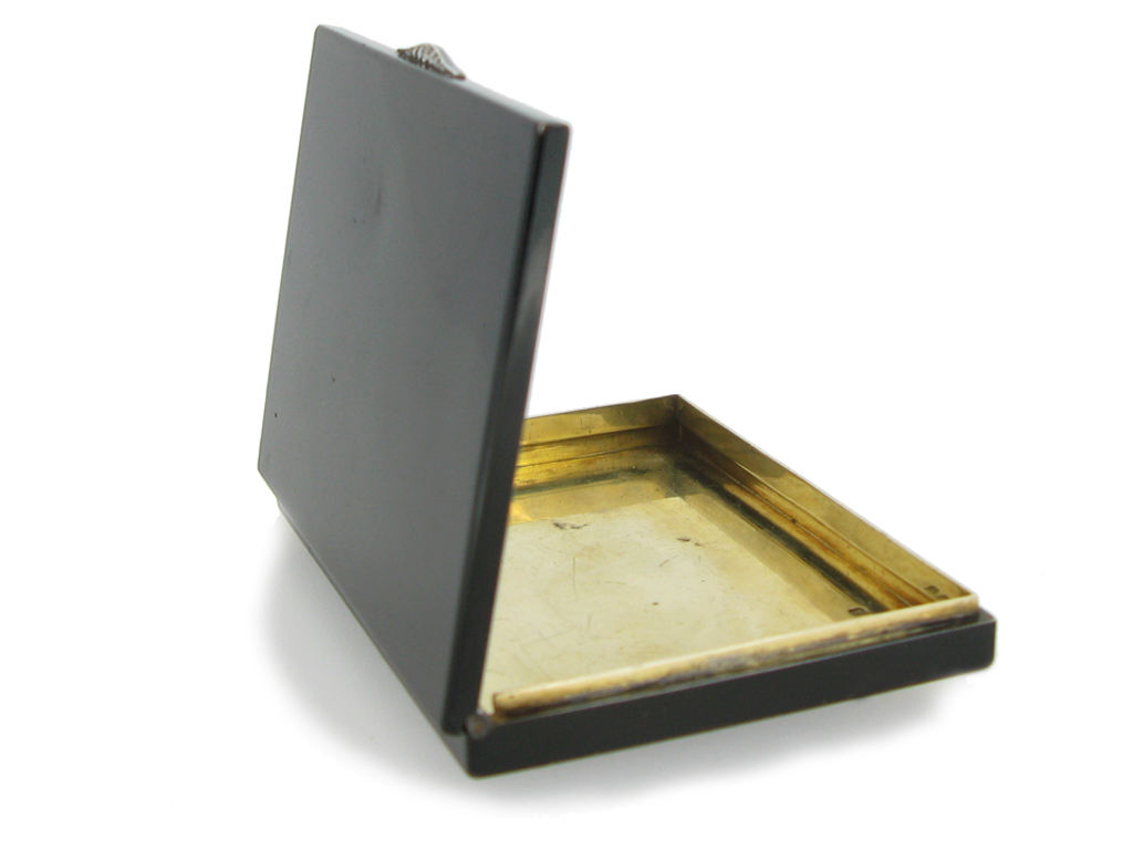 Cartier London black enamel and diamond set card case. A silver gilt and black enamel rectangular card case with hinged lid and diamond set latch, latch composed of seven graduating round old single cut diamonds with a combined weight of 0.10 carats and two round rose cut diamonds with a combined weight of 0.05 carats. Total approximate diamond weight of 0.15 carats, approximate dimensions of 8.3cm length, 6cm width and 0.9cm depth, weight approximately 105g. Tested silver gilt, maker's mark 'Cartier London', with full assay marks, approximately 105g in weight, circa 1936.