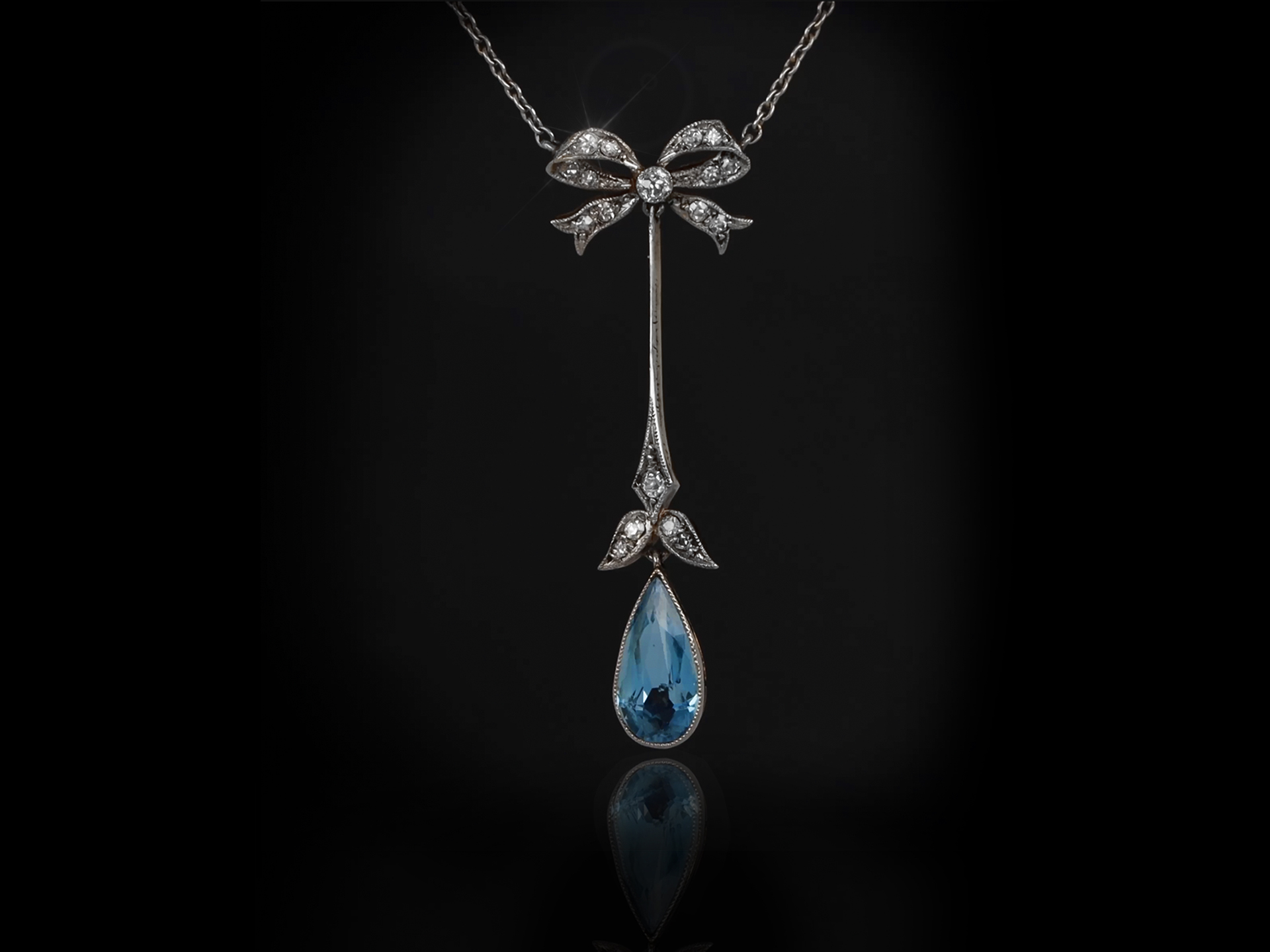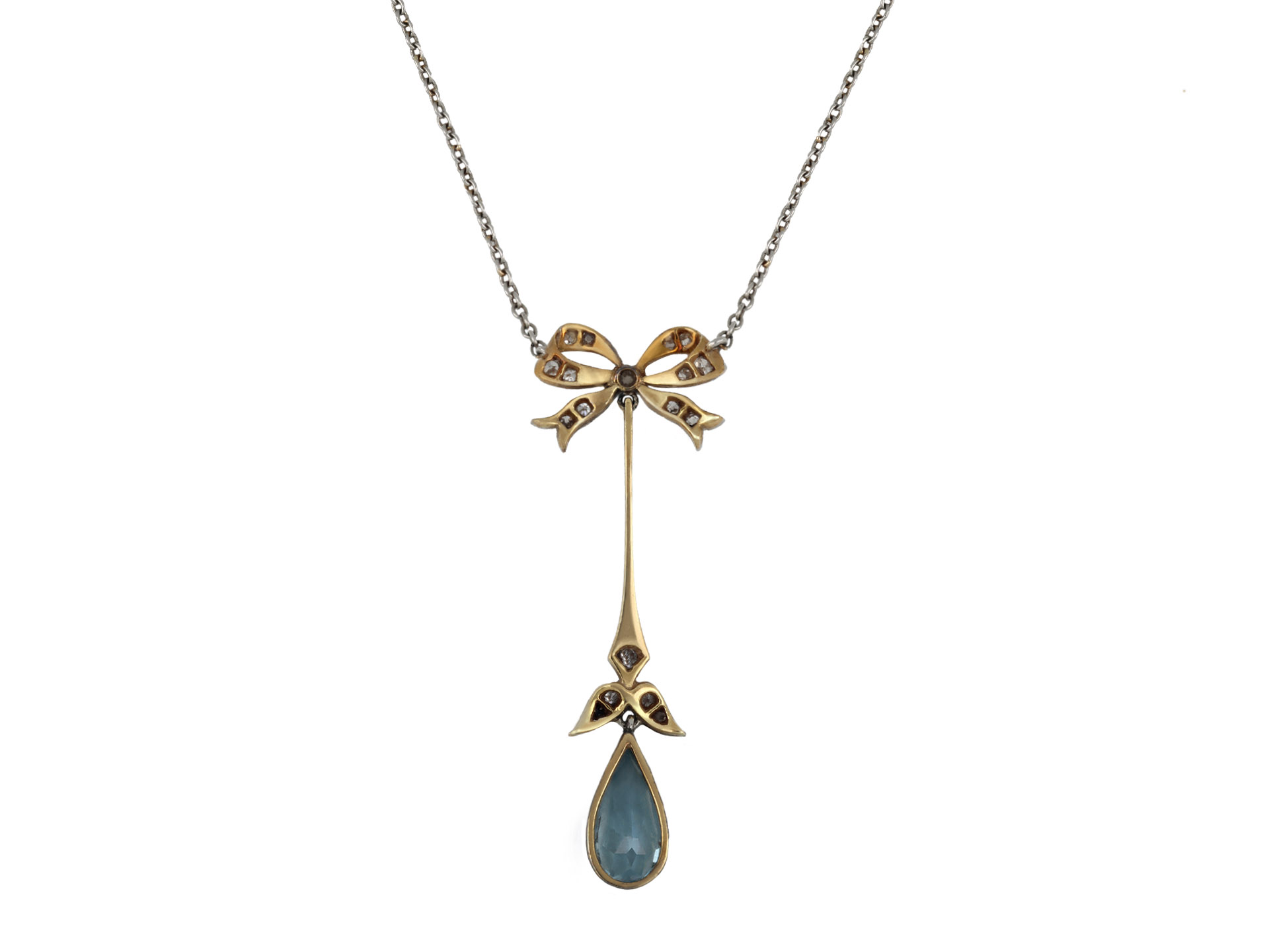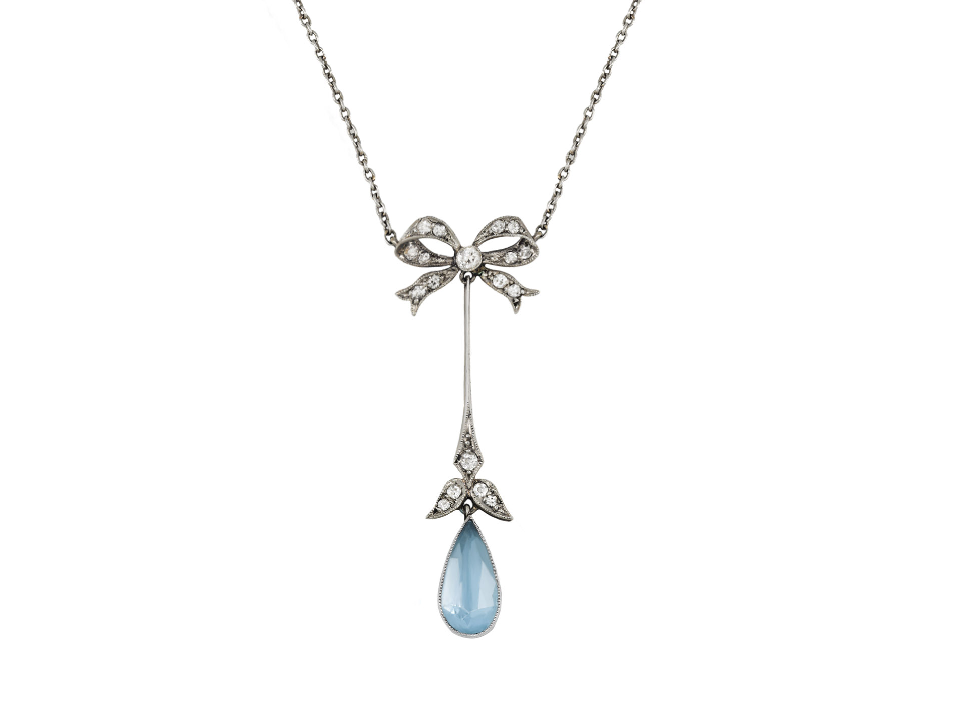 Edwardian aquamarine and diamond drop necklace. Set with a drop shape old cut natural aquamarine in an open back rubover setting with an approximate weight of 1.10 carats, further set with two cushion shape old mine diamonds in open back grain and rubover settings with an approximate combined weight of 0.07 carats, and decorated with sixteen round eight cut diamonds in open back grain settings with a combined weight of 0.22 carats. The total approximate diamond weight is 0.29 carats, to an elegant drop pendant design, flowing with movement, featuring a bow motif and millegrain edging throughout, a linear pierced gallery and fancy shape open backholing, attached to top with a fine trace chain with c-clasp and safety chain, pendant approximately 4cm in length, chain approximately 14 inches in length. Tested yellow gold and platinum, chain tested platinum, circa 1910.