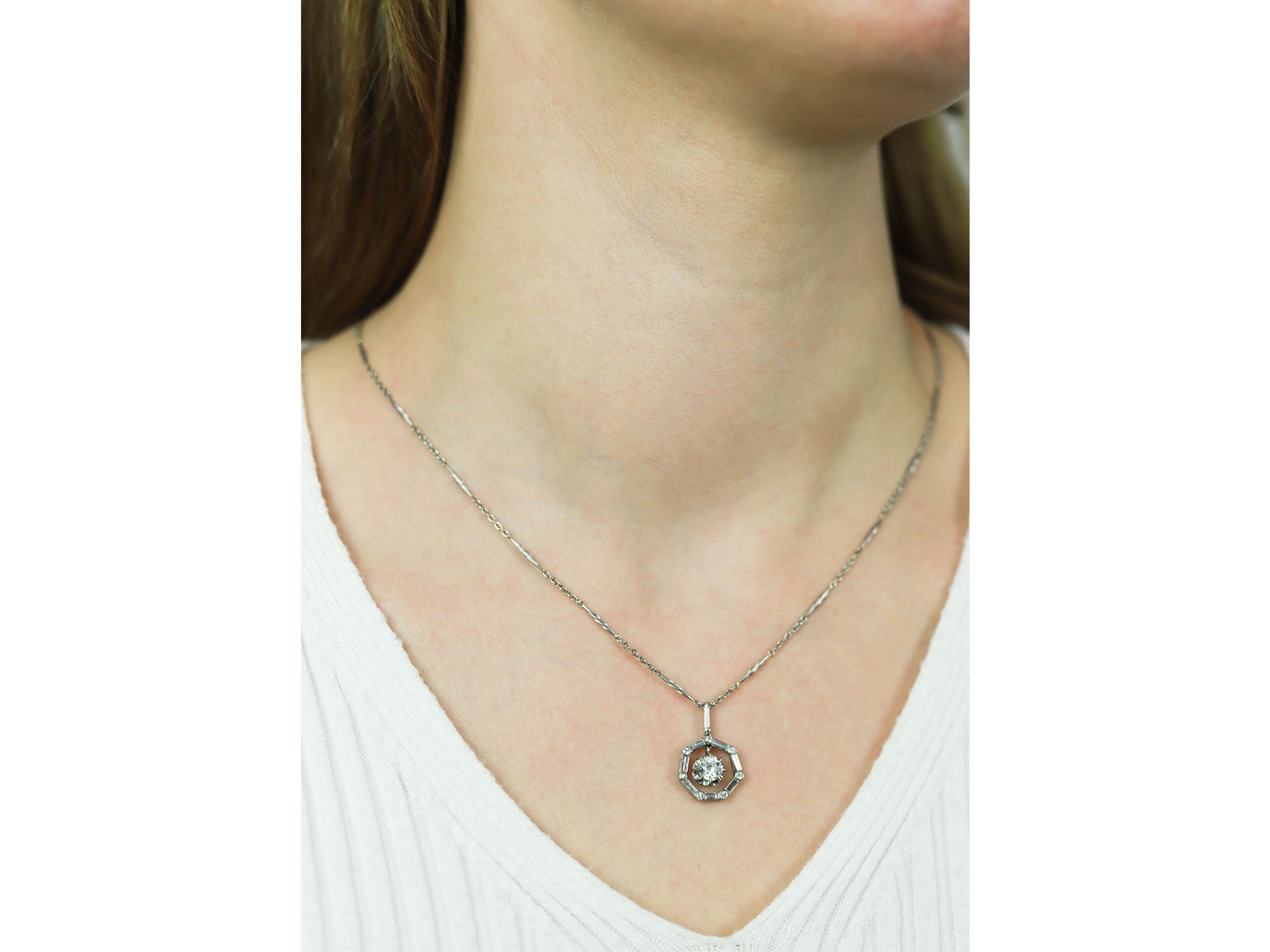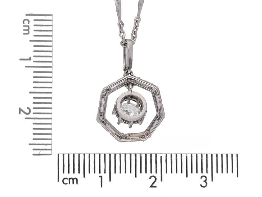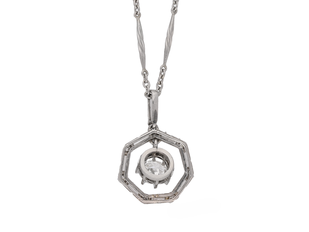 Art Deco diamond pendant. Set to centre with a round old cut diamond in an open back French solitaire setting with a weight of 0.55 carats, encircled by a single row of rectangular baguette cut diamonds and further set to the loop in open back half rubover settings, all eight with a combined weight of 0.60 carats, alternated by seven round old single cut diamonds in open back rubover settings with a combined weight of 0.10 carats. The total approximate diamond weight is 1.25 carats, to an octagonal cluster pendant with articulated links, flowing with movement, and intricate piercing work throughout, threaded with an 18" platinum chain with elegant twist bars and circular links, to secure C-clasp fitting. Tested platinum, French control mark, circa 1935.