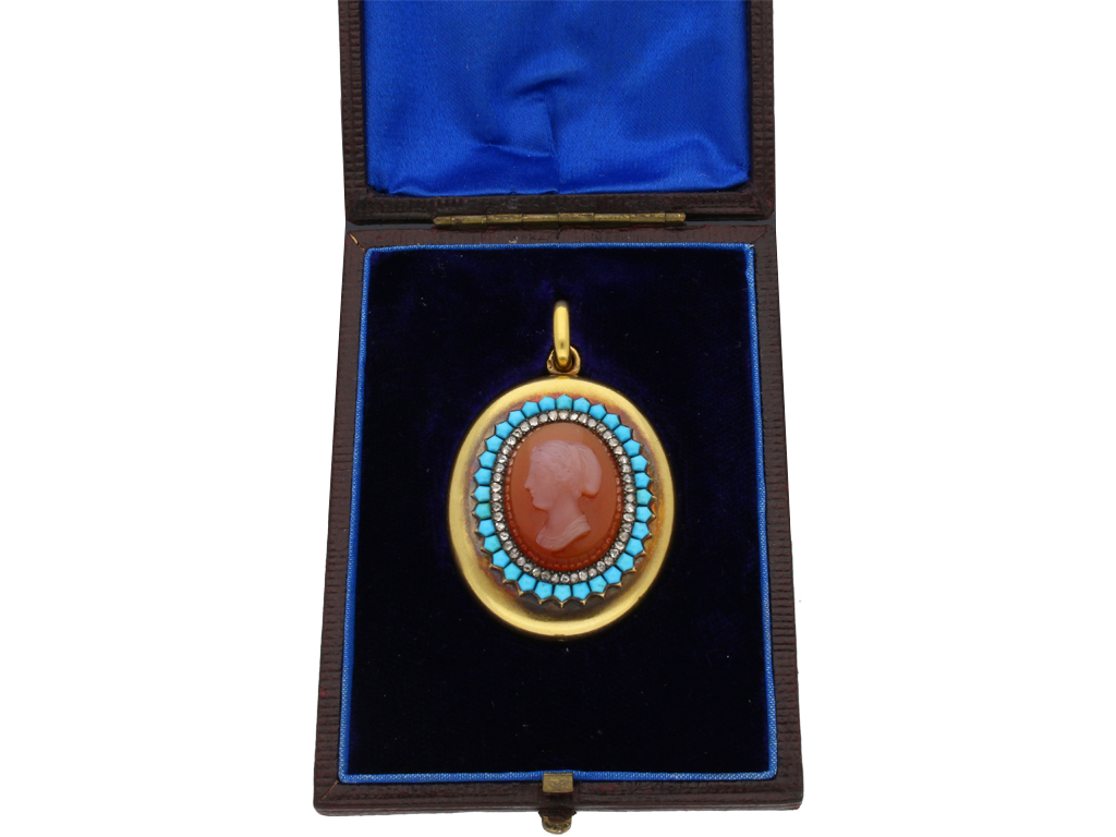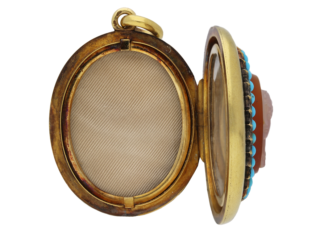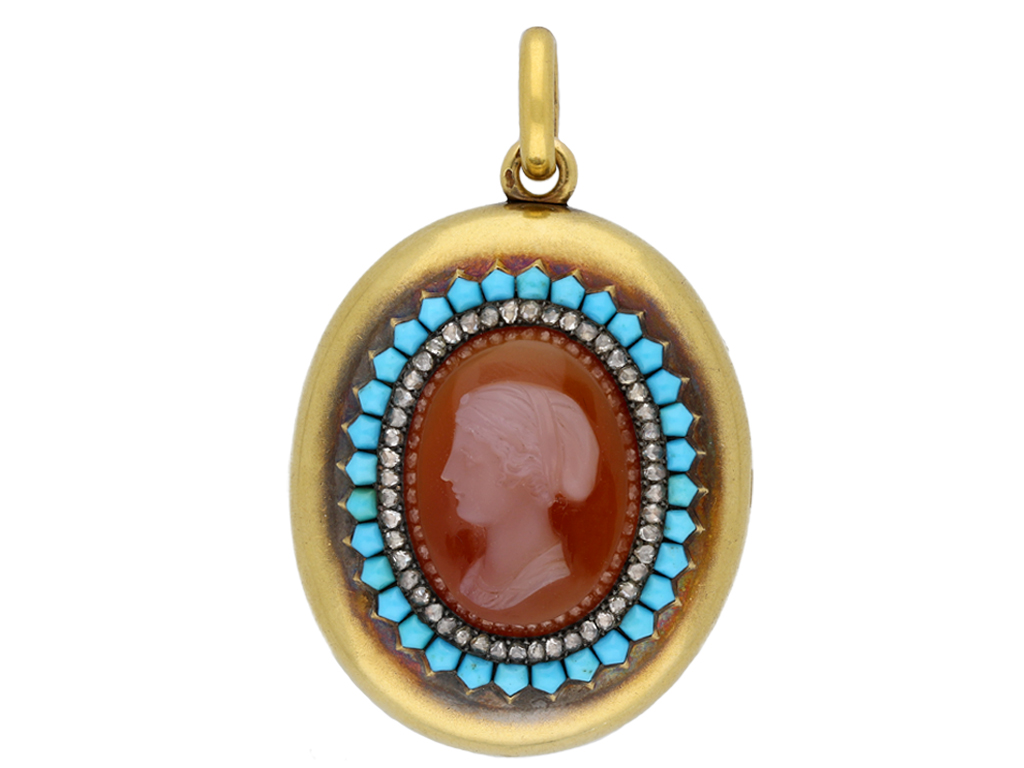 Cameo locket. Set to centre with an oval cornelian, carved in relief to depict the profile of a young lady, encircled by forty eight rose cut diamonds in closed back grain settings with an approximate combined weight of 0.50 carats, surrounded by thirty two cabochon turquoise in closed back rubover settings with an approximate combined weight of 0.95 carats, to a framed oval cameo design, featuring a raised central plaque, decorative geometric edging and closed backholing, hinged to the left and opens to display two glass compartments, fitted to top with a secure oval bale. Tested 18 carat yellow gold, French, circa 1880, accompanied by a fitted box.