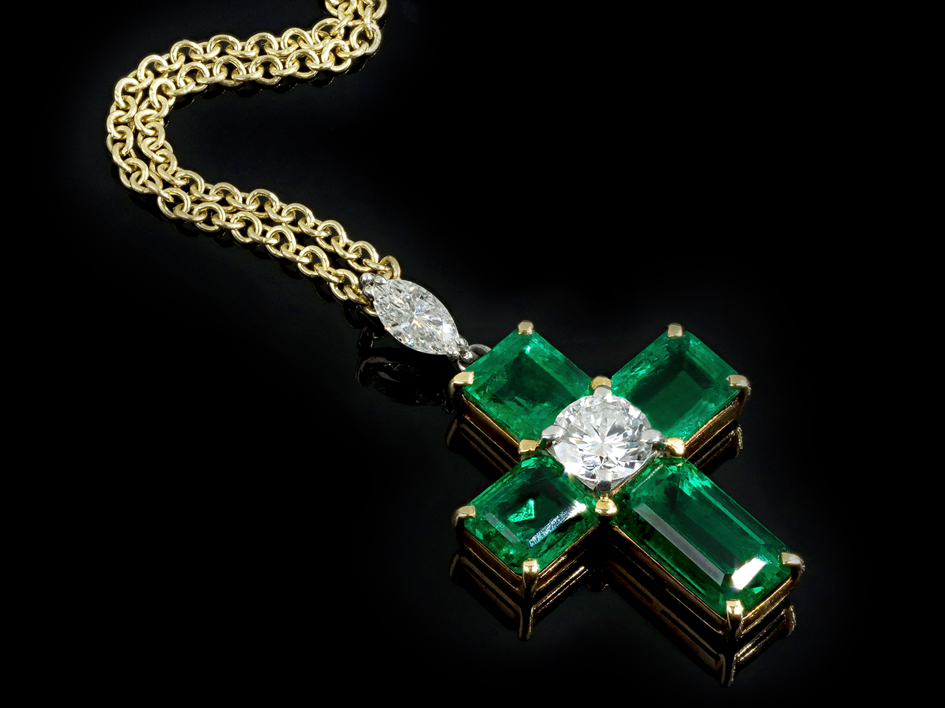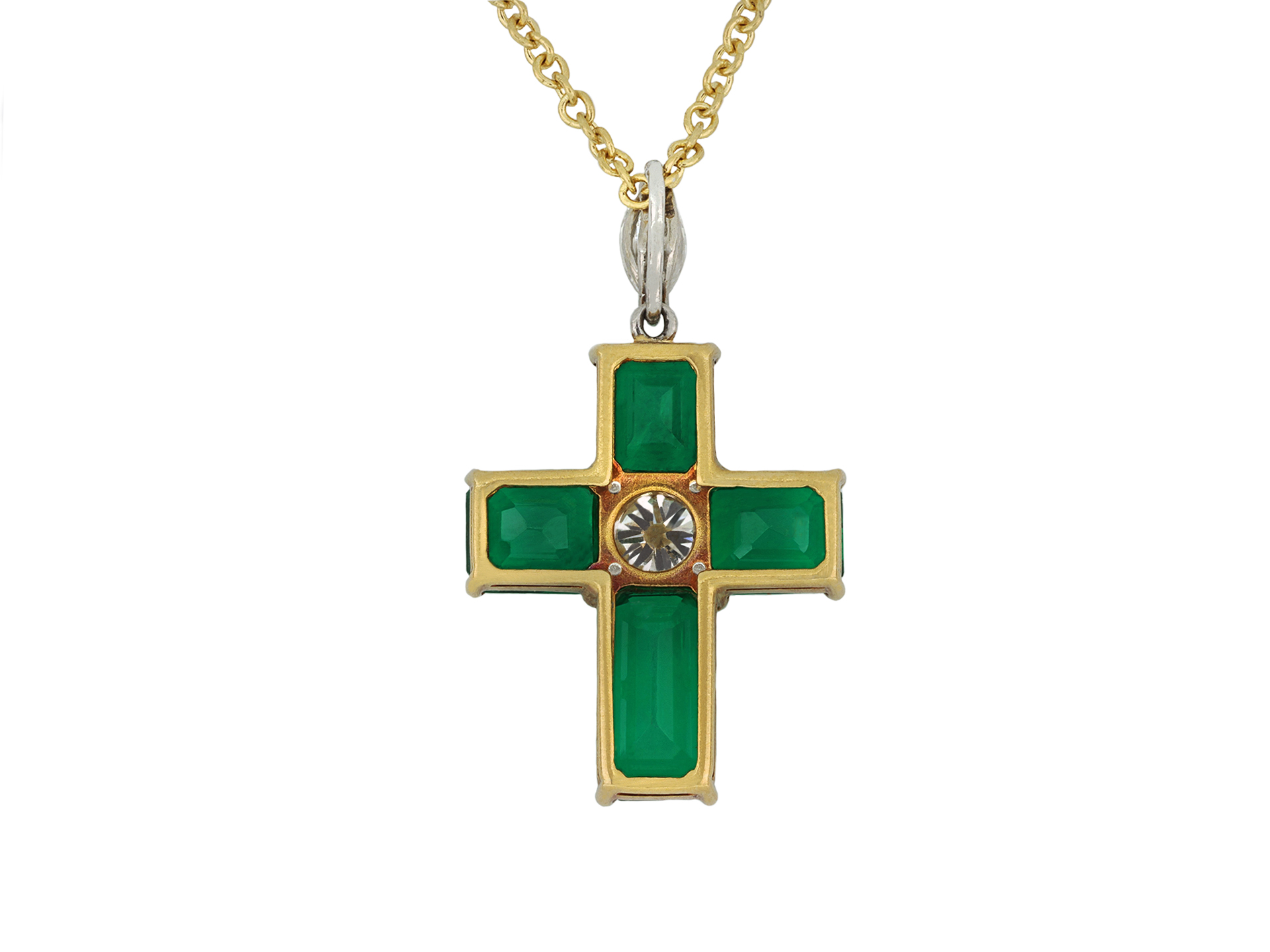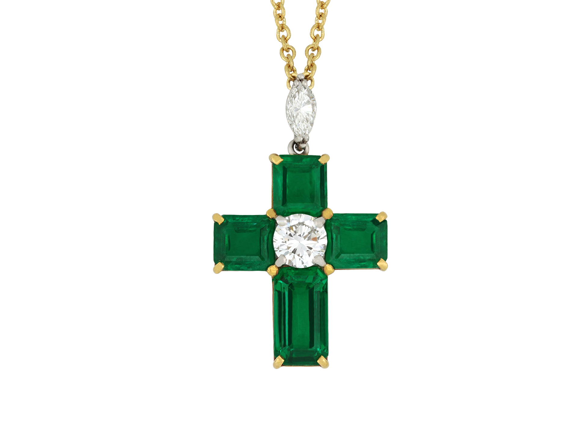 Colombian emerald and diamond cross pendant. Set to centre with a round transitional cut diamond in an open back claw setting with an approximate weight of 0.40 carats, flanked by four rectangular step-cut natural Colombian emeralds with minor clarity enhancement in open back claw settings with a combined approximate weight of 3.14 carats, suspended from a marquise shape brilliant cut diamond in an open back claw setting with an approximate weight of 0.20 carats. The total approximate diamond weight is 0.60 carats, to an elegant cross design featuring curving claws, a pierced linear gallery and open backholing, approximately 1.8cm in length, chain approximately 16" in length. Tested yellow gold and platinum, circa 1970, accompanied by Gubelin report #23070076. and SSEF report #141236.