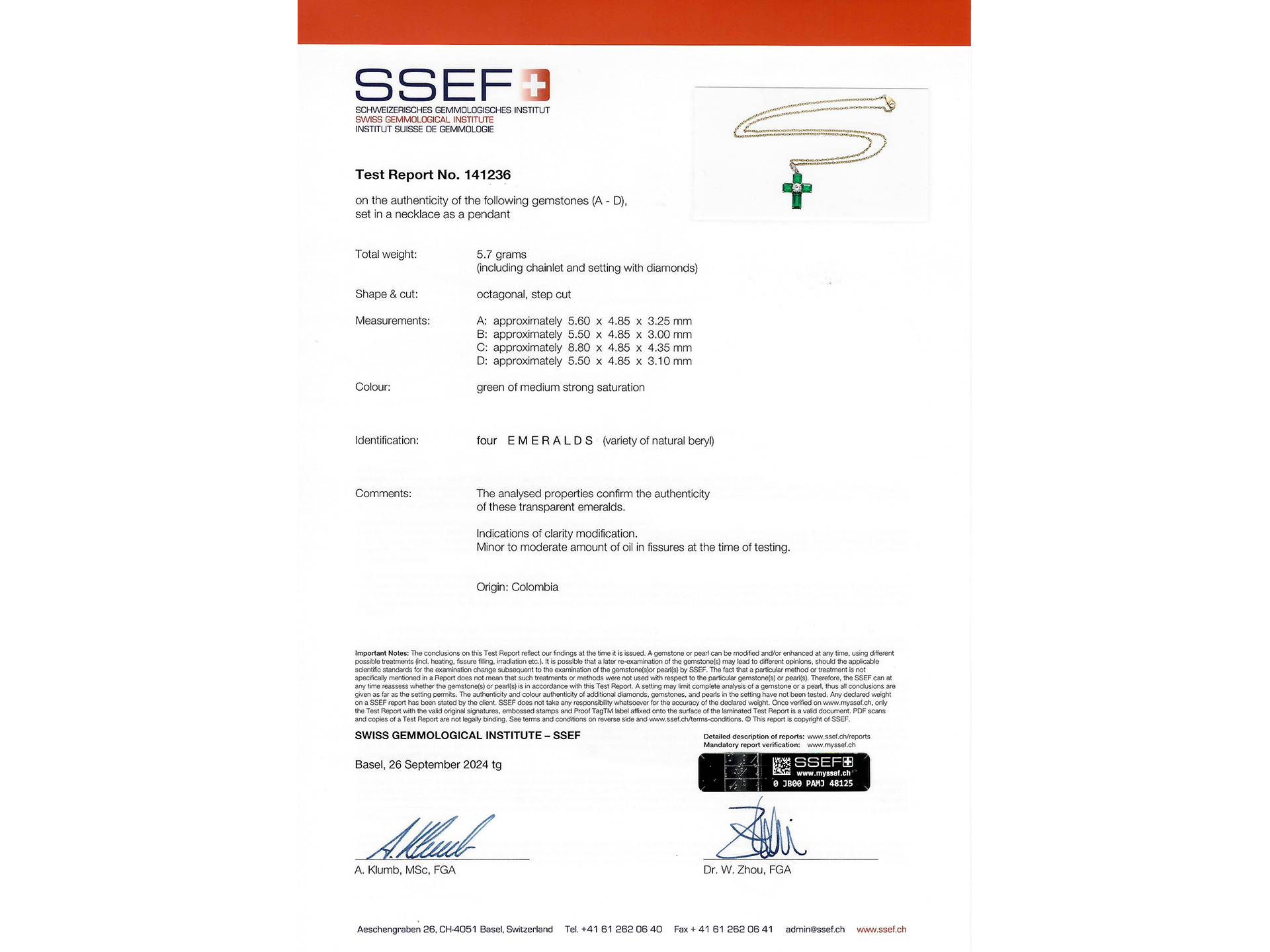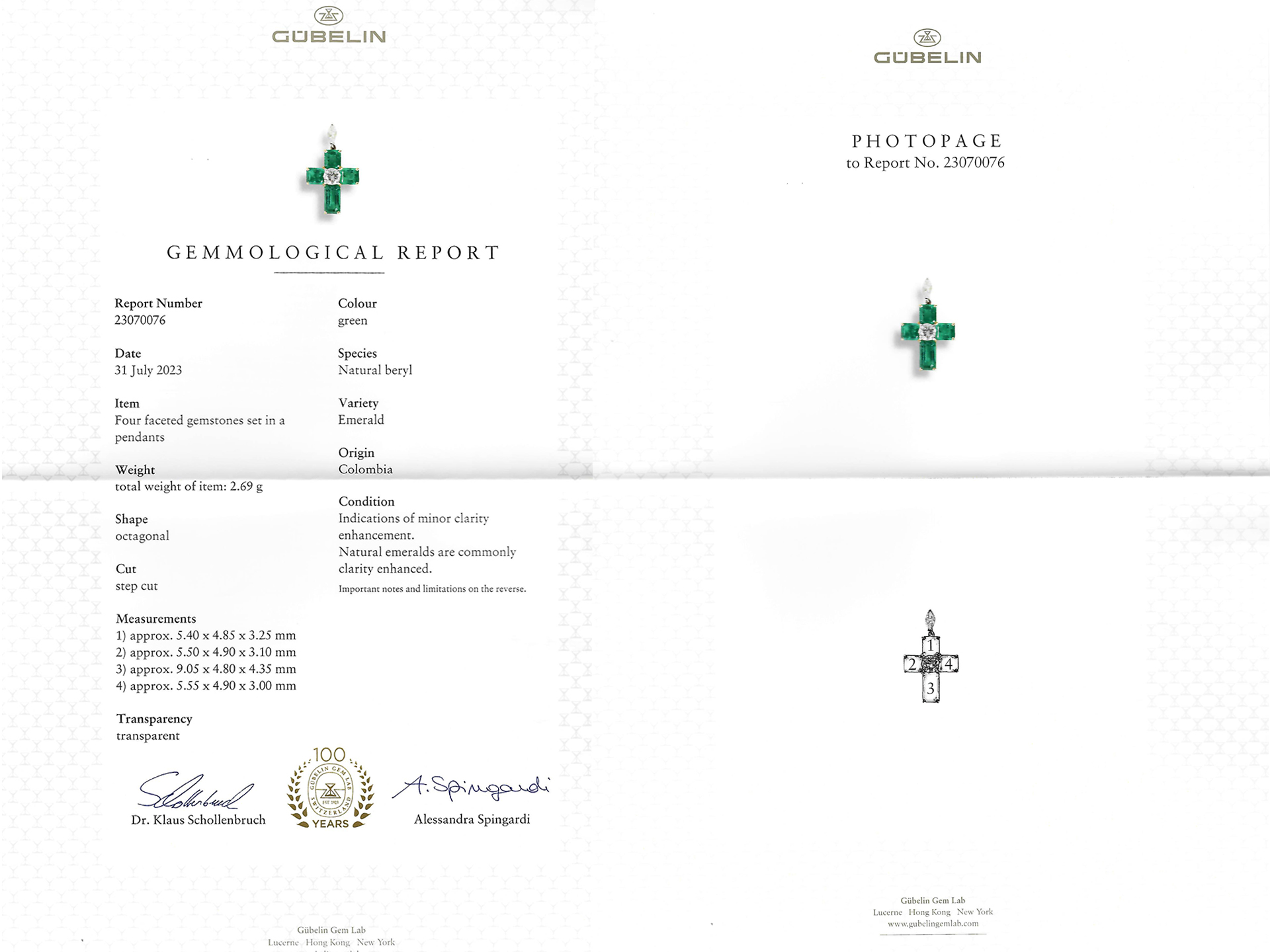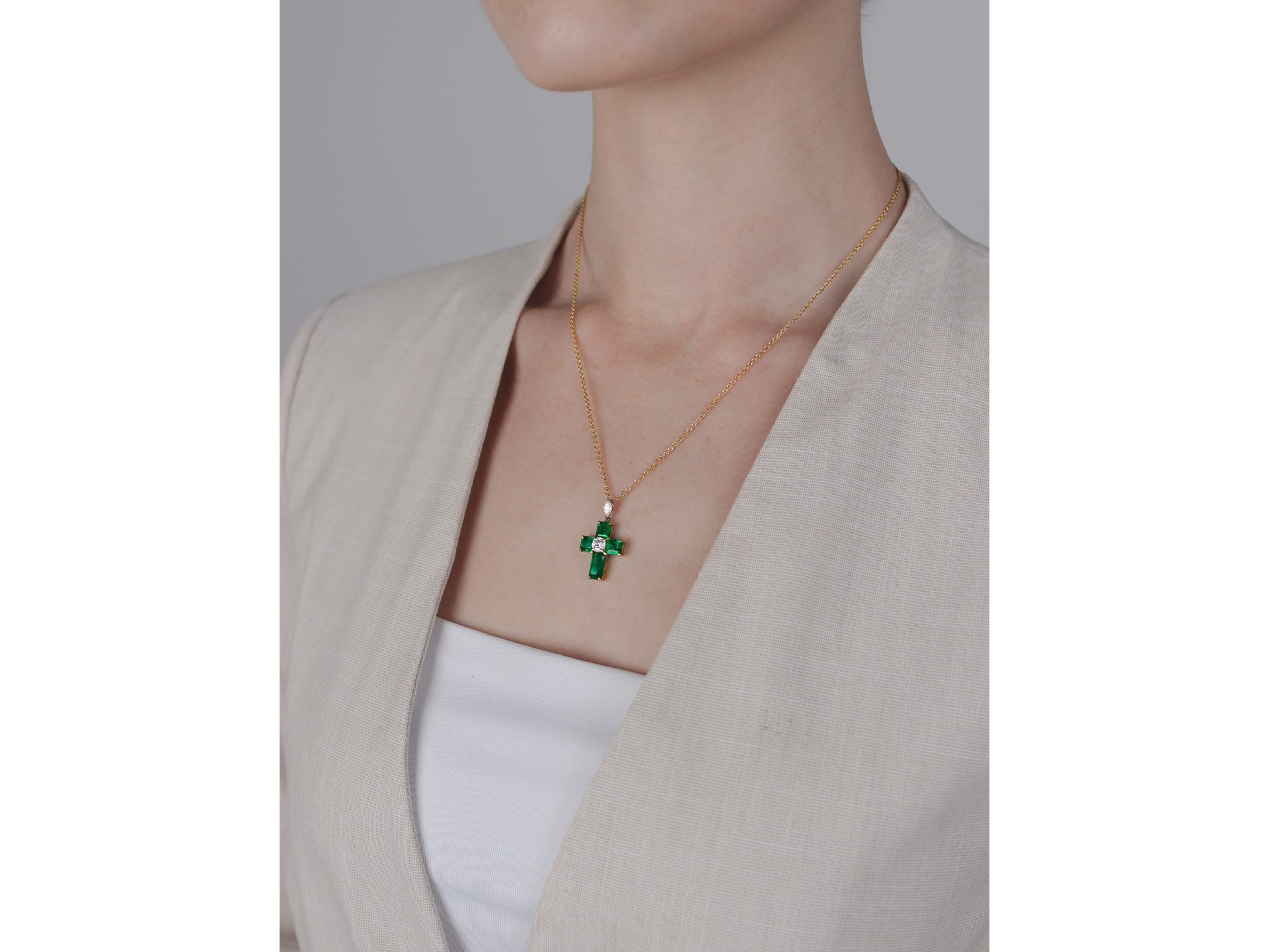 Colombian emerald and diamond cross pendant. Set to centre with a round transitional cut diamond in an open back claw setting with an approximate weight of 0.40 carats, flanked by four rectangular step-cut natural Colombian emeralds with minor clarity enhancement in open back claw settings with a combined approximate weight of 3.14 carats, suspended from a marquise shape brilliant cut diamond in an open back claw setting with an approximate weight of 0.20 carats. The total approximate diamond weight is 0.60 carats, to an elegant cross design featuring curving claws, a pierced linear gallery and open backholing, approximately 1.8cm in length, chain approximately 16" in length. Tested yellow gold and platinum, circa 1970, accompanied by Gubelin report #23070076. and SSEF report #141236.