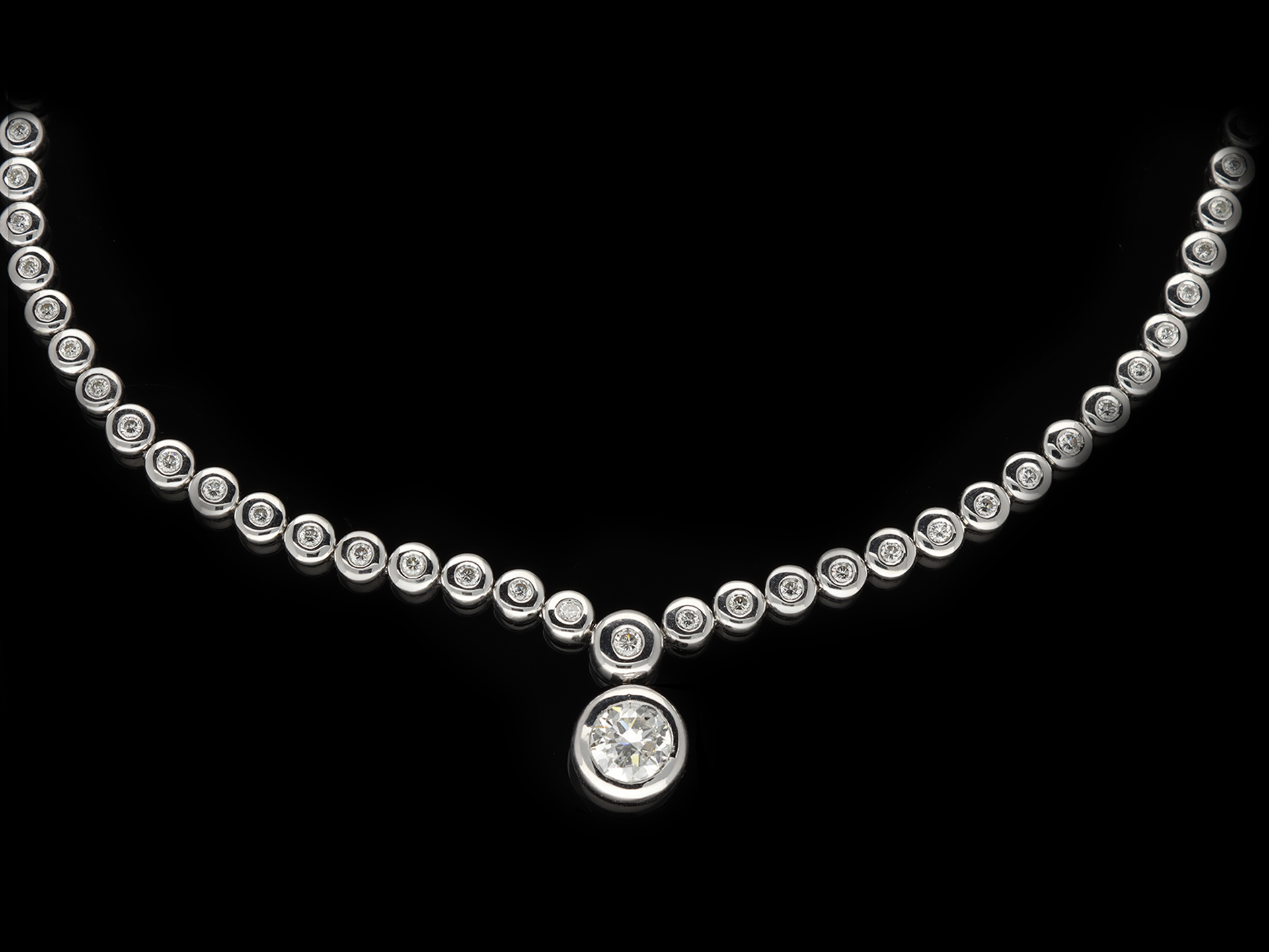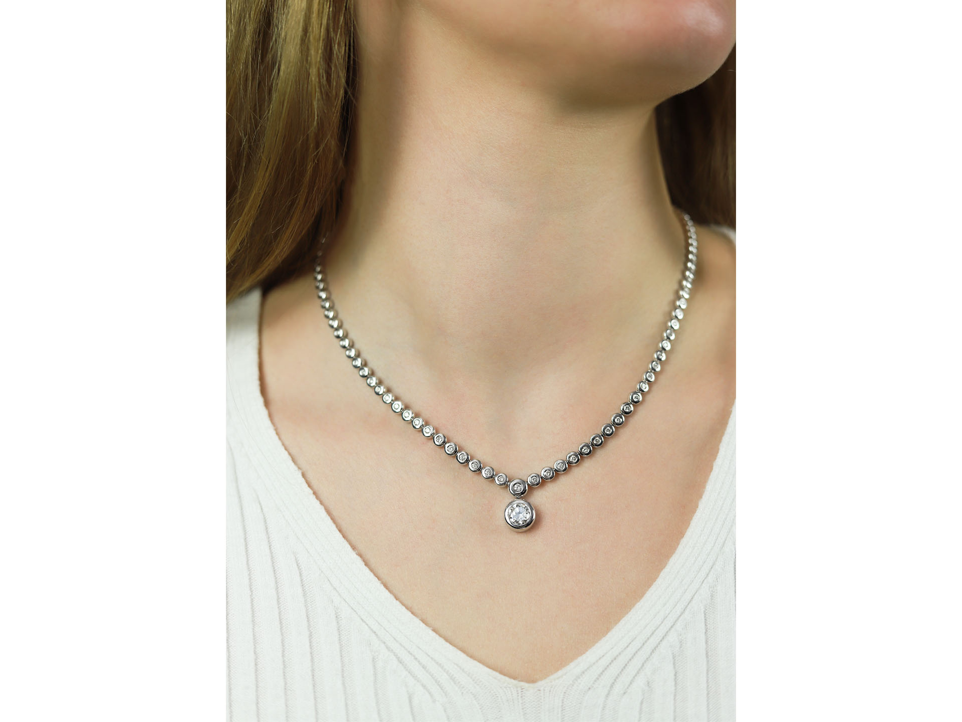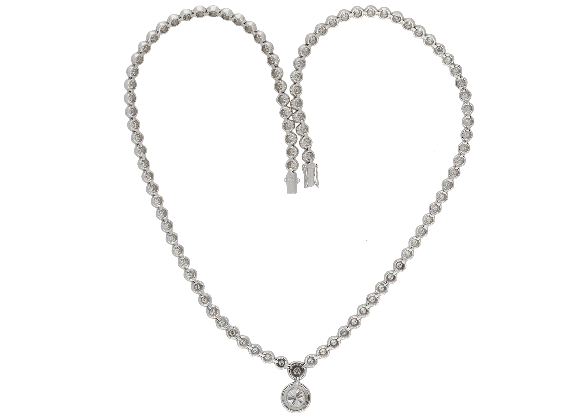 Diamond necklace. Set with a central round brilliant cut diamond in an open back rubover setting with a weight of 1.10 carat, suspended from a graduated row of ninety seven round brilliant cut diamonds in open back rubover settings with a combined weight of 4.00 carats. The total approximate diamond weight is 5.10 carats, separated by articulated links elegantly flowing with the neckline, fitted with a box clasp and two safety clips. Marked 18 carat white gold, circa 1990.