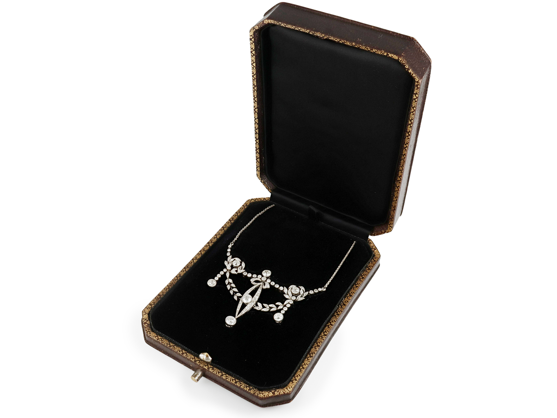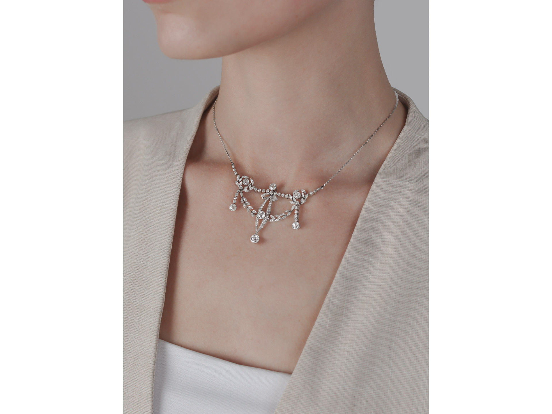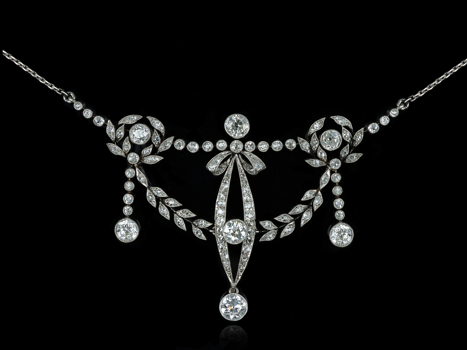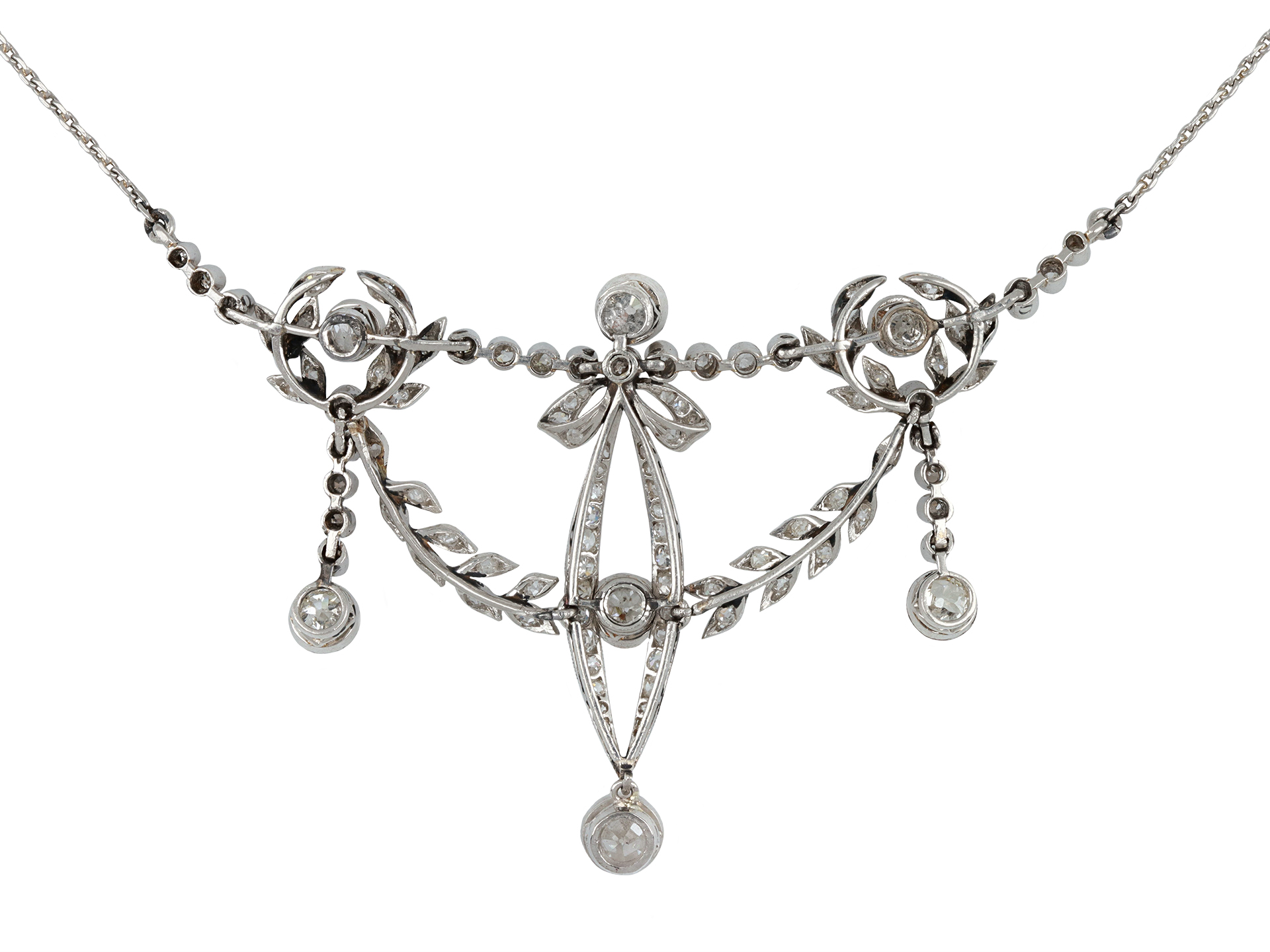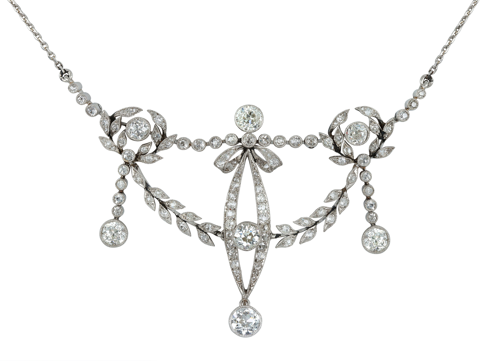 Edwardian diamond pendant. Set with seven round old cut diamonds in open back rubover settings with a combined approximate weight of 2.21 carats, adorned further with ninety-five mixed old cut diamonds in open back rubover and grain setting with a combined weight of 1.55 carats, further adorned with four round rose cut diamonds in open and closed back grain settings with a combined weight of 0.04 carats. The total approximate diamond weight is 3.80 carats, to an elegant articulated pendant, flowing with movement, featuring bow and foliate motifs, millegrain edging and open and closed backholing, fitted with a fine trace chain with a secure push clasp with safety catch, pendant approximately 4cm in length and chain approximately 15" in length. Pendant and chain tested platinum, clasp tested yellow gold, circa 1915.