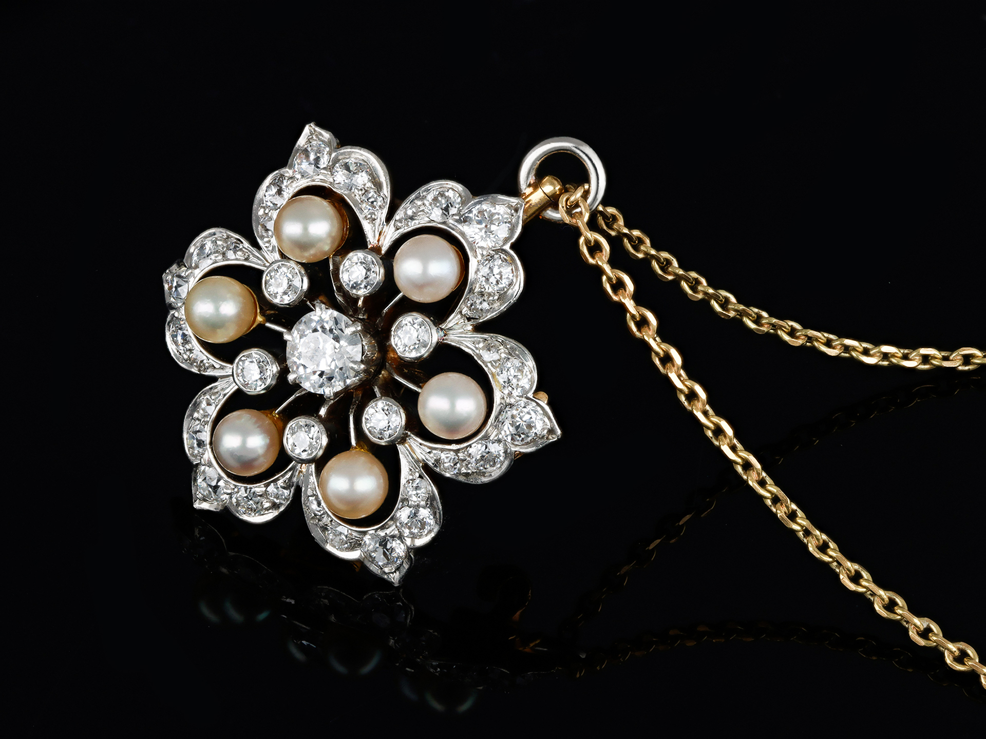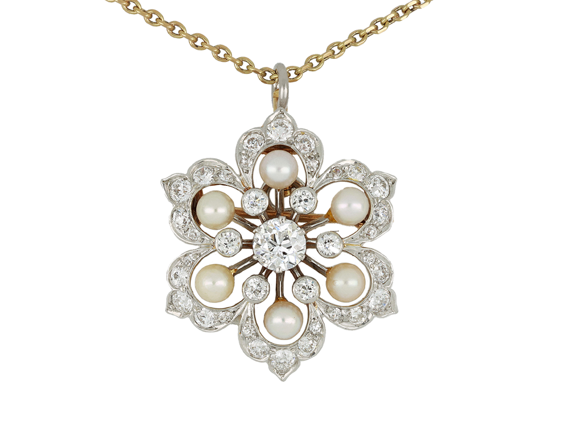 Edwardian pearl and diamond brooch/pendant, circa 1915.