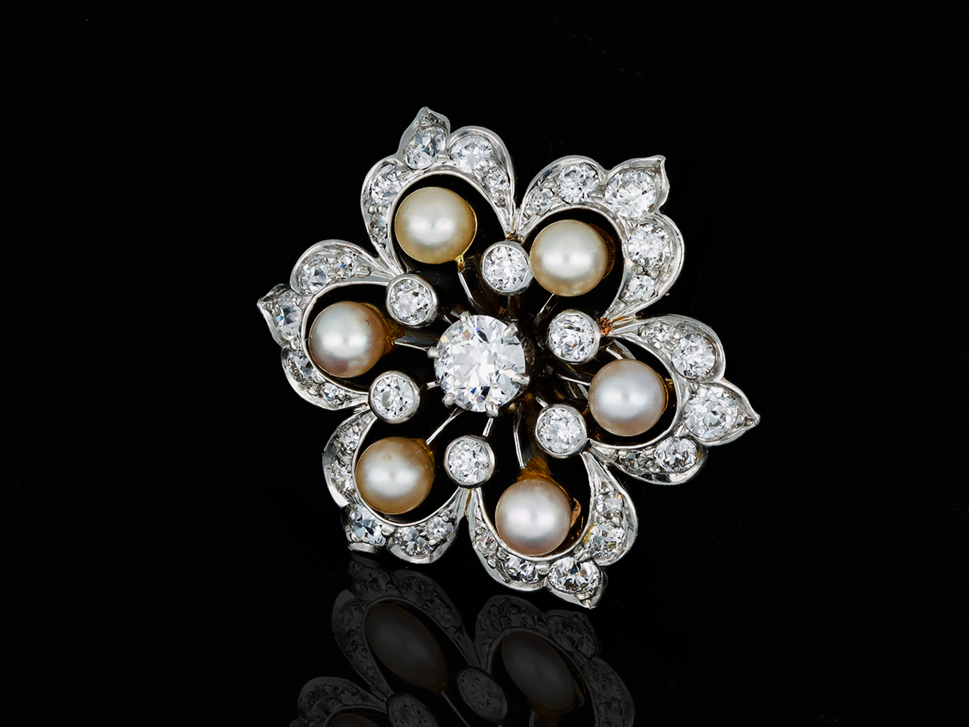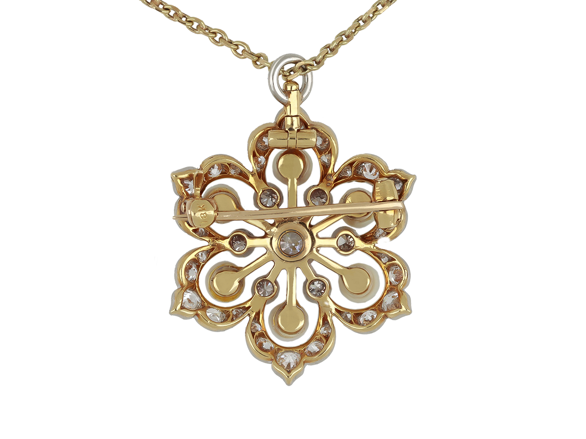 Edwardian pearl and diamond brooch/pendant. Set to centre with a round old cut diamond in an open back claw setting with an approximate weight of 0.40 carats, further set with thirty-six round old cut diamonds in open back grain and rubover settings with a combined weight of 1.26 carats and decorated with six natural pearls in closed back half drilled settings. The total approximate diamond weight is 1.66 carats, to an ornately crafted snowflake design with initracte openwork, polished edges and open and closed backholing, fitted to reverse with a secure hinged pin and clasp, and to top with a circular bale, pendant approximately 3cm in length. Pendant marked 18 carat yellow gold and settings tested platinum, circa 1915.