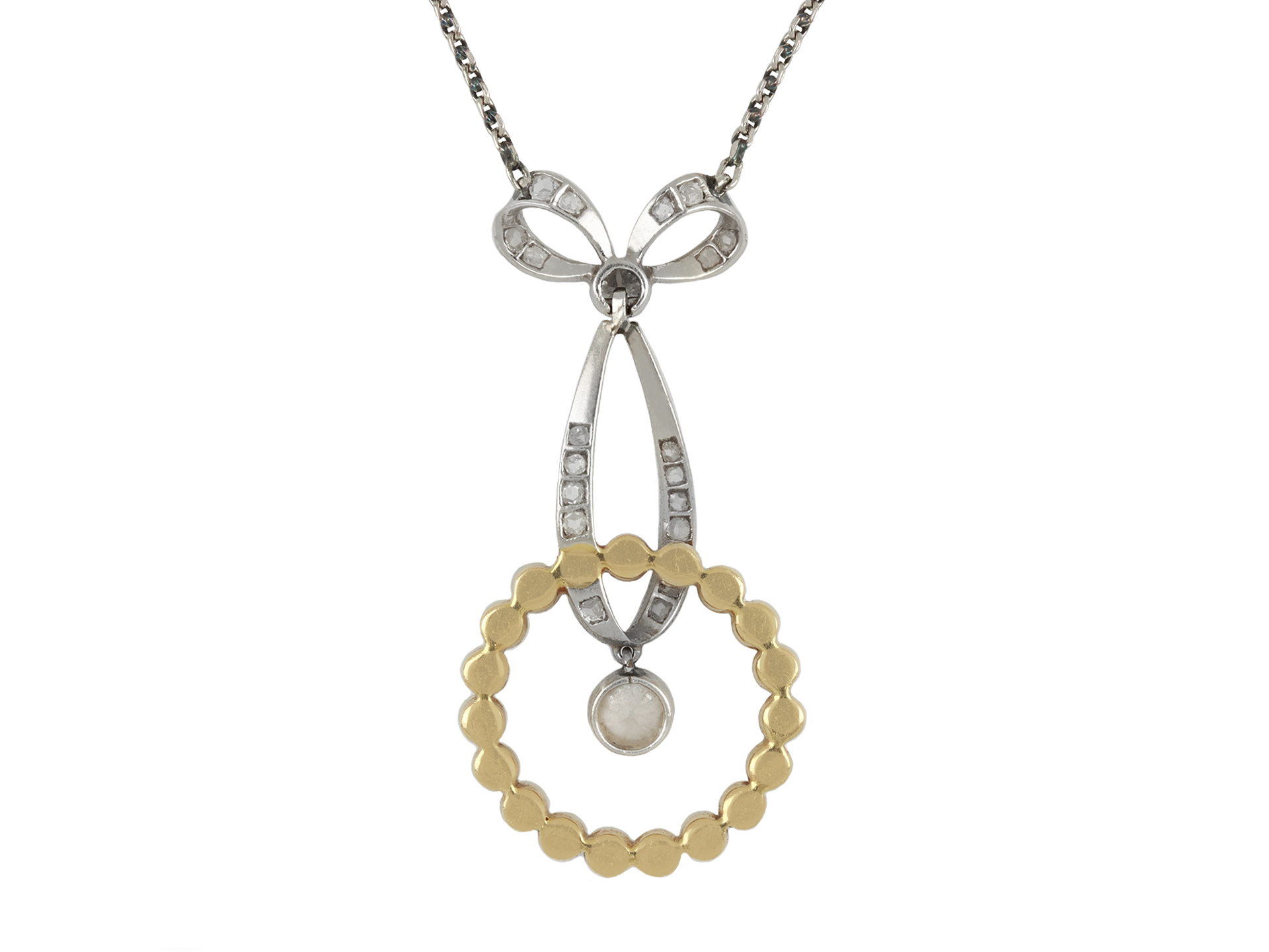 Edwardian pearl and diamond necklace. Set with a cushion shape old mine diamond in an open back rubover setting with an approximate weight of 0.20 carats, further set with another cushion shape old mine diamond in an open back rubover setting with an approximate weight of 0.08 carats, adorned by twenty round rose cut diamonds in open back grain settings with a combined weight of 0.25 carats, encircled by eighteen round natural pearls in closed back half drilled settings. The total approximate diamond weight is 0.53 carats to an elegant and beautifully articulated design with intricate openwork and millegrain edges, pendant approximately 3.5cm in length, chain approximately 16" in length. Tested platinum and yellow gold, numbered '62391370', circa 1910 and accompanied by fitted box.