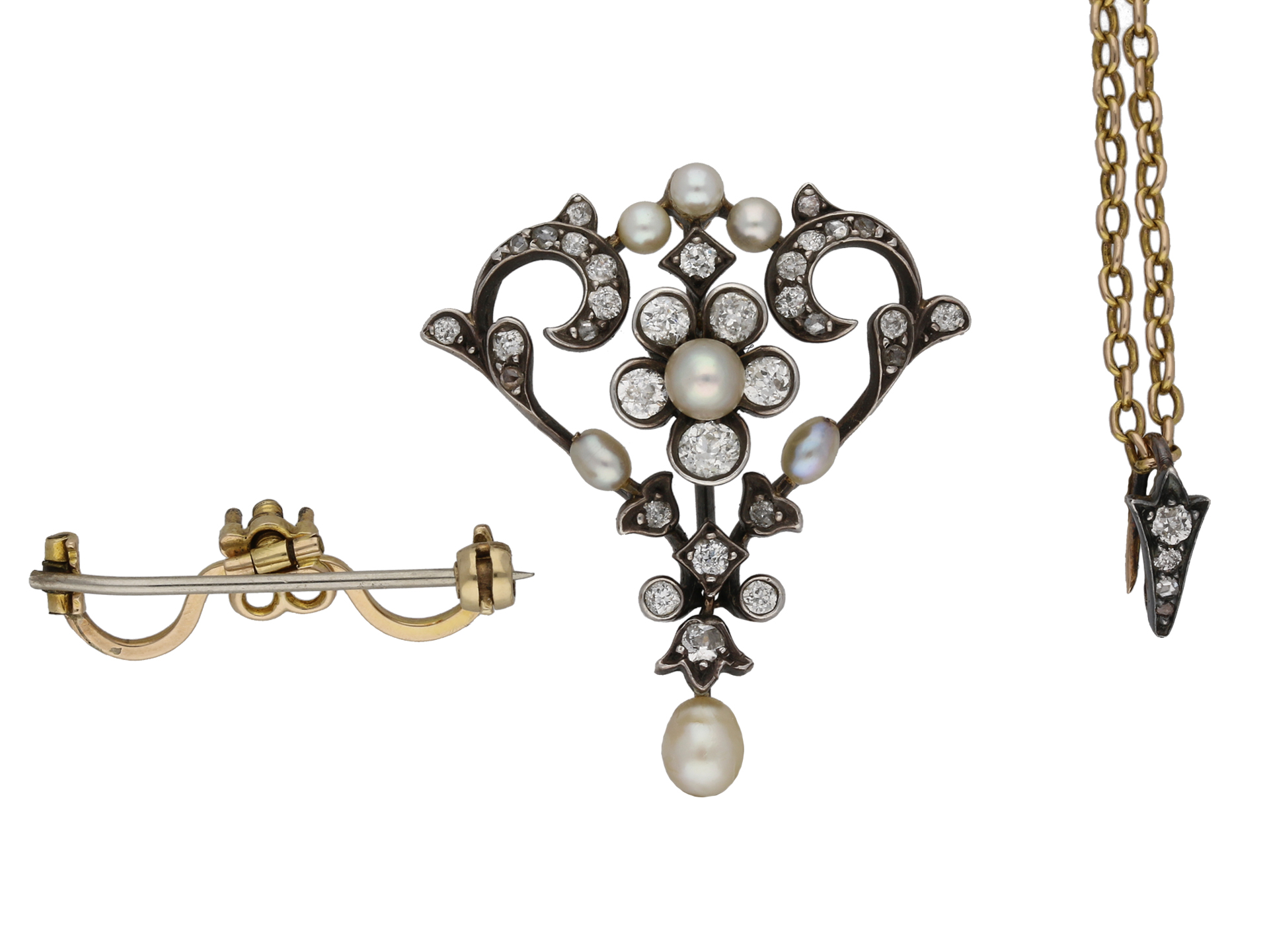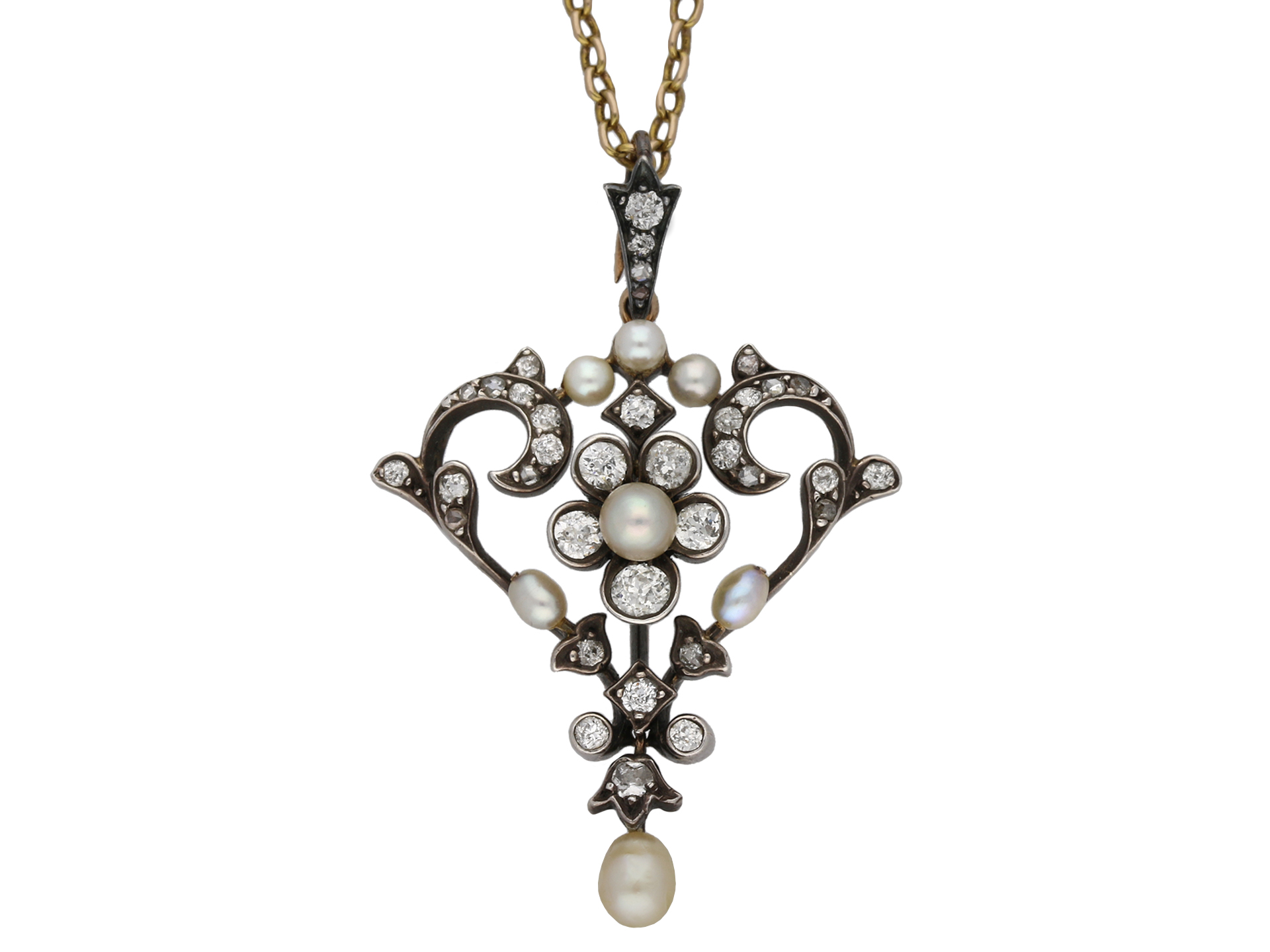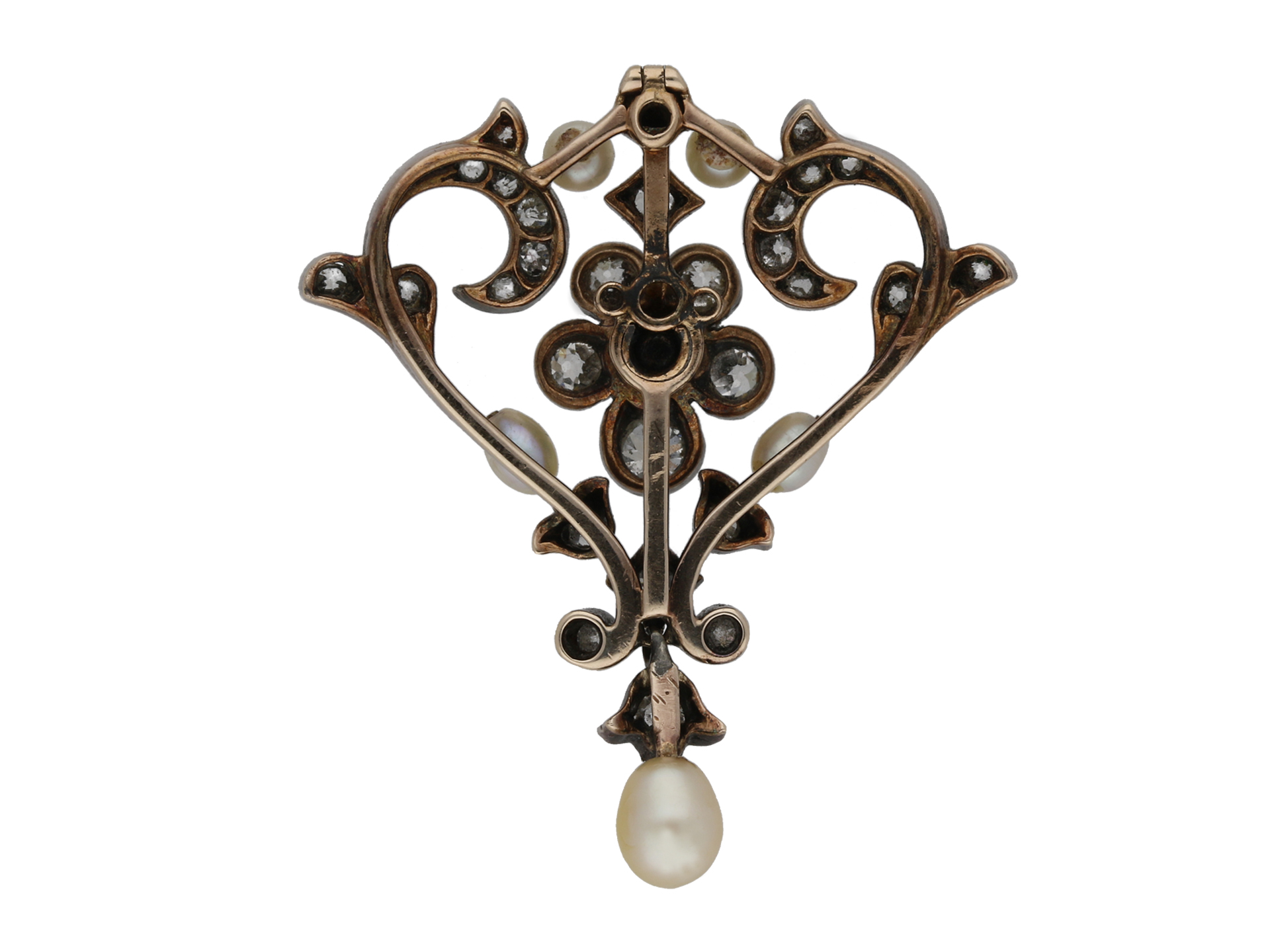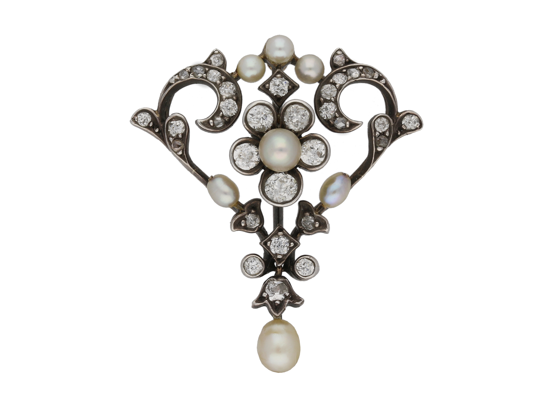 Gass & Co. pearl and diamond pendant/brooch. Set with seven natural pearls in closed back fittings, further set with twenty six round old cut diamonds in open back grain and rubover settings with an approximate weight of 1.00 carats, further adorned with ten round rose cut diamonds in open back grain settings with a combined weight of 0.10 carats. The total approximate diamond weight is 1.10 carats, to an openwork pendant/brooch featuring foliate and floral motifs, polished edges and open backholing, fitted to top with an elongated bale and to reverse with a secure hinge pin and clip. Tested yellow gold and silver, numbered '959, 114', accompanied by original fitted box marked 'GASS & CO, 138 REGENT STREET, LONDON'.