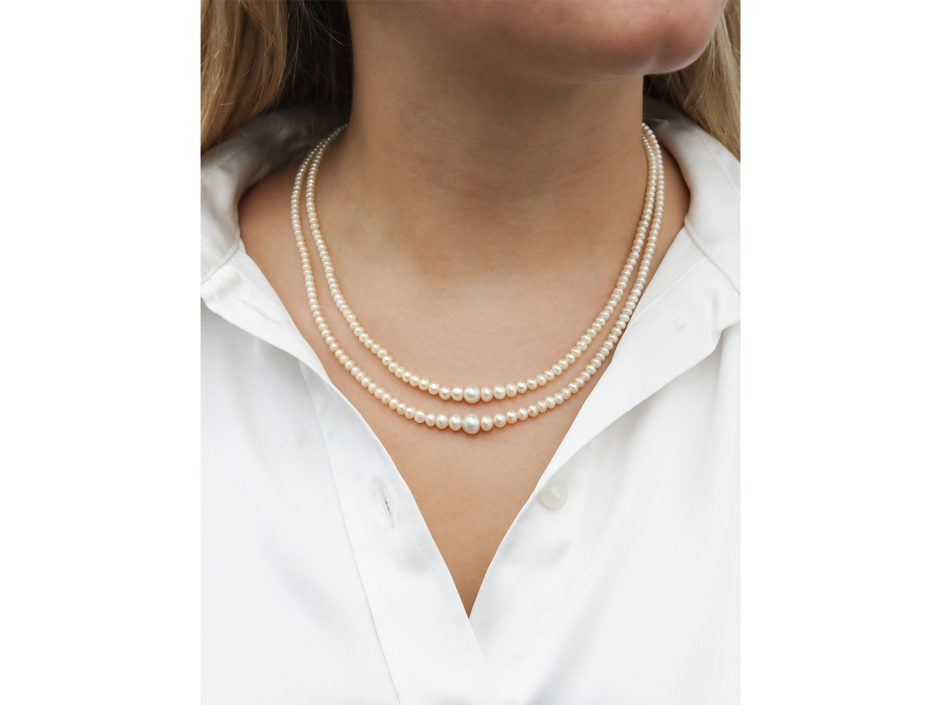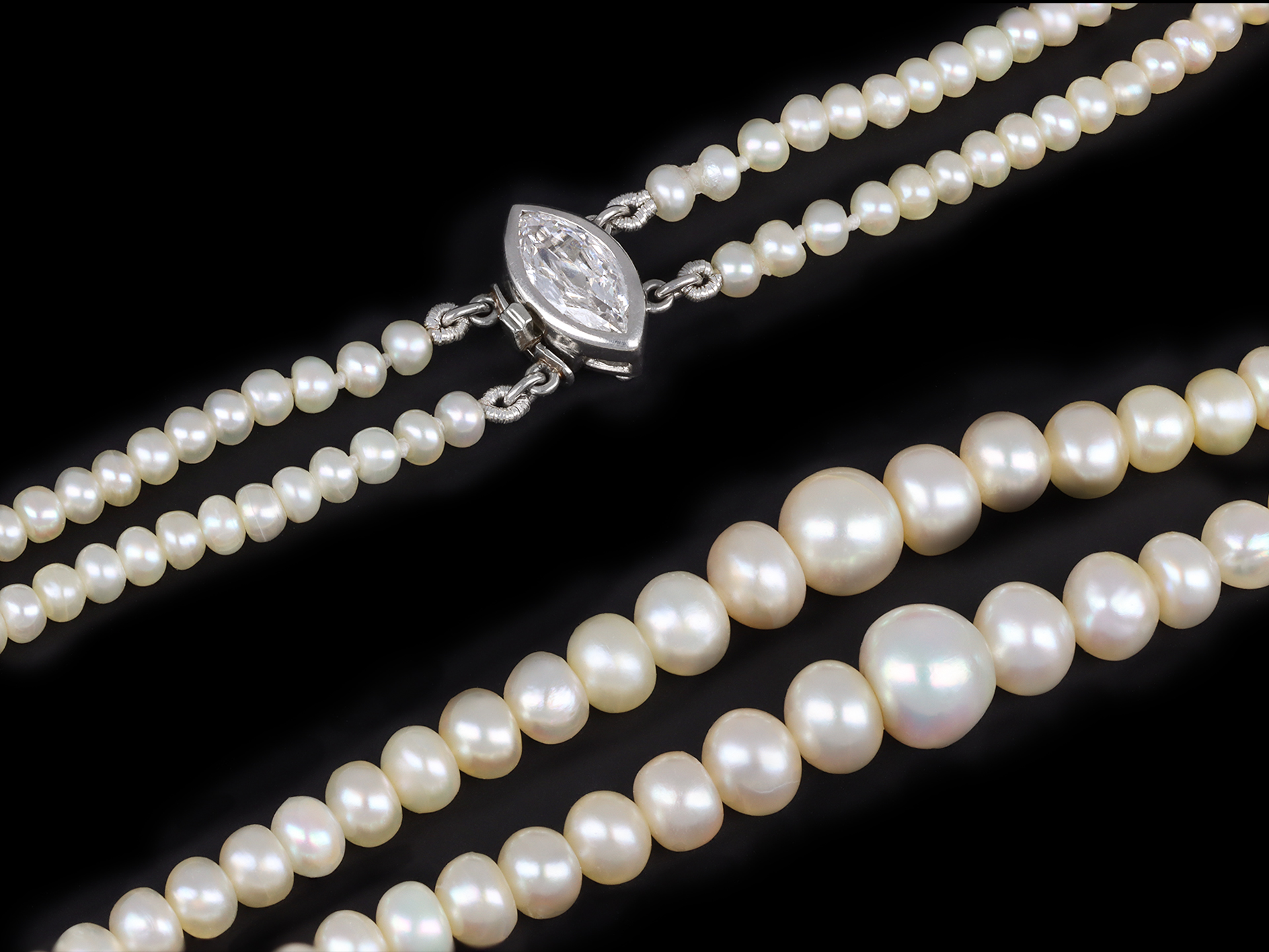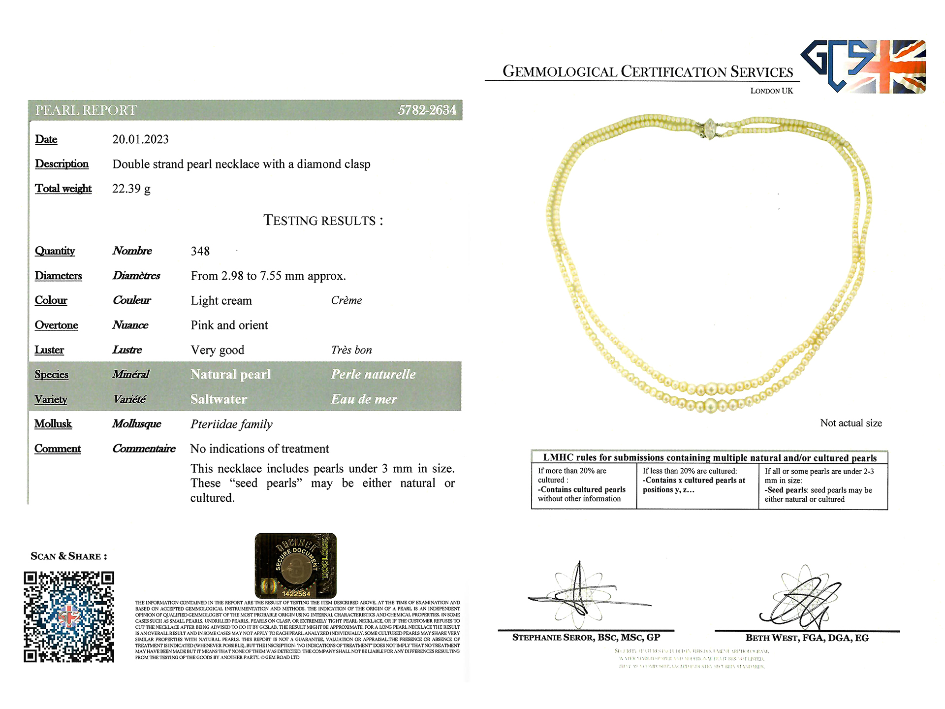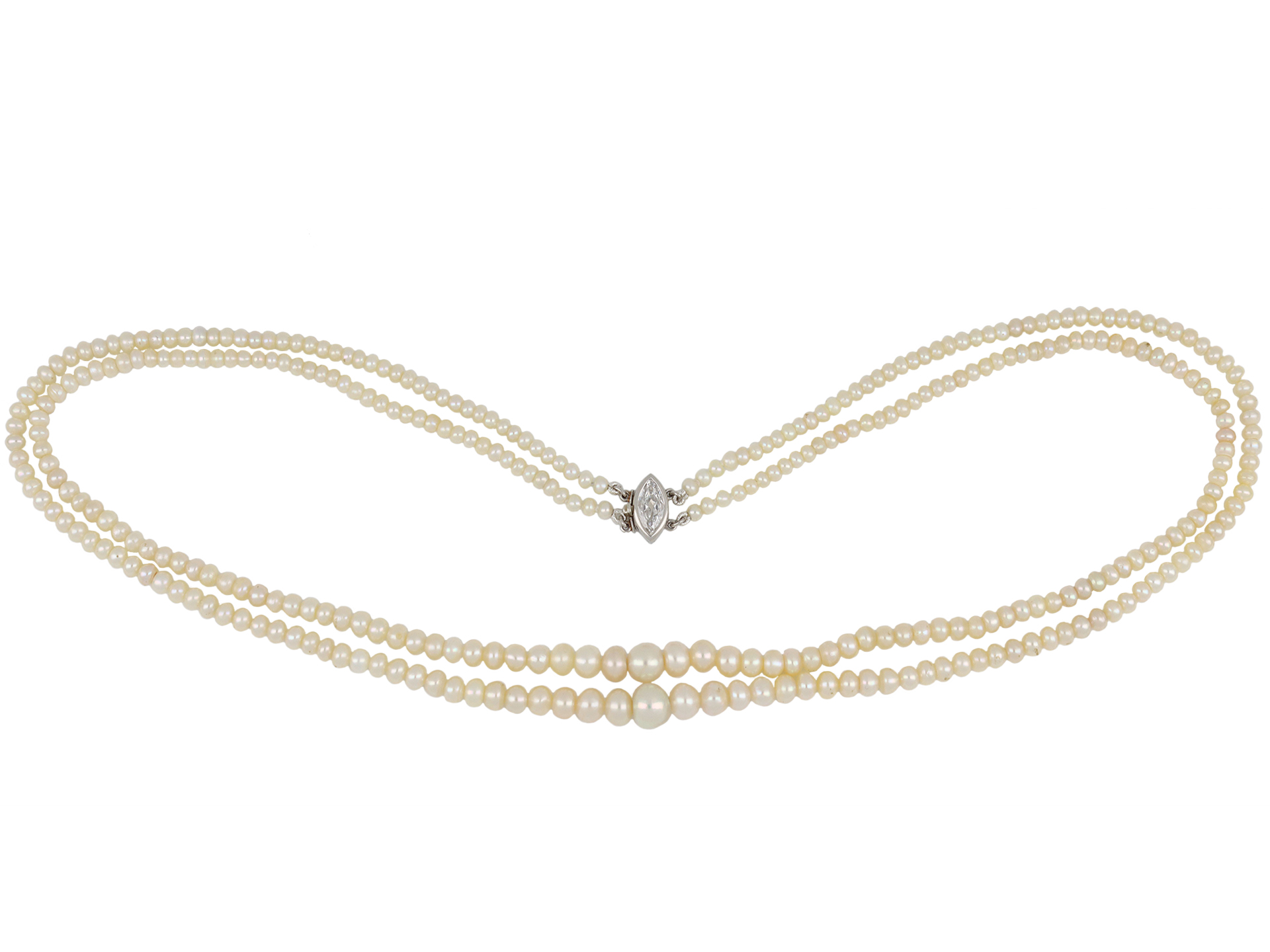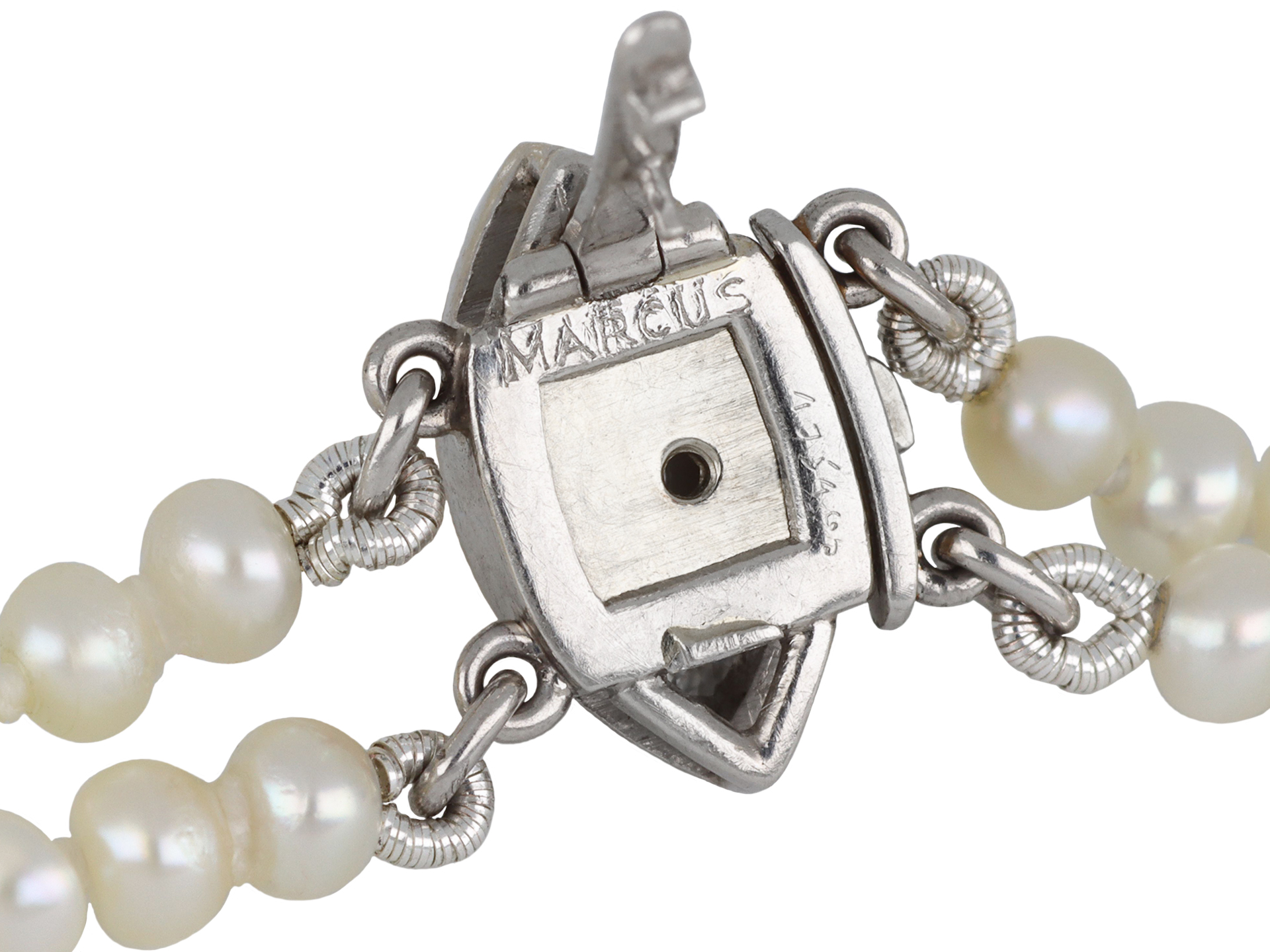 Marcus & Co. natural saltwater pearl necklace. Composed of three hundred and forty-eight natural saltwater pearls, further set with a marquise shape old cut diamond in an open back rubover with an approximate weight of 0.60 carats, to an elegant graduating double row necklace, terminating in a secure push clasp and safety catch, approximately 19" in length. Clasp tested platinum, numbered '47 54 06, signed 'MARCUS' for Marcus & Co., circa 1915, accompanied by Gemmological Certification Services report #5782-2634.