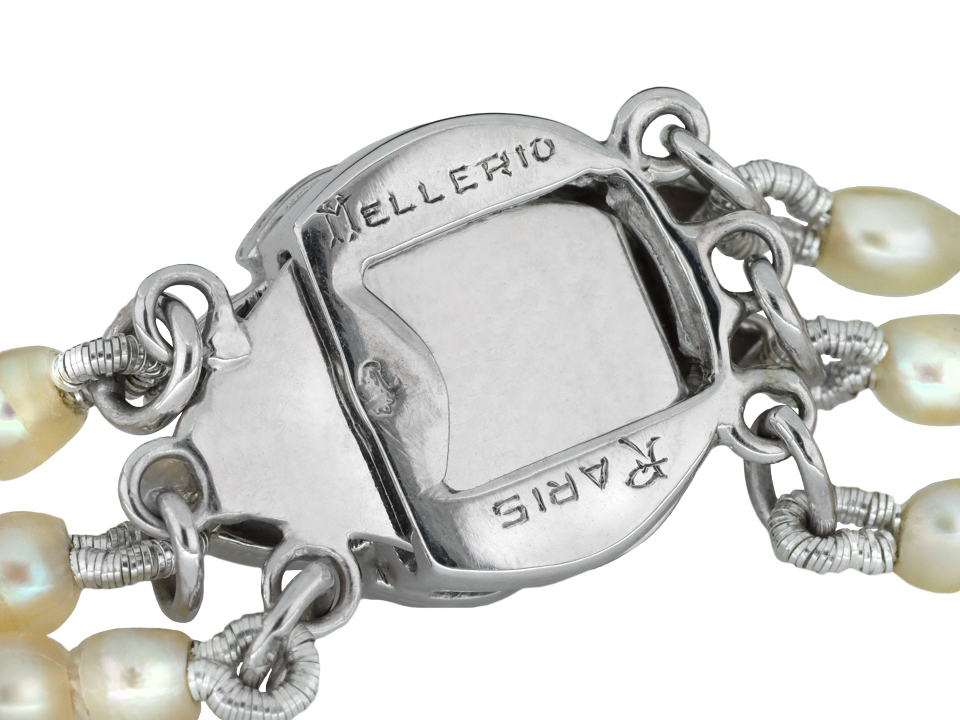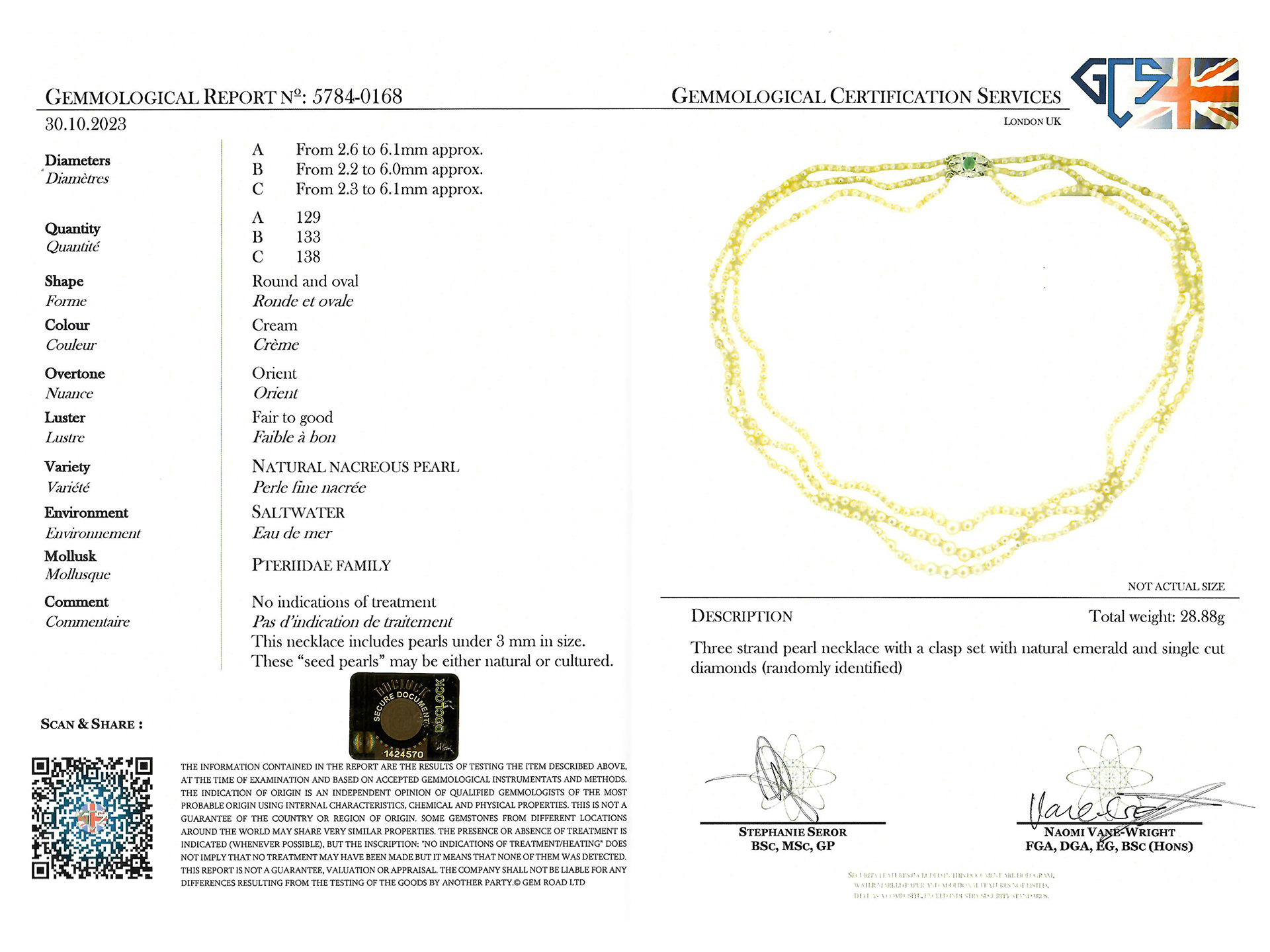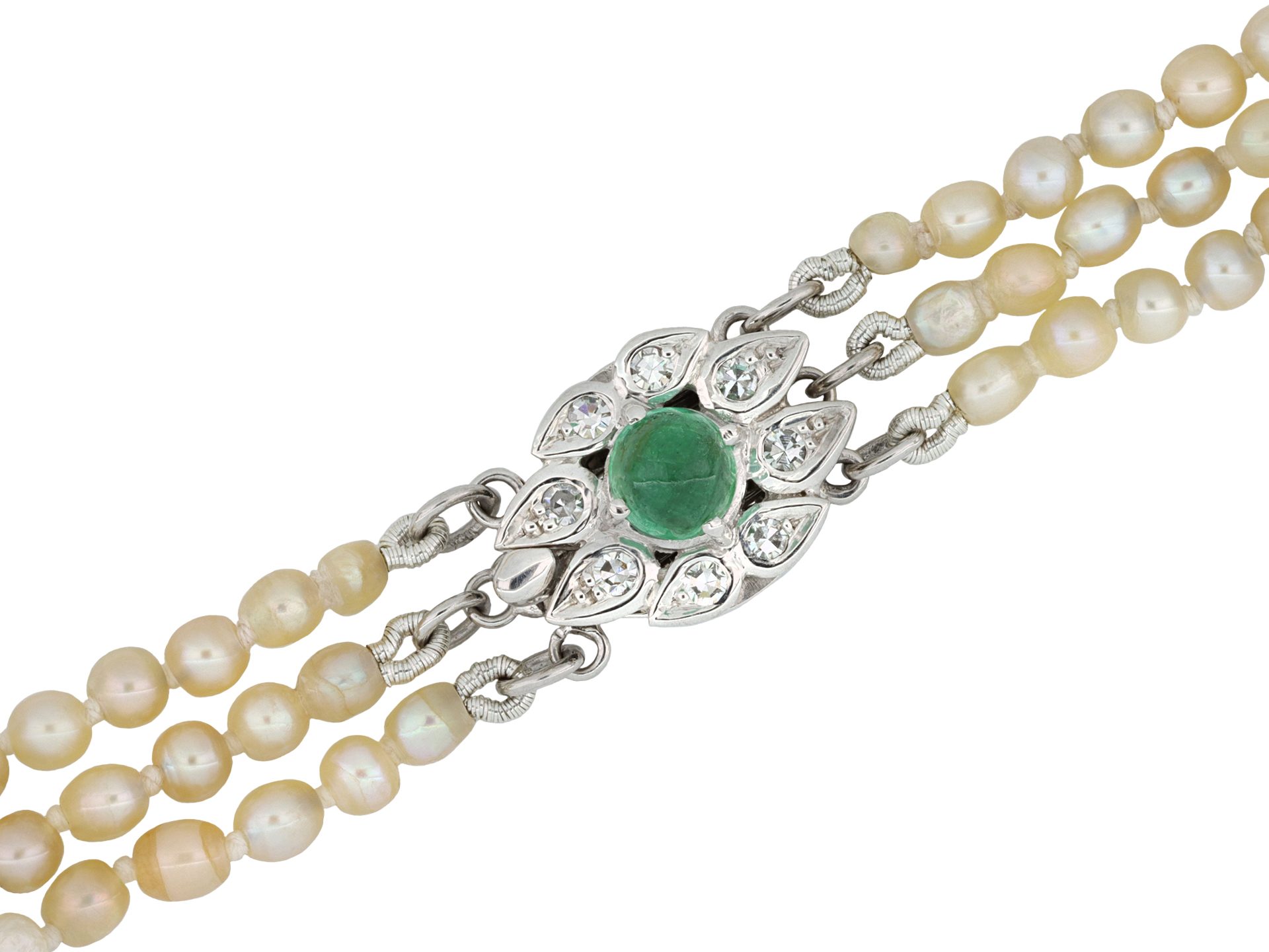 Mellerio pearl and emerald necklace. A triple strand necklace set with four hundred round and oval natural saltwater pearls, ranging from 2.2mm to 6.1mm in diameter, further set to the clasp with a natural circular cabochon emerald in an open back claw setting with an approximate weight of 0.50 carats, and decorated with eight round eight cut diamonds in open back grain and rubover settings with a combined approximate weight of 0.16 carats, to an elegant graduating necklace featuring polished edges and open backholing, fitted with a secure push clasp, necklace approximately 21" in length. Marked 18 carat white gold, signed 'Mellerio Paris', French, circa 1915, accompanied by Gemmological Certification Services report # 5784-0168.