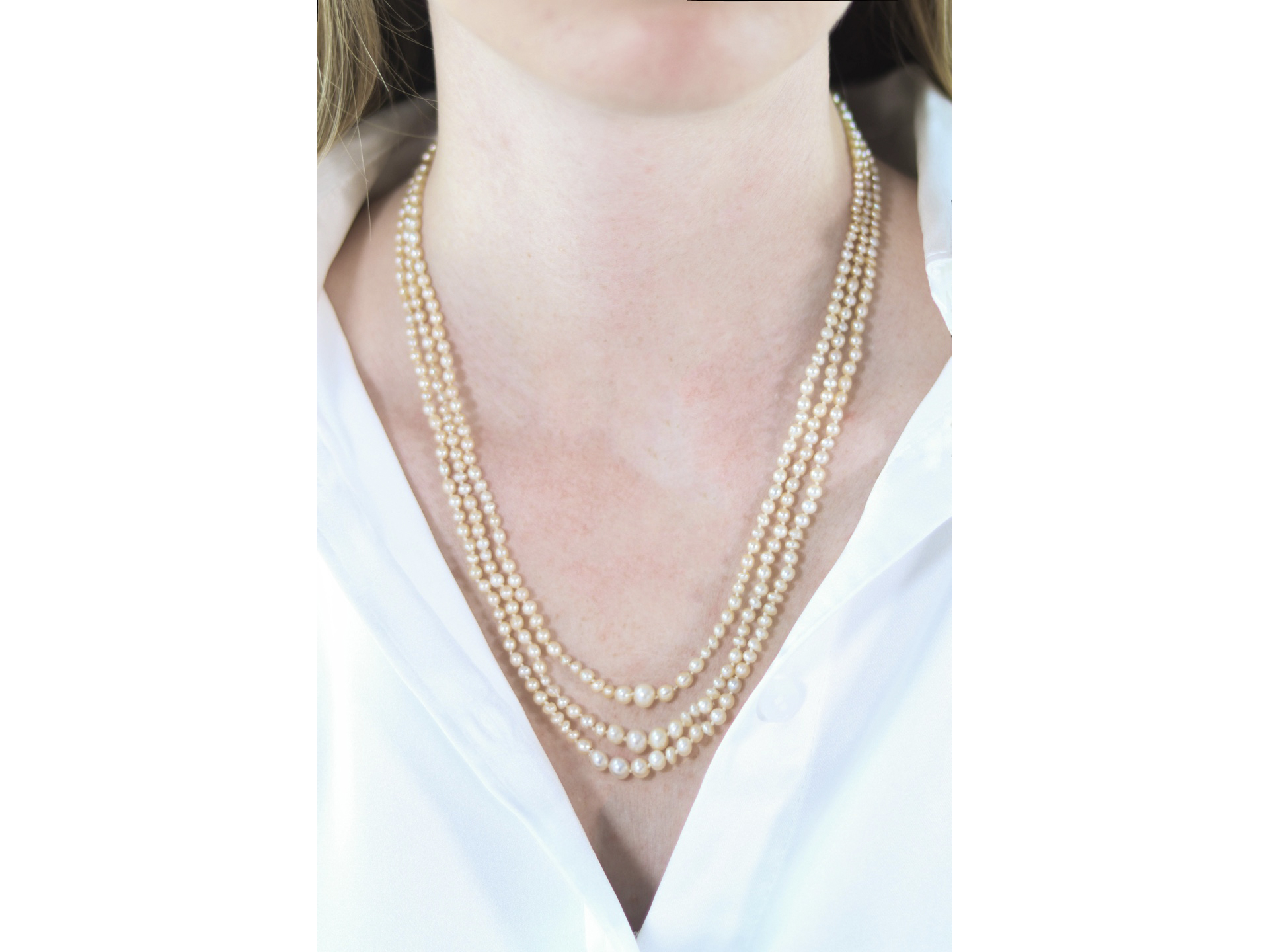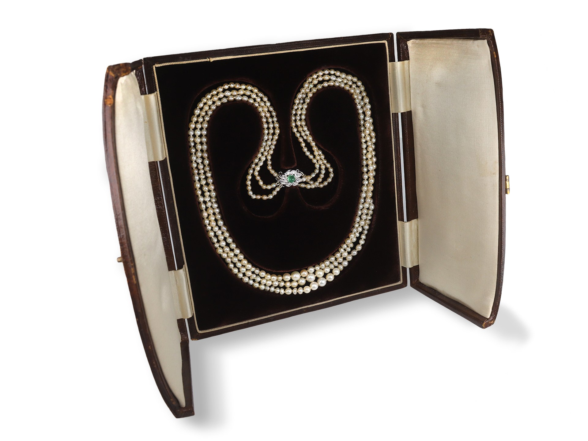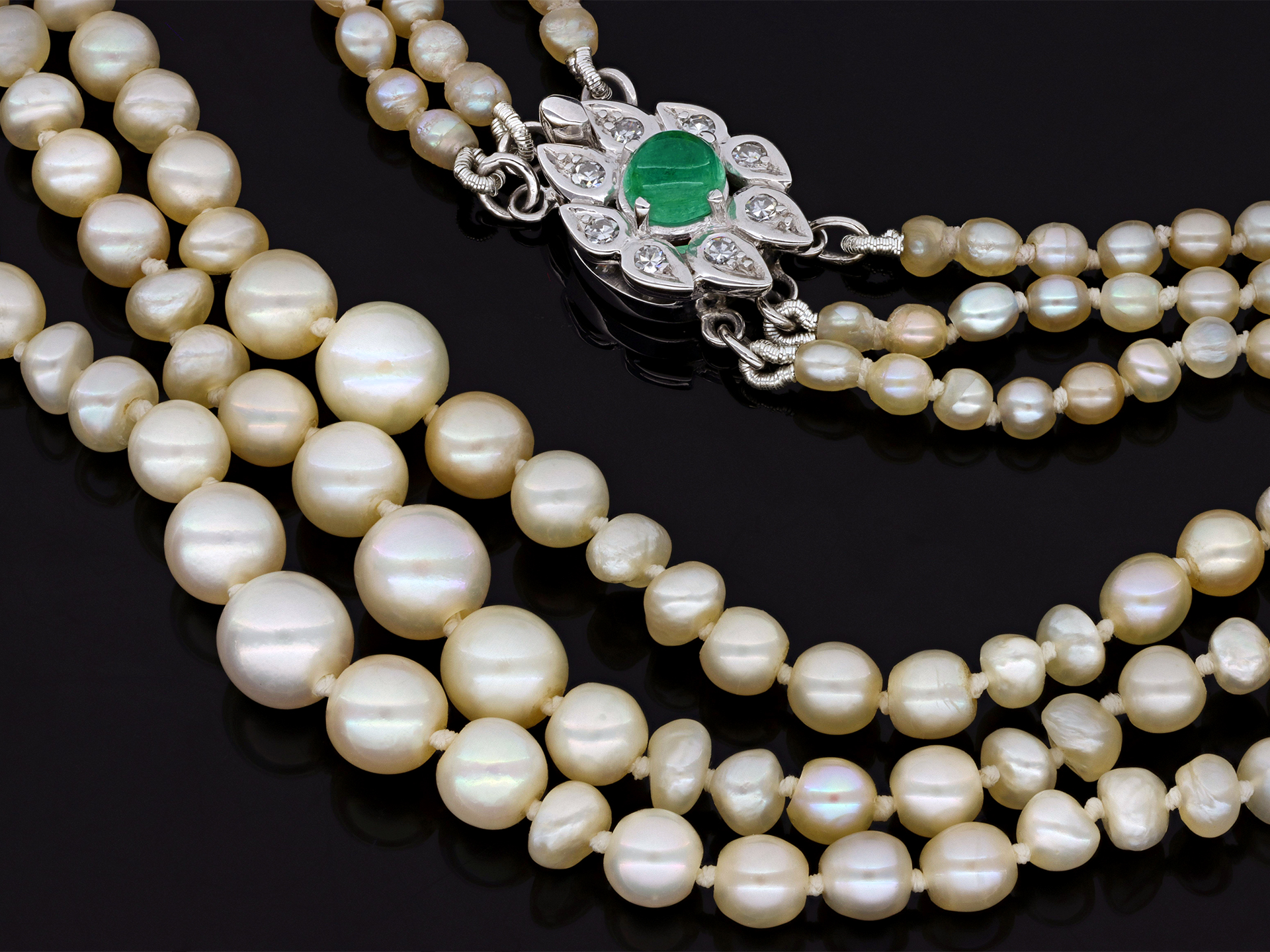 Mellerio pearl and emerald necklace. A triple strand necklace set with four hundred round and oval natural saltwater pearls, ranging from 2.2mm to 6.1mm in diameter, further set to the clasp with a natural circular cabochon emerald in an open back claw setting with an approximate weight of 0.50 carats, and decorated with eight round eight cut diamonds in open back grain and rubover settings with a combined approximate weight of 0.16 carats, to an elegant graduating necklace featuring polished edges and open backholing, fitted with a secure push clasp, necklace approximately 21" in length. Marked 18 carat white gold, signed 'Mellerio Paris', French, circa 1915, accompanied by Gemmological Certification Services report # 5784-0168.