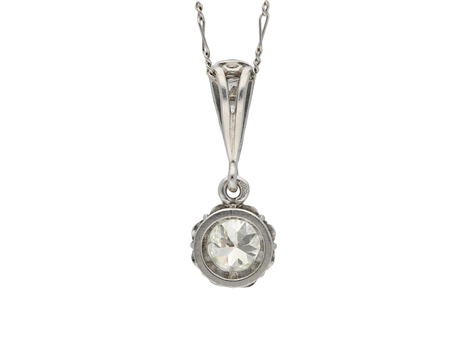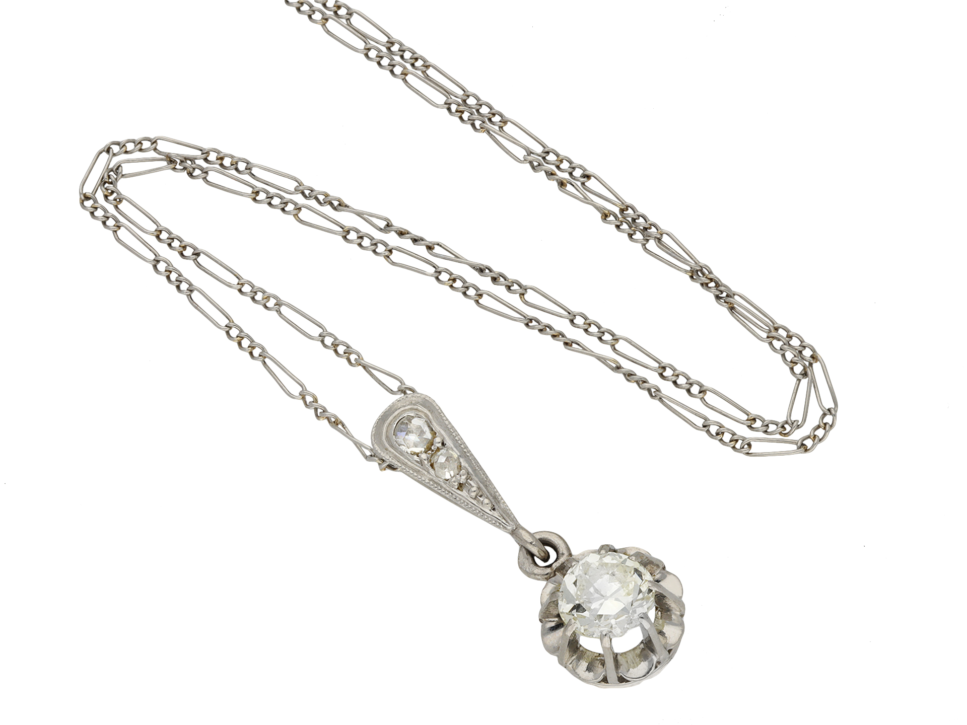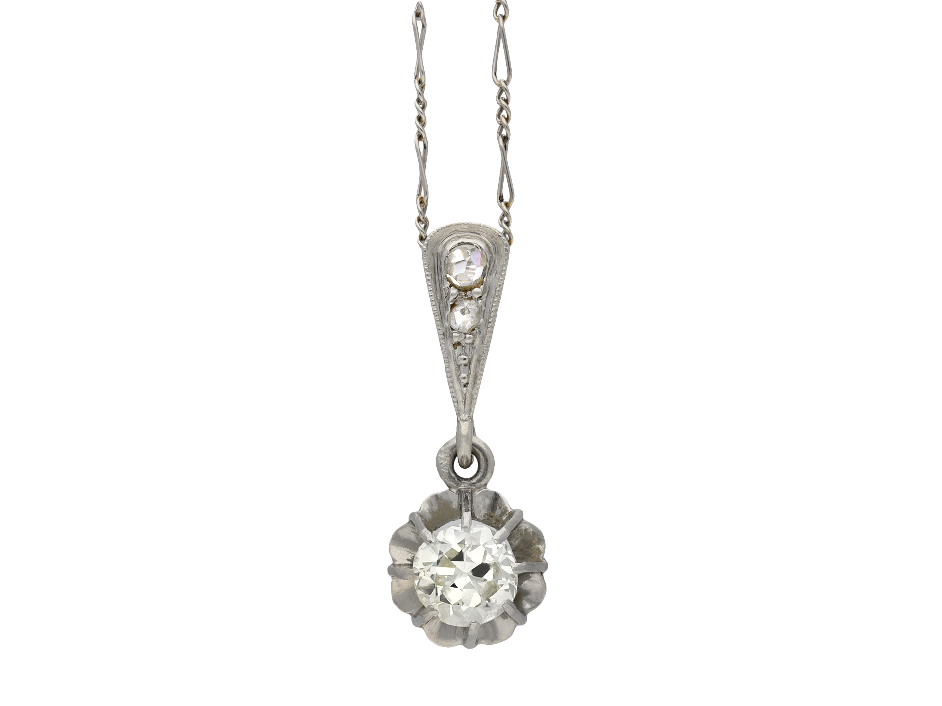 Old cut diamond drop pendant. Set to bottom with a round old cut diamond in an open back claw setting with an approximate weight of 0.60 carats, further adorned with two round rose cut diamonds in open back grain settings with a combined weight of 0.10 carats. The total approximate diamond weight is 0.70 carats, to an elegant articulated illusion set design, flowing with movement, featuring curving claws and millegrain edging, an intricately pierced gallery and open backholing, with an integrated bale with chenier detail and accompanied by a fine chain with secure clasp and safety chain, pendant approximately 2cm in length, chain approximately 17" in length. Tested platinum, circa 1910.