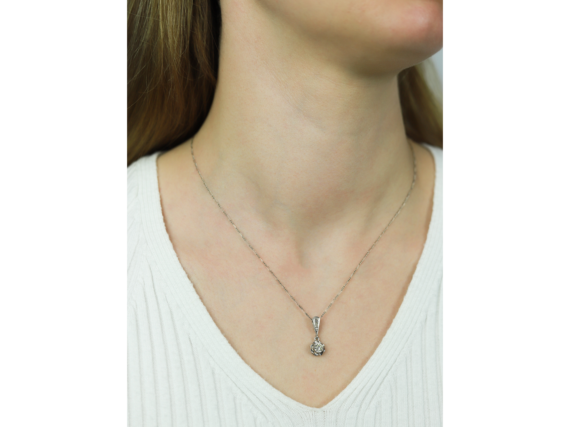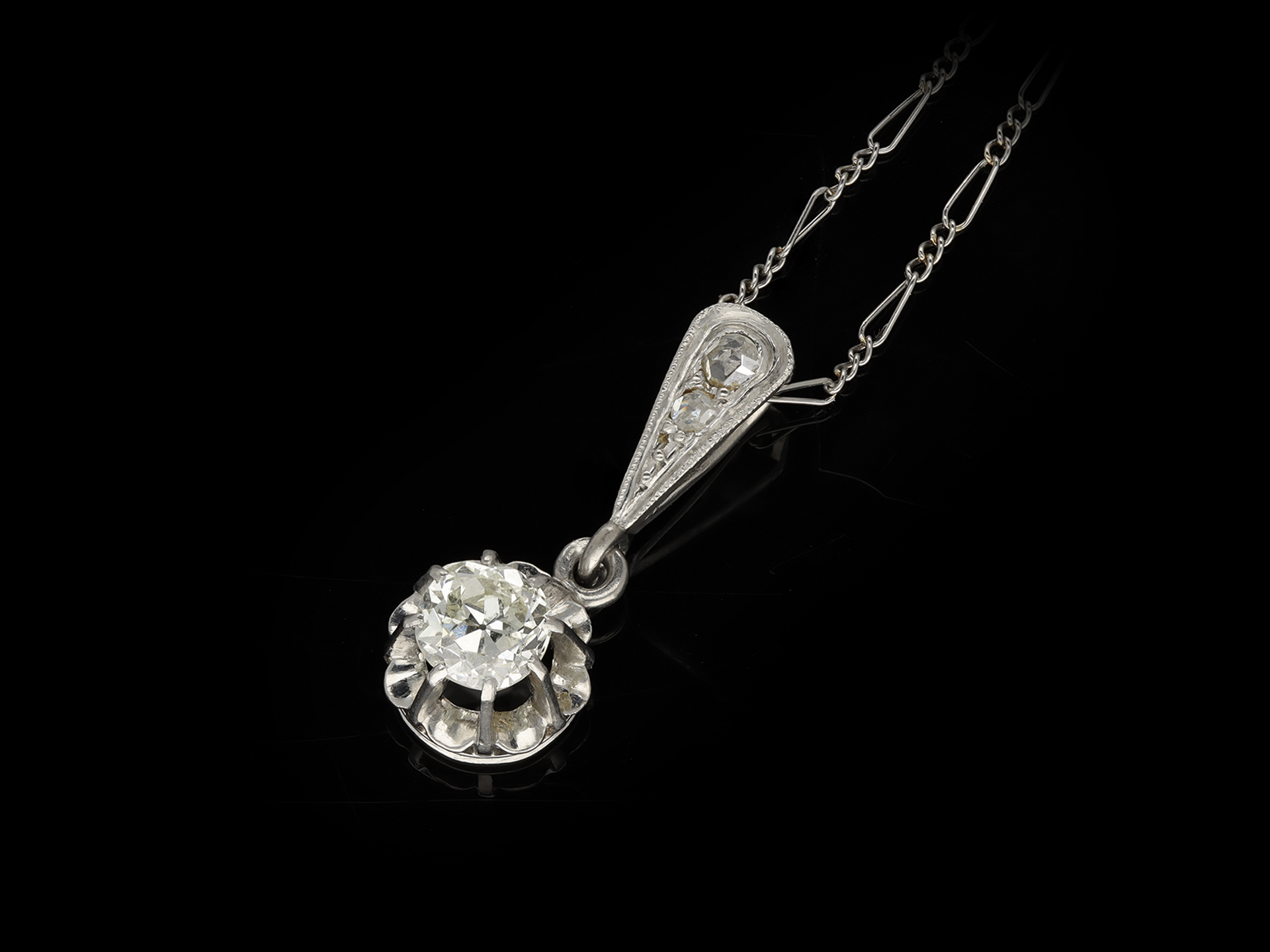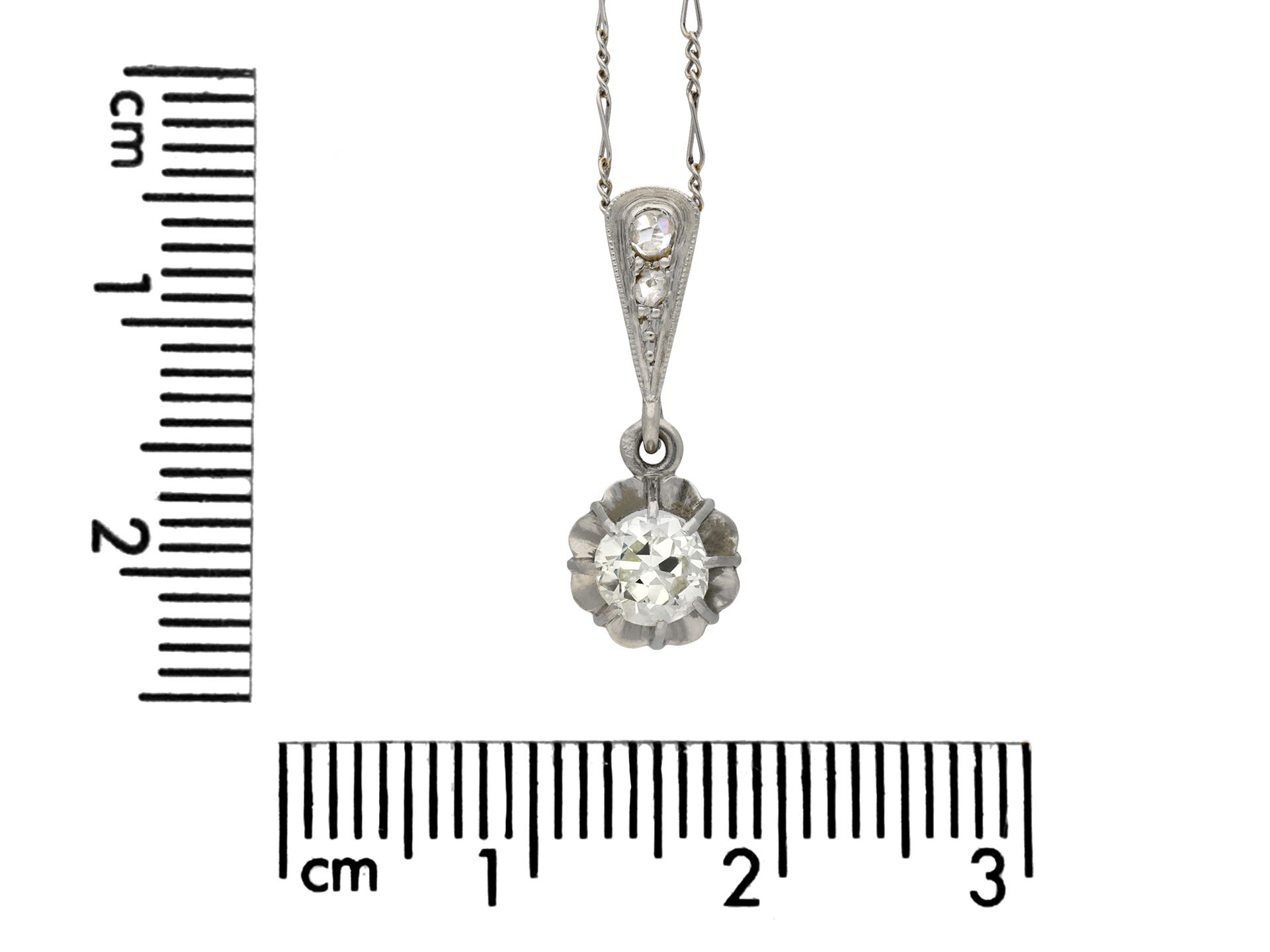 Old cut diamond drop pendant. Set to bottom with a round old cut diamond in an open back claw setting with an approximate weight of 0.60 carats, further adorned with two round rose cut diamonds in open back grain settings with a combined weight of 0.10 carats. The total approximate diamond weight is 0.70 carats, to an elegant articulated illusion set design, flowing with movement, featuring curving claws and millegrain edging, an intricately pierced gallery and open backholing, with an integrated bale with chenier detail and accompanied by a fine chain with secure clasp and safety chain, pendant approximately 2cm in length, chain approximately 17" in length. Tested platinum, circa 1910.