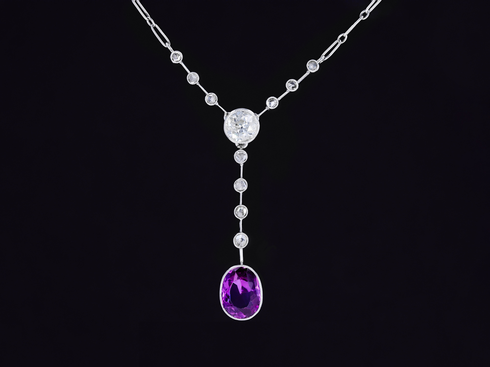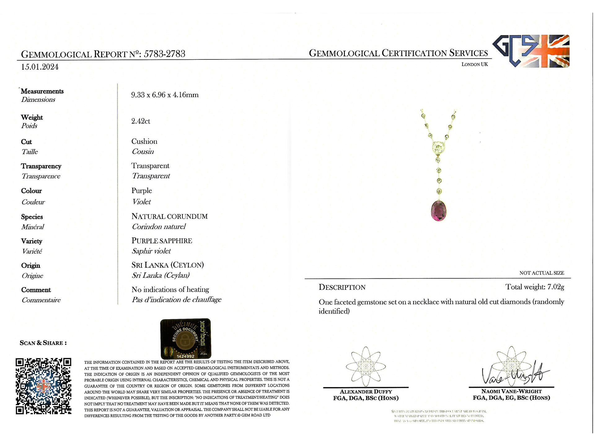 Purple Ceylon sapphire and diamond pendant. Set with an oval old cut natural unenhanced purple Ceylon sapphire in an open back rubover setting with a weight of 2.42 carats, suspended from one cushion shape old mine diamond in an open back rubover setting with an approximate weight of 0.75 carats, and further set with ten round rose cut diamonds in open back rubover settings with an approximate combined weight of 0.25 carats. The total approximate diamond weight is 1.00 carats, to an elegant articulated pendant, flowing with movement, featuring millegrain edges, pierced galleries and open backholing, fitted to top to a fine chain, terminating in a secure C-clasp with safety chain, pendant approximately 4cm in length, chain approximately 14 inches in length. Settings and clasp tested platinum, safety chain tested white gold, circa 1915, accompanied by Gemological Certificate Services report 5783-2783.
