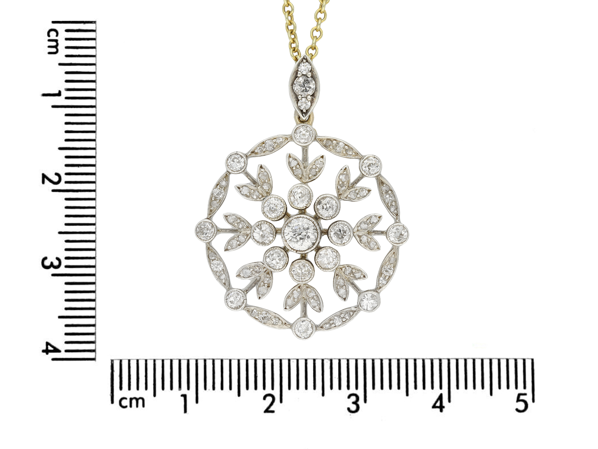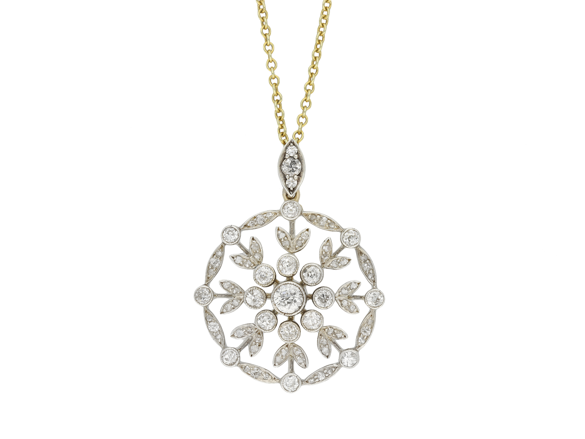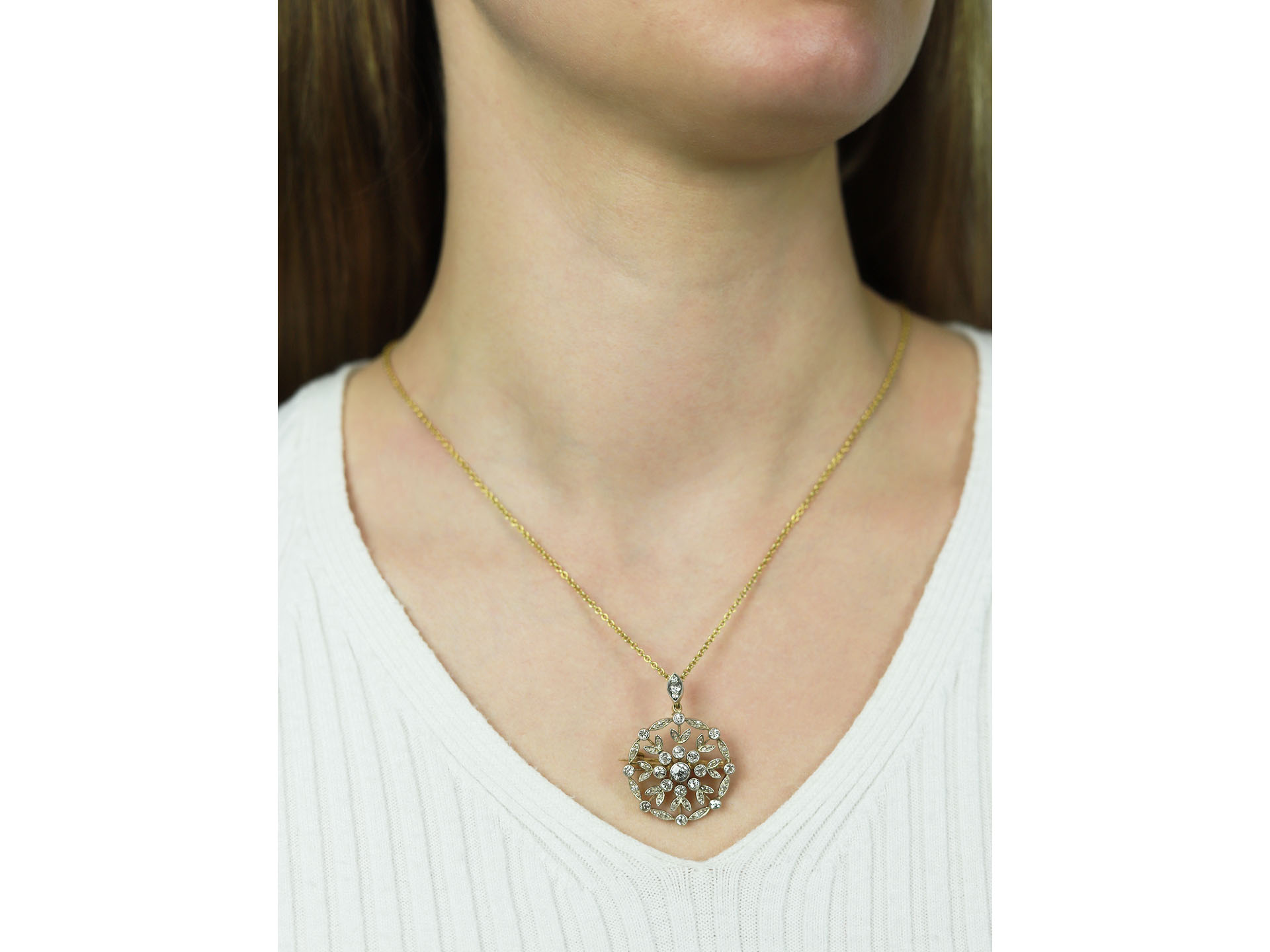 Victorian diamond pendant/brooch. Set to centre with a round old cut diamond in an open back rubover setting with an approximate weight of 0.35 carats, adorned further with sixteen round old cut diamonds in open back rubover settings with a combined weight of 0.80 carats, further enhanced with fifty round rose cut diamonds in open back grain settings with a combined weight of 0.50 carats, decorated throughout with eight round eight cut diamonds with a combined weight of 0.16 carats, set to bale with three round eight cut diamonds with a combined weight of 0.13 carats. The total approximate diamond weight is 1.94 carats, to a stylised floral design featuring a central circular plaque from which curved openwork petals radiate, polished and millgrain edges and ornately pierced open backholing, fitted to reverse with a secure brooch bar fitting and C-clasp and fitted to top a hinged marquise shape bale, the fine trace link chain approximately 18" in length, pendant approximately 3.5cm. Tested yellow gold with silver settings, chain marked 15 carat yellow gold, circa 1890.