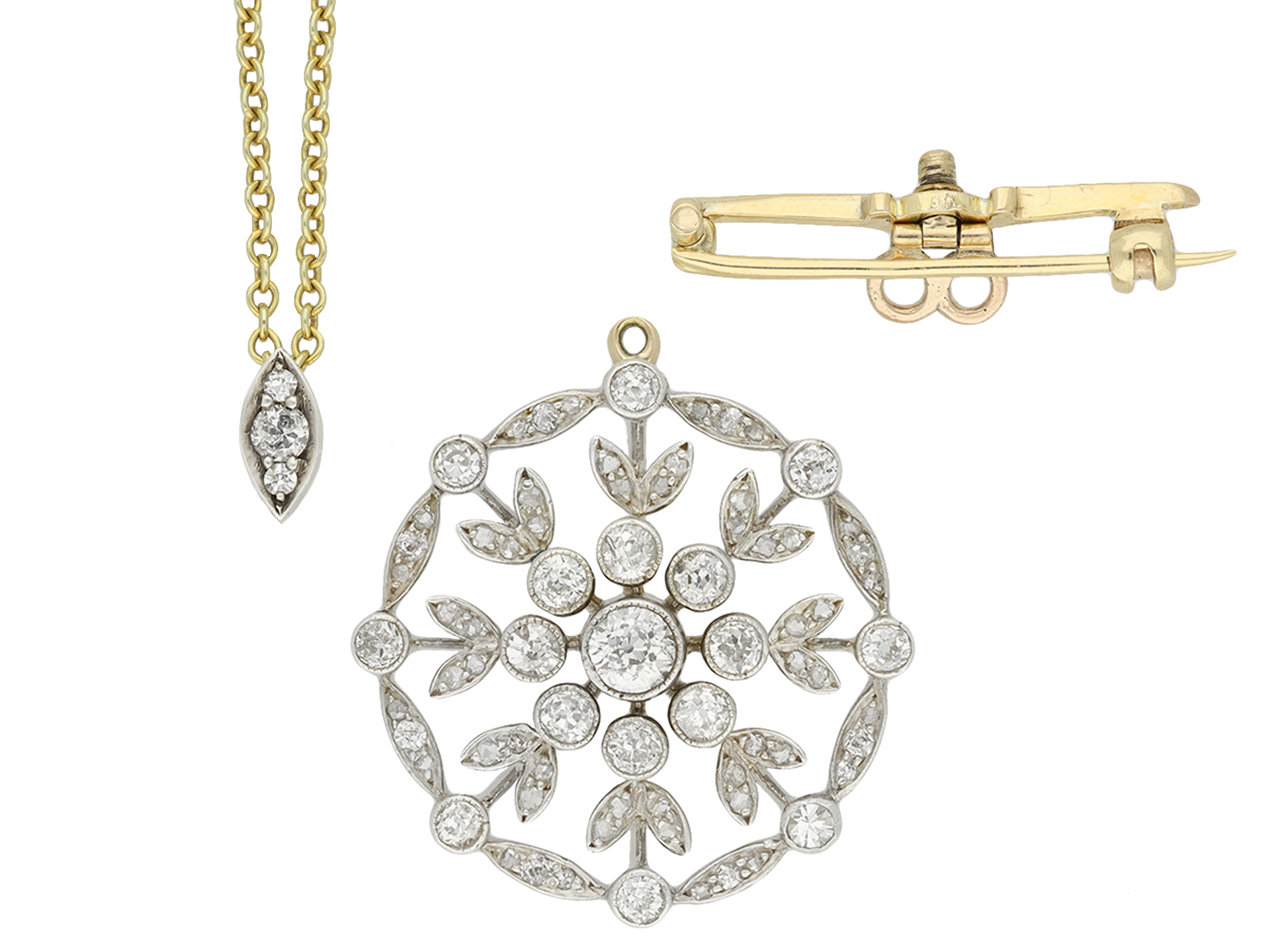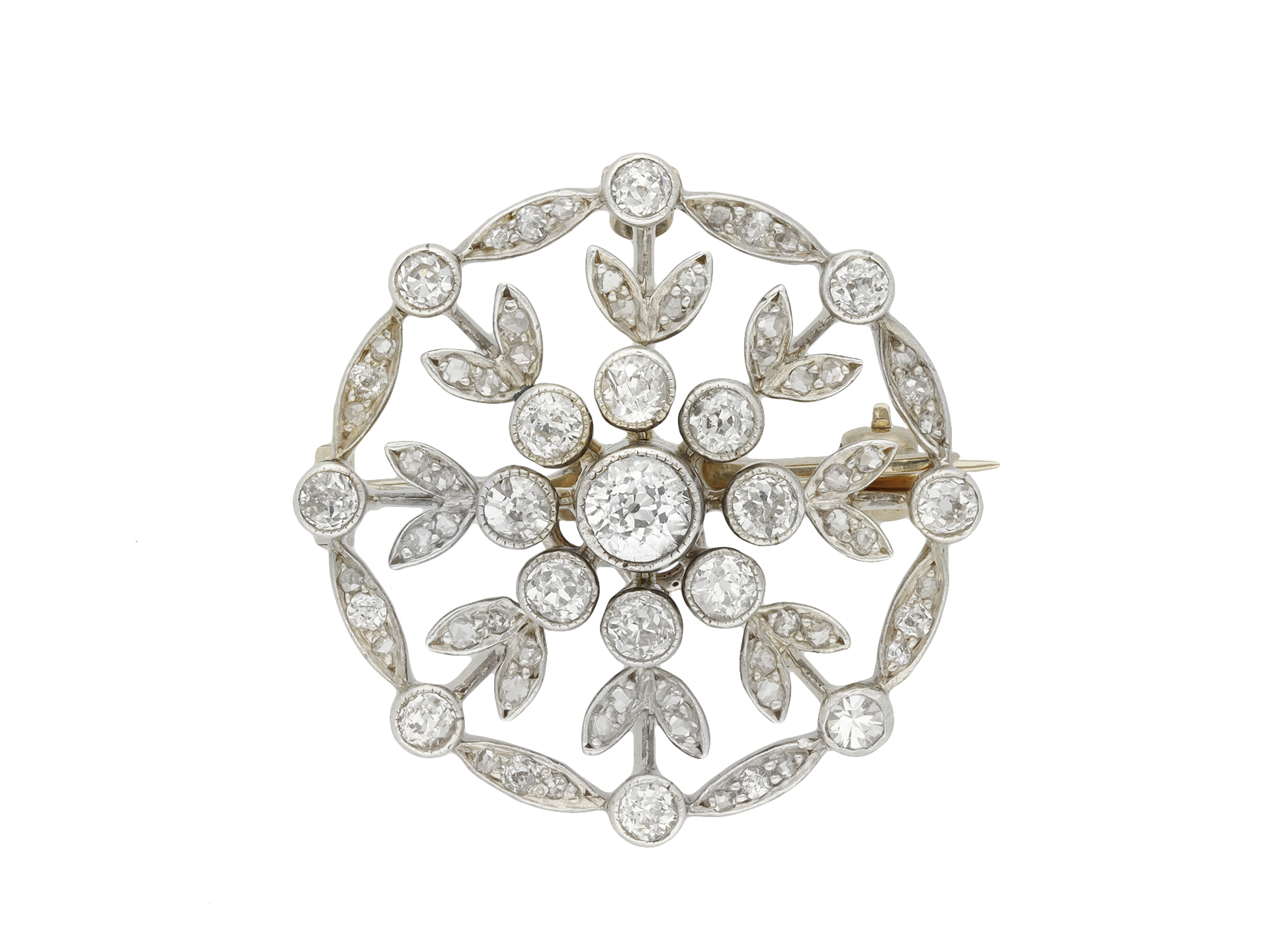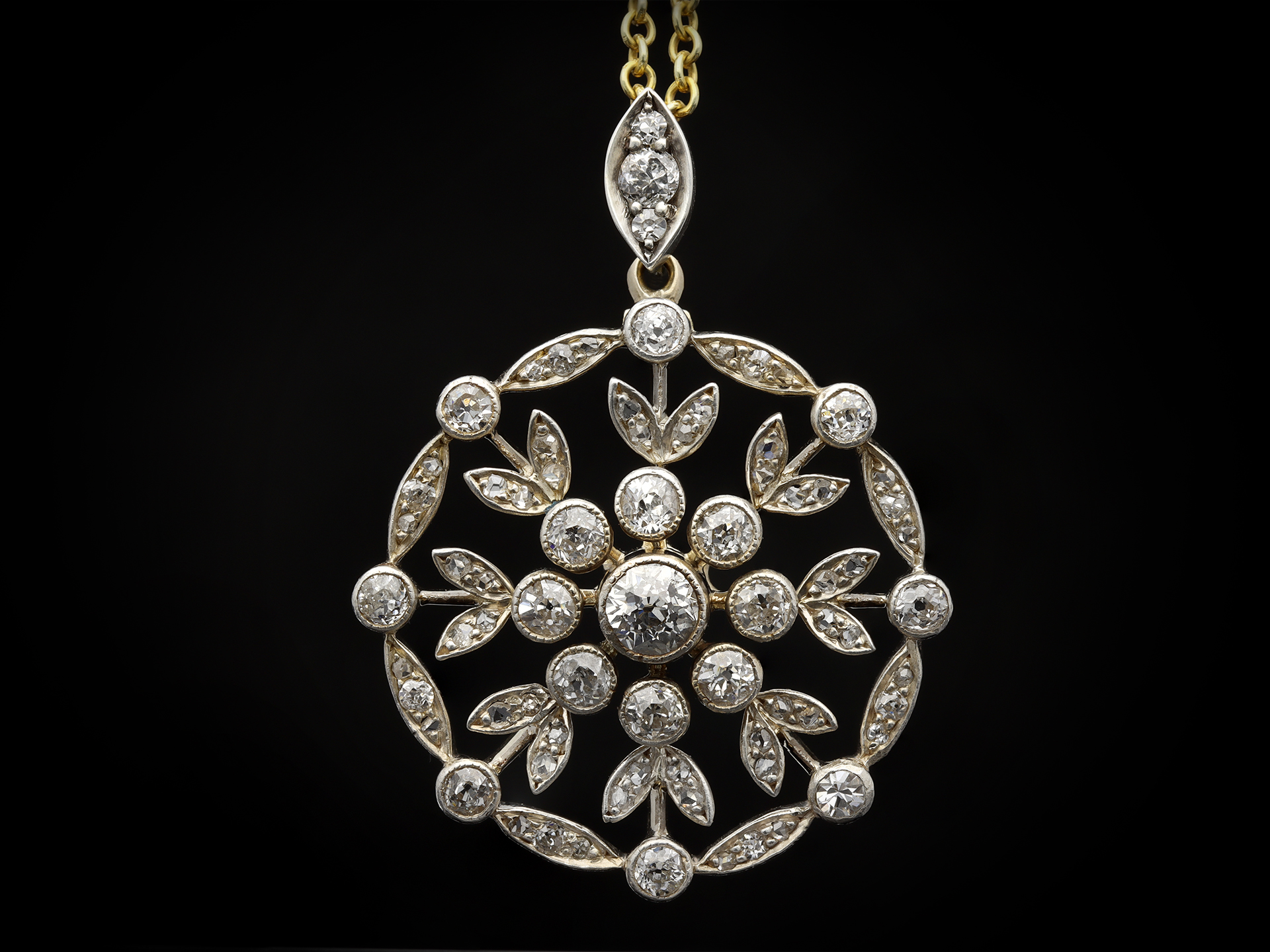 Victorian diamond pendant/brooch. Set to centre with a round old cut diamond in an open back rubover setting with an approximate weight of 0.35 carats, adorned further with sixteen round old cut diamonds in open back rubover settings with a combined weight of 0.80 carats, further enhanced with fifty round rose cut diamonds in open back grain settings with a combined weight of 0.50 carats, decorated throughout with eight round eight cut diamonds with a combined weight of 0.16 carats, set to bale with three round eight cut diamonds with a combined weight of 0.13 carats. The total approximate diamond weight is 1.94 carats, to a stylised floral design featuring a central circular plaque from which curved openwork petals radiate, polished and millgrain edges and ornately pierced open backholing, fitted to reverse with a secure brooch bar fitting and C-clasp and fitted to top a hinged marquise shape bale, the fine trace link chain approximately 18" in length, pendant approximately 3.5cm. Tested yellow gold with silver settings, chain marked 15 carat yellow gold, circa 1890.