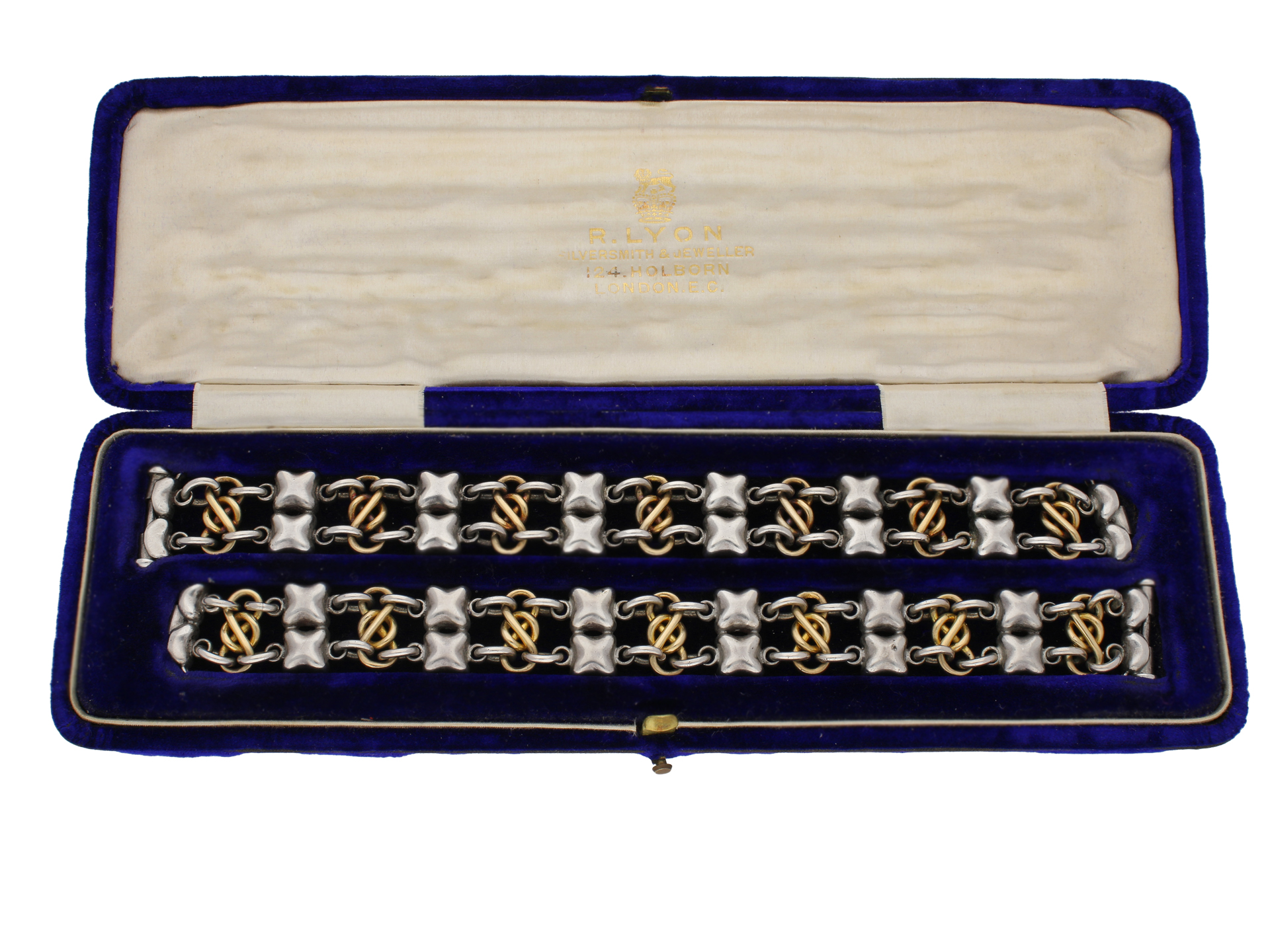 The inside of the box lid has gold lettering saying R. Lyon. Silversmith & Jewellers, 124 Holborn, London. E.C.
