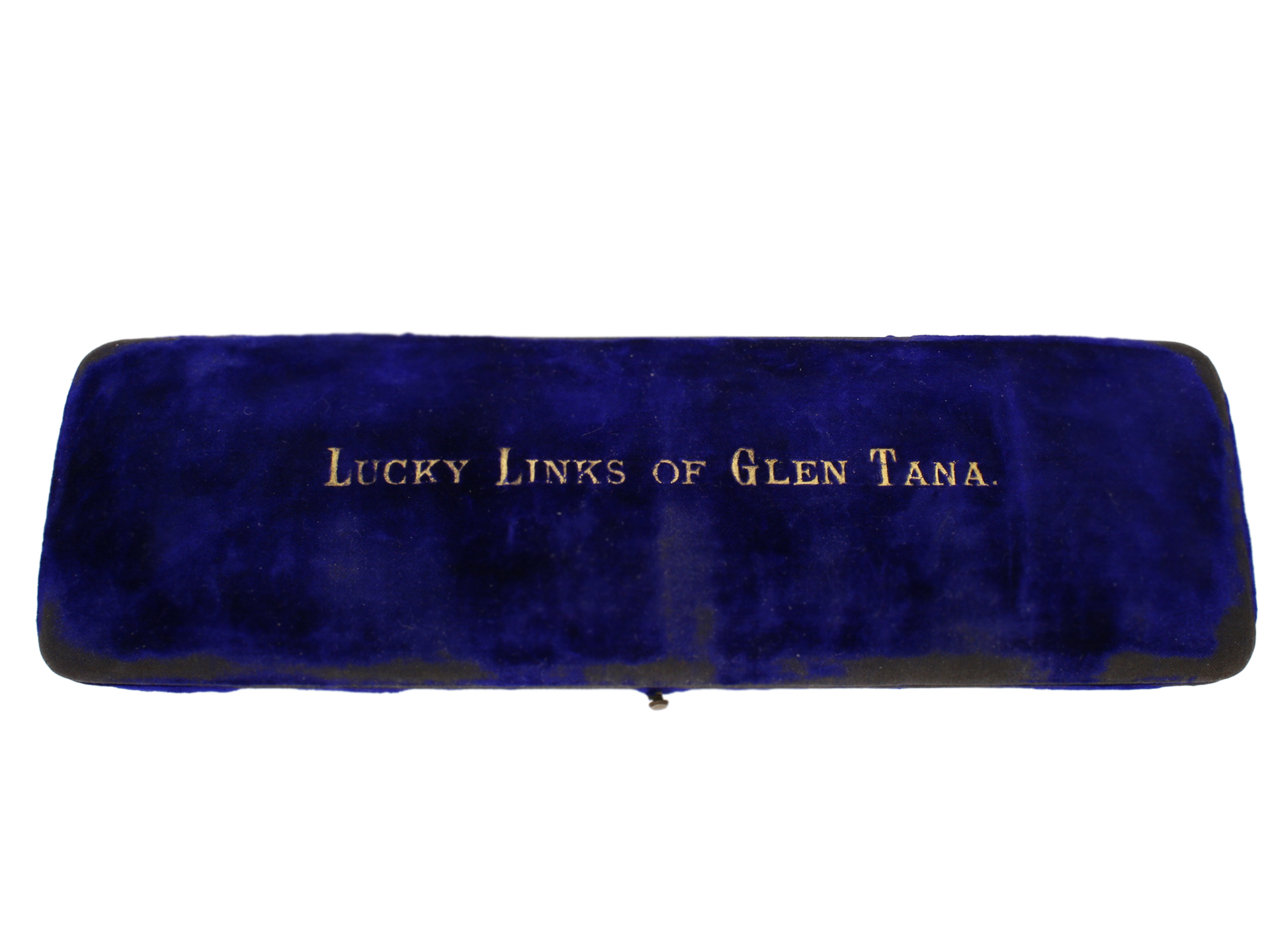 The top of the box has imprinted gold letters saying Lucky Links of Glen Tana.