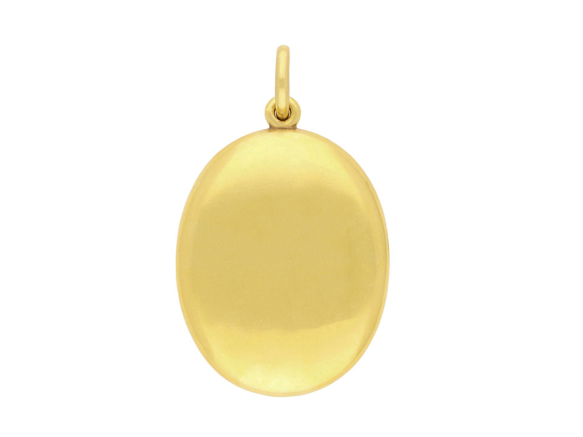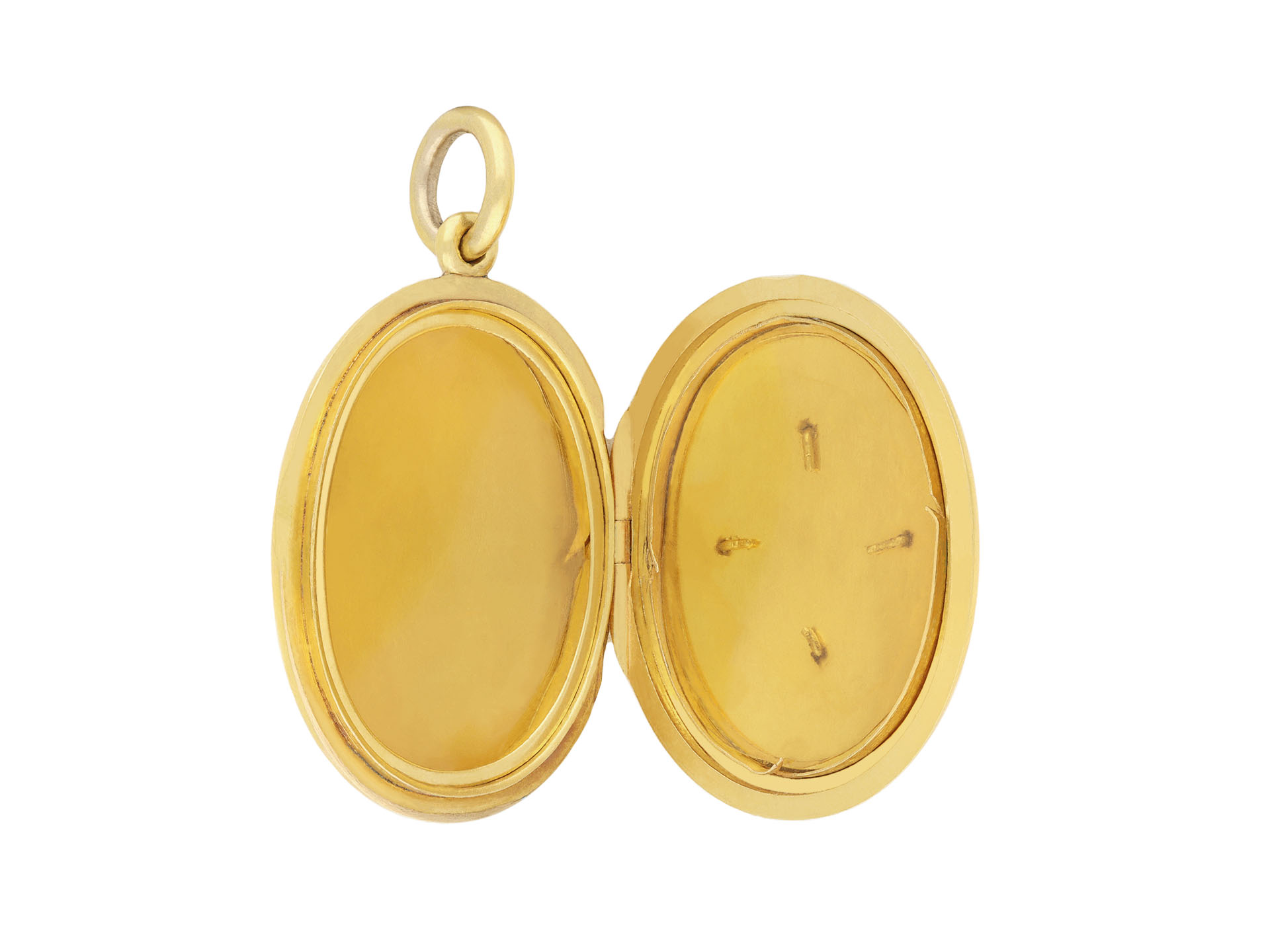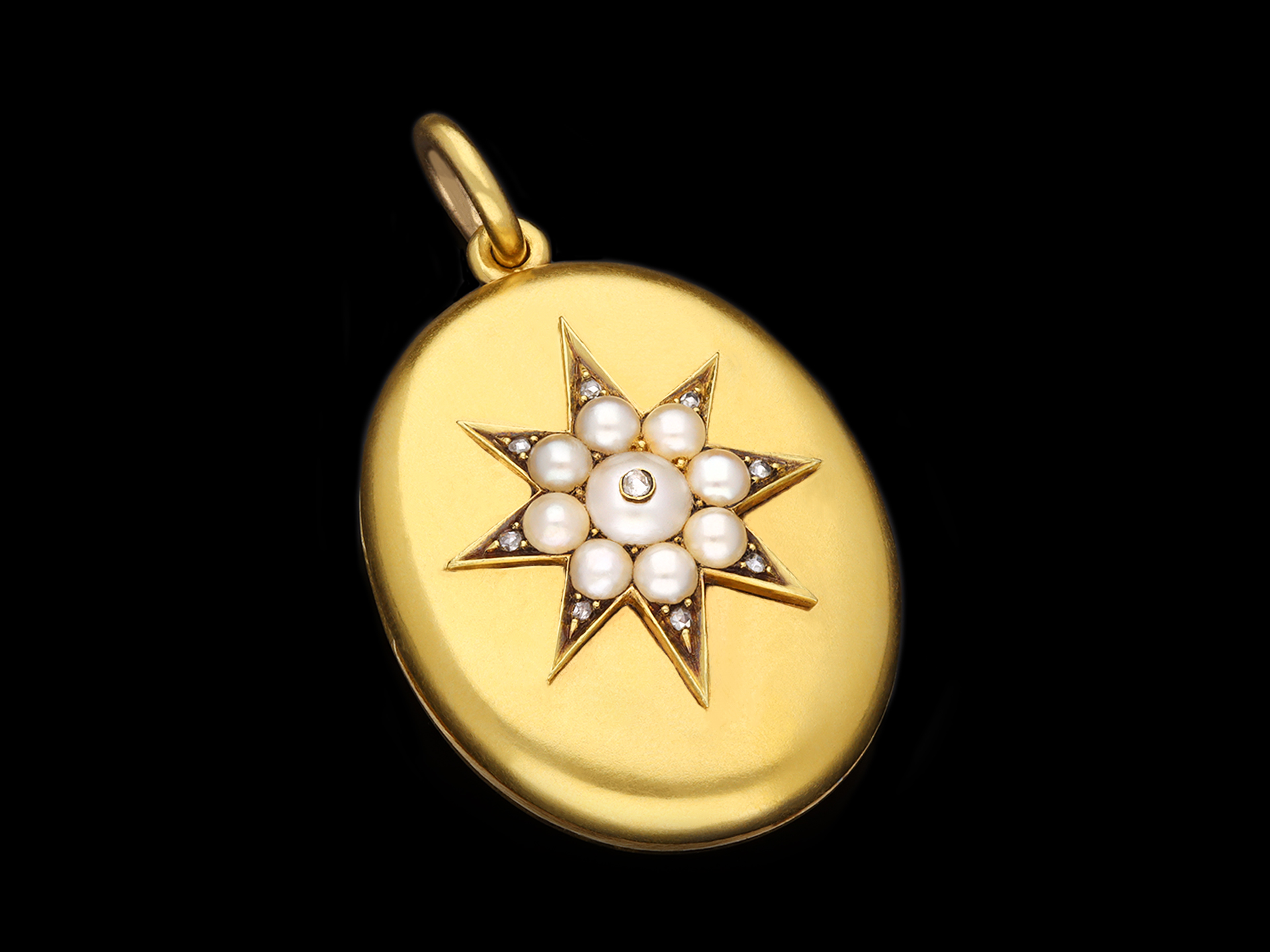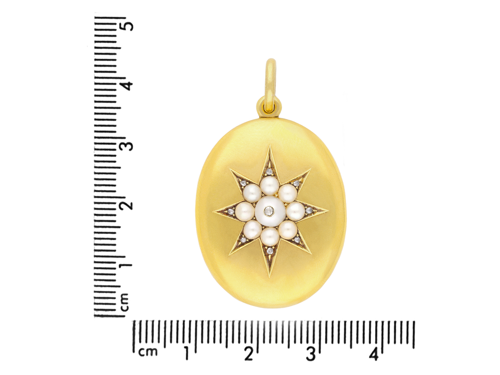 Victorian natural pearl and diamond locket. Set to centre with a natural half pearl in a closed back grain setting, encircled by a single row of eight natural half pearls in closed back grain settings, adorned throughout with nine round rose cut diamonds in closed back grain settings with a combined approximate weight of 0.16 carats, to an oval locket design, featuring a central raised star shape plaque, polished edges and closed backholing, hinged to the right and opens to display two glass compartments, fitted to top with a secure oval bale, approximately 4.0cm in length. Tested yellow gold, circa 1880.