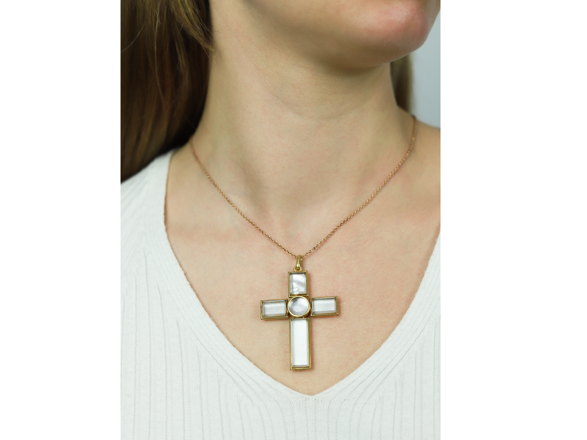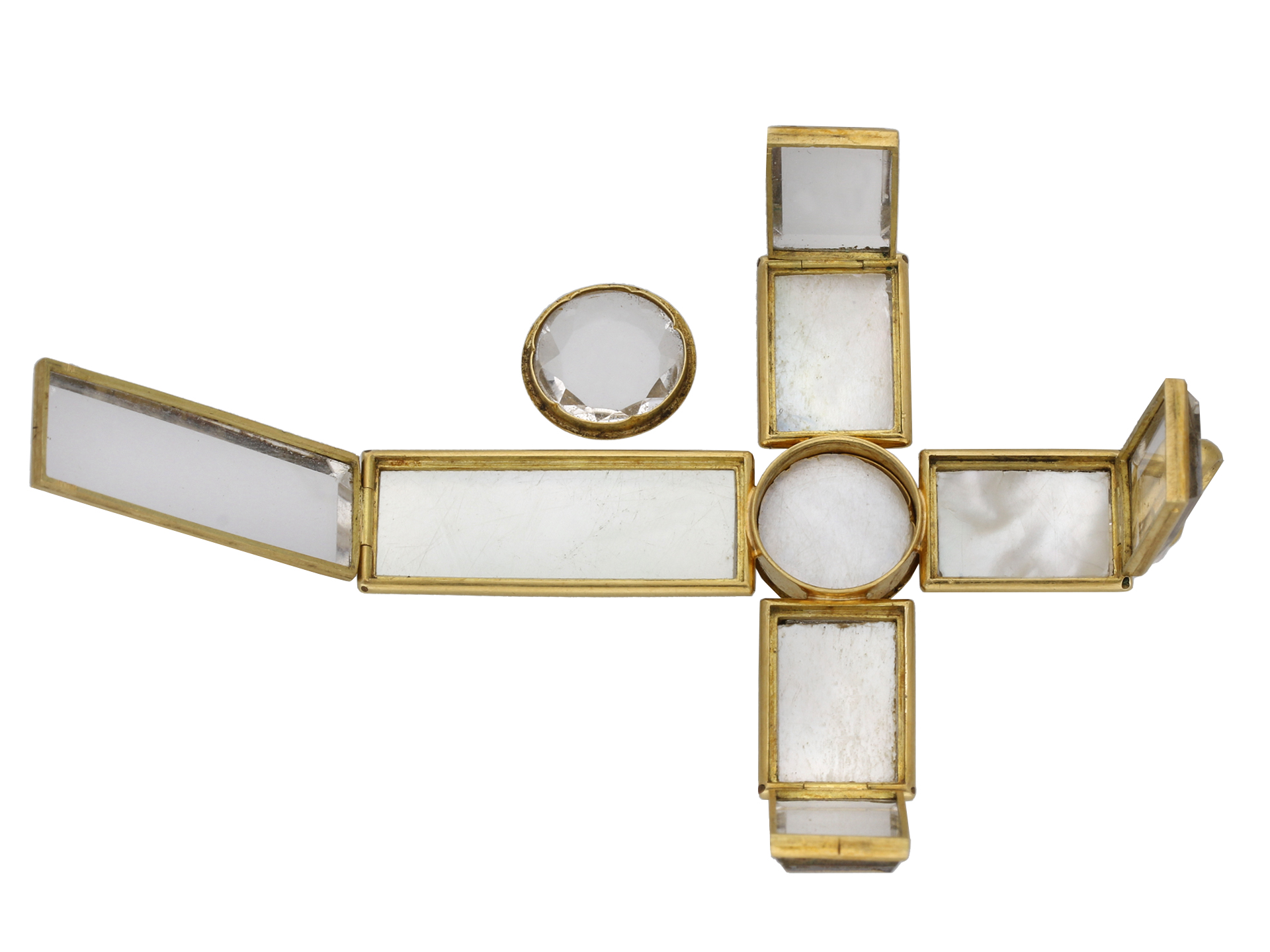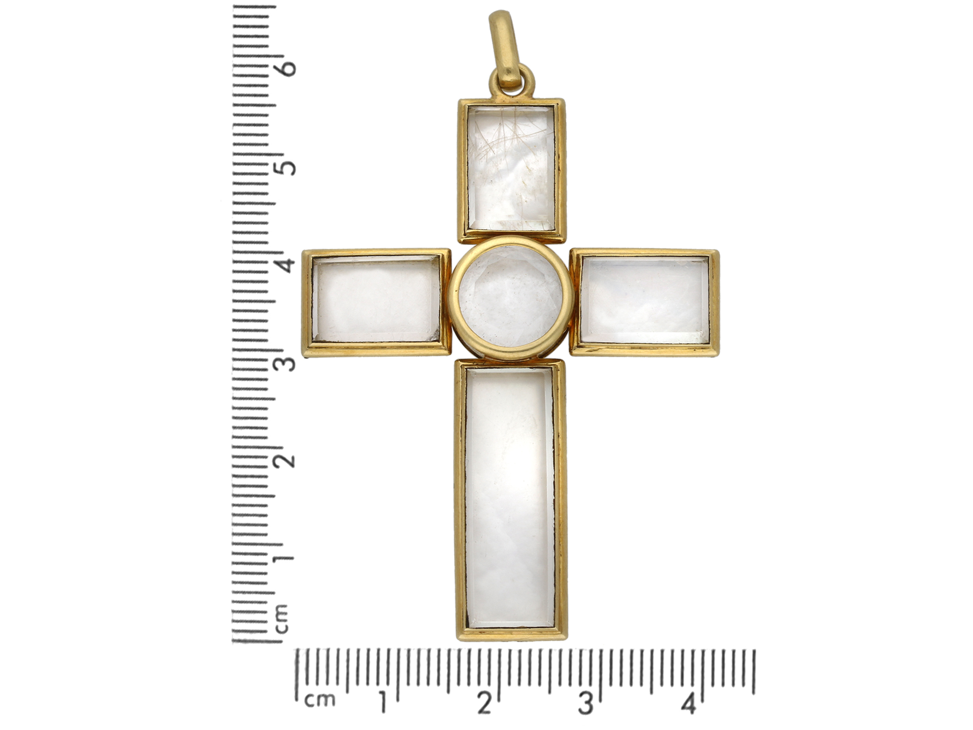Victorian rock crystal cross pendant. Set to centre with one circular faceted rock crystal compartment and flanked by four rectangular bevelled rock crystal compartments, fitted to the interior with mother of pearl plaques, further fitted to top a circular bale, approximately 6.5cm in length. Tested yellow gold, circa 1890.