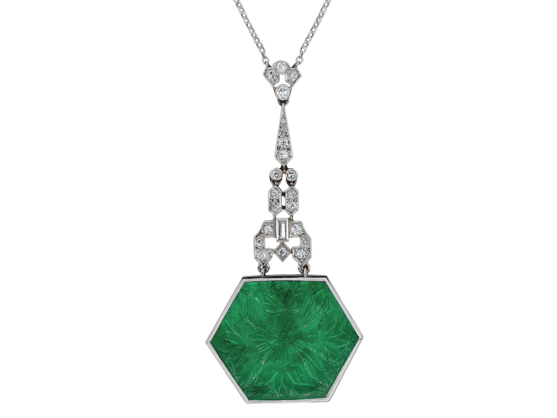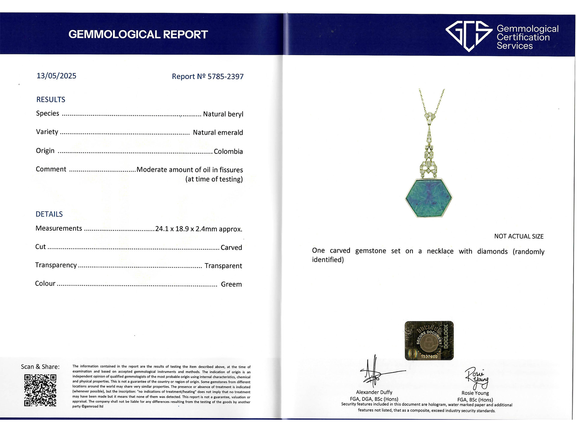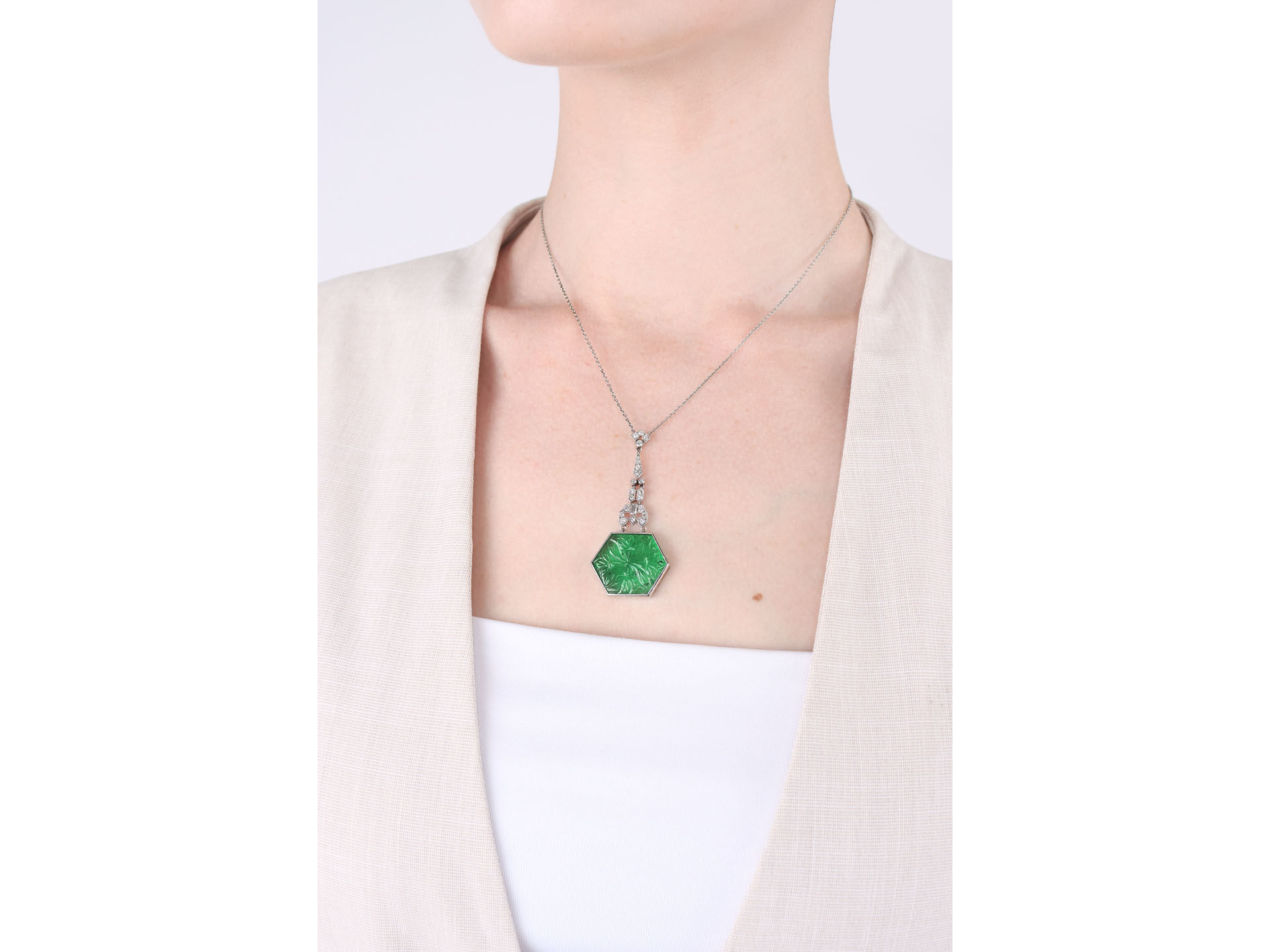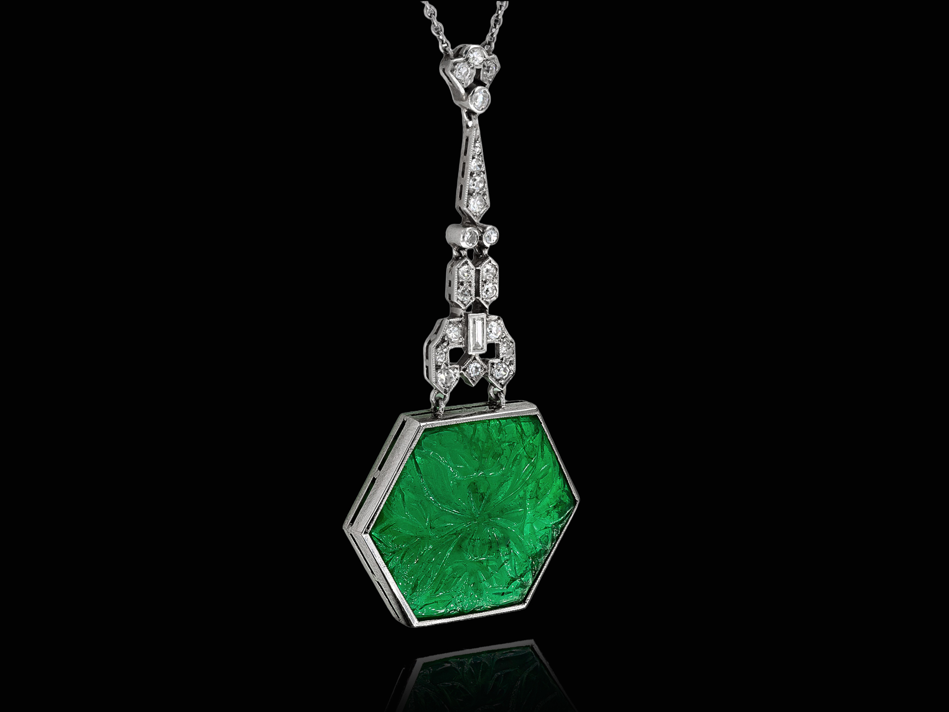 Carved emerald and diamond pendant. Set with a hexagonal natural Colombian emerald plaque carved with a stylised floral motif in a open back rubover setting, suspended from twenty one round eight cut diamonds, in open back grain and rubover settings with a combined weight of 0.40 carats, further adorned with a single rectangular baguette cut diamond in an open back rubover setting with an approximate weight of 0.10 carats. The total approximate diamond weight is 0.50 carats, to an impressive Art Deco design featuring millegrain edges, a linear pierced gallery and fancy shape open back holing, fitted to top with a fine trace chain with secure C-clasp and additional safety chain, pendant approximately 5.5cm in length, chain approximately 16" in length. Tested platinum, chain tested white gold, circa 1925, accompanied by Gemmological Certification Services report #5785-2397.