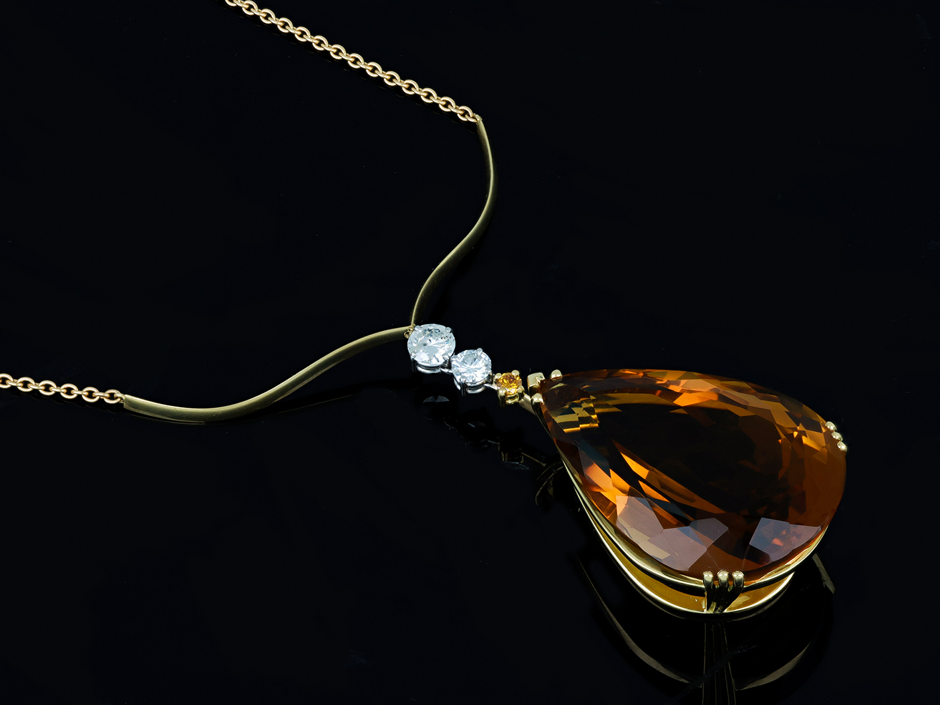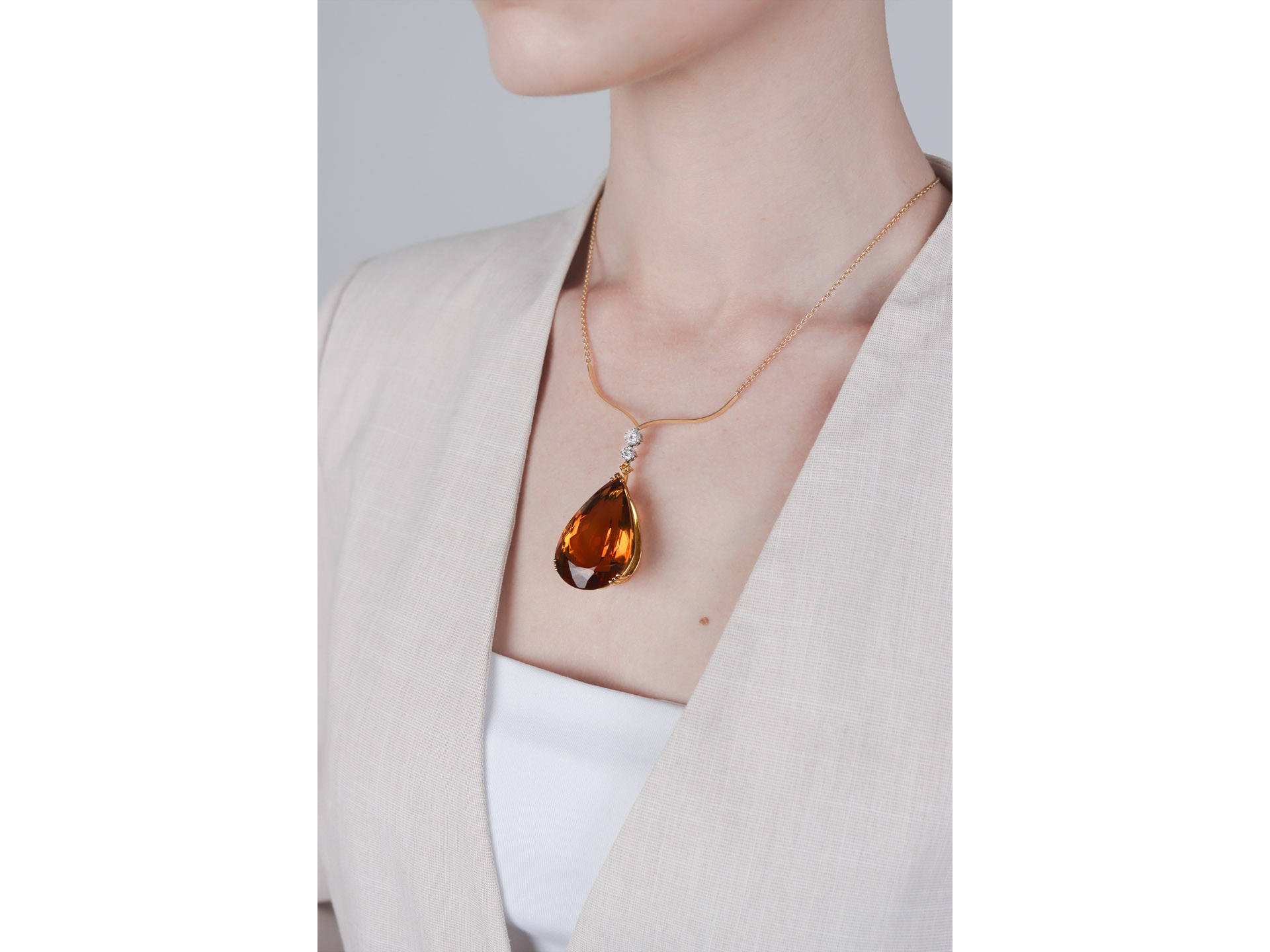 Citrine and diamond pendant. Set to centre with a drop shape mixed cut natural citrine in an open back claw setting with an approximate weight of 80.00 carats, suspended from one round brilliant cut fancy yellow diamond in an open back claw setting with an approximate weight of 0.07 carats, further suspended from two round brilliant cut diamonds in open back claw settings with a combined approximate weight of 0.80 carats. The total approximate diamond weight is 0.87 carats, to a impressive pendant, flowing with movement featuring curving claws, a decorative pierced gallery and open backholing, fitted with a integrated stationary fitting attached to a fine trace chain terminating in a secure C-clasp, pendant approximately 5.5cm in length, chain approximately 16" in length. Pendant and chain tested yellow gold settings tested platinum and yellow gold, circa 1980.