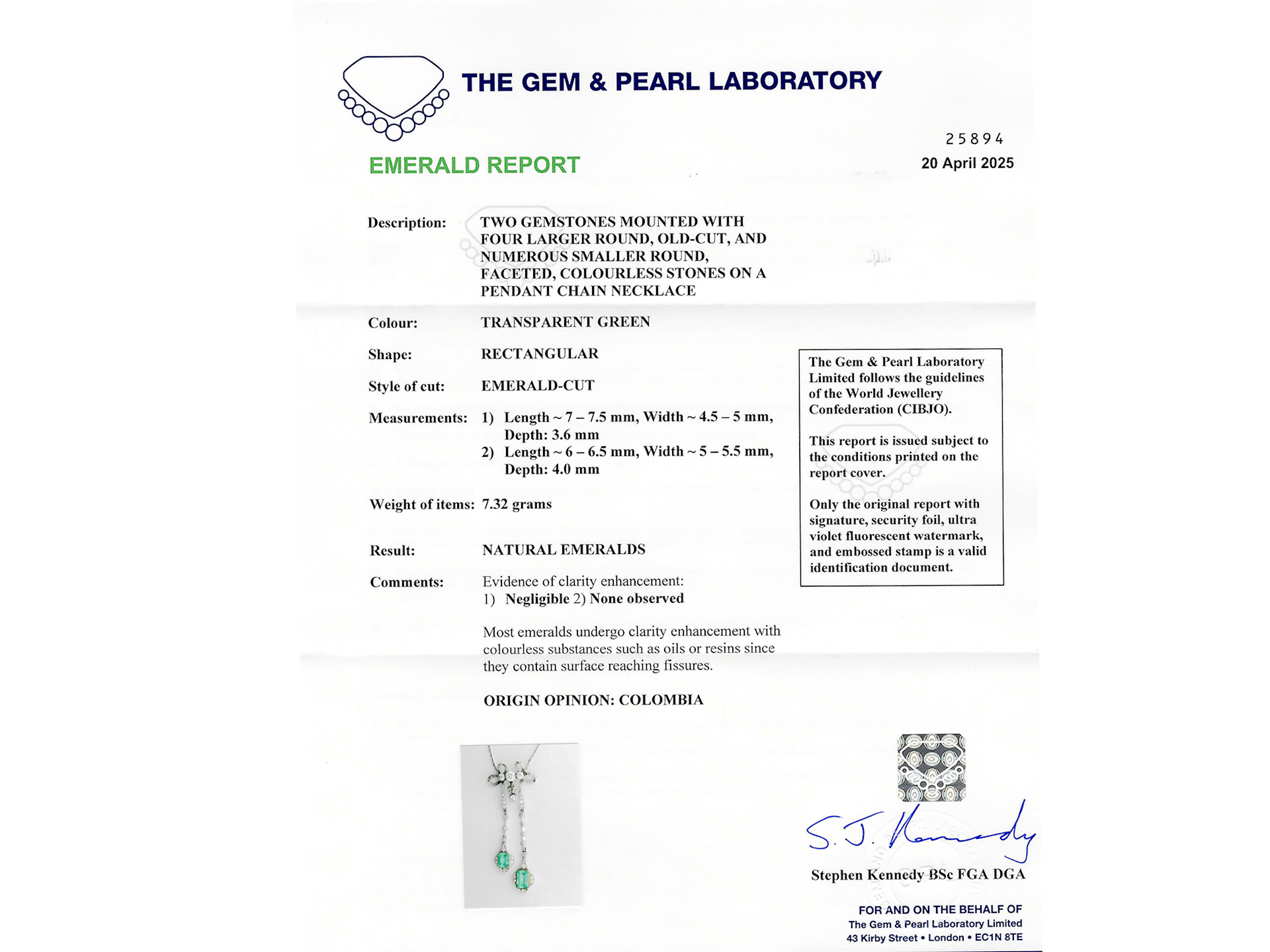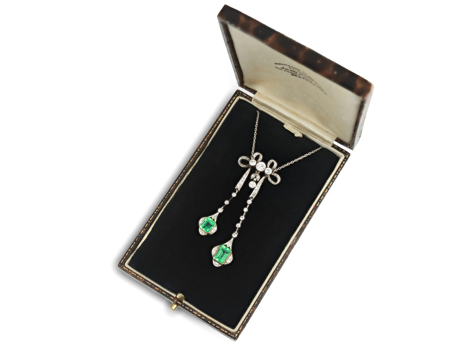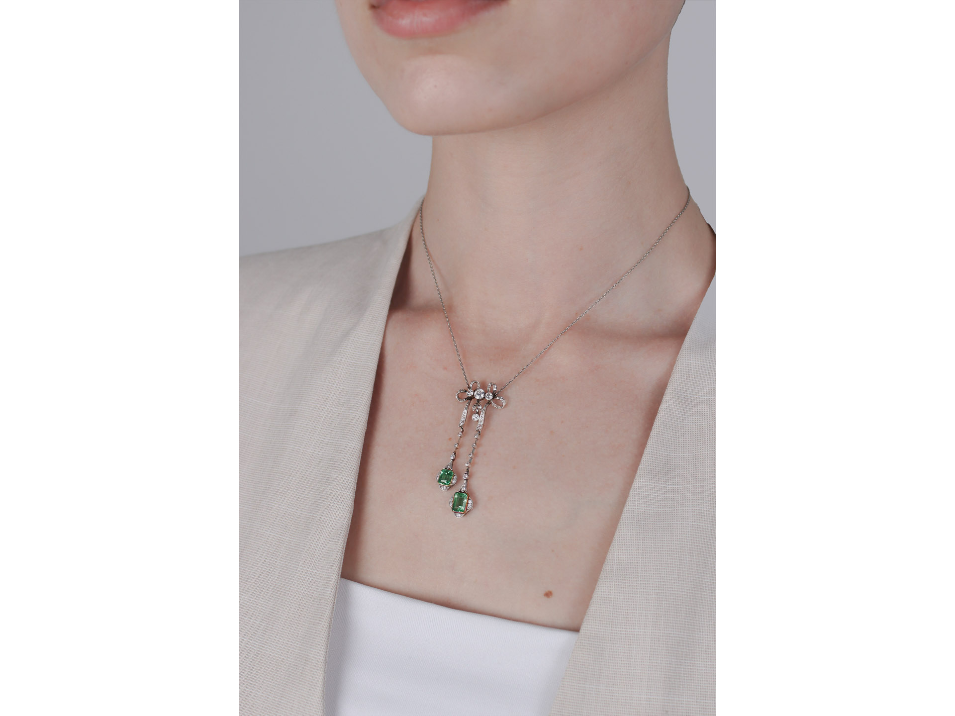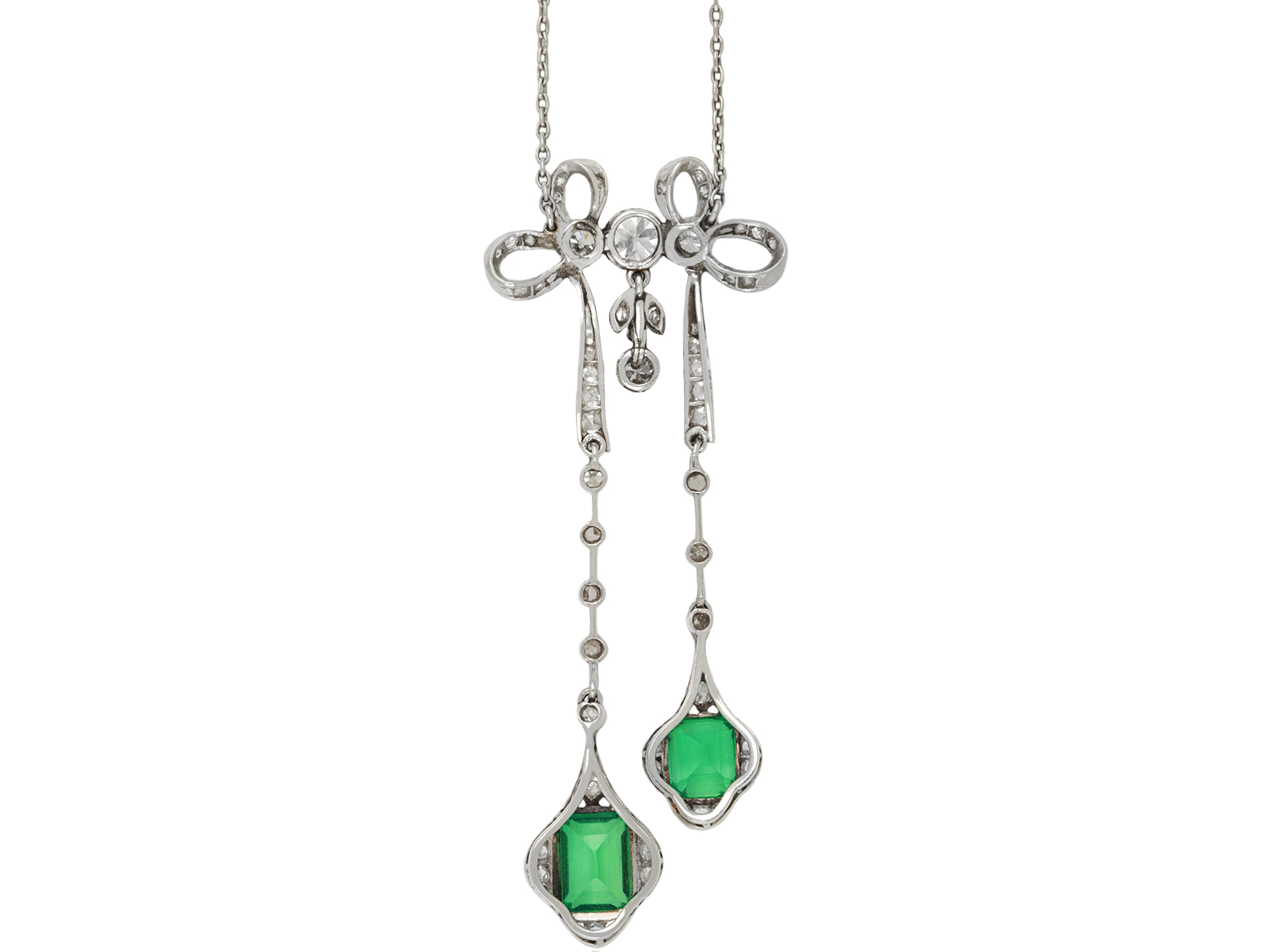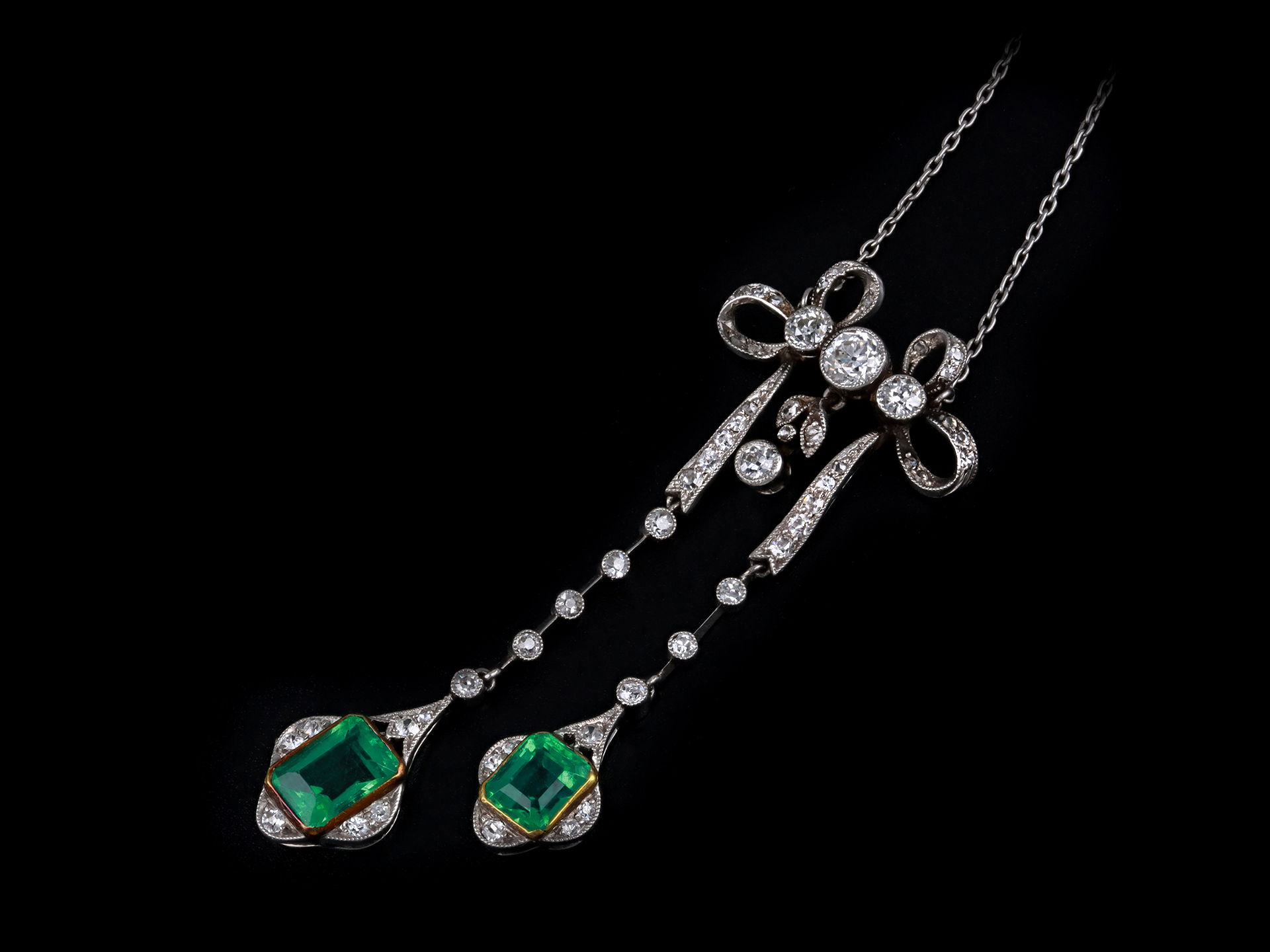 Colombian emerald and diamond negligée pendant. Set to the lower drop with an octagonal emerald-cut natural Colombian emerald with no oil in an open back rubover setting with an approximate weight of 1.00 carats, the higher drop set with an octagonal emerald-cut natural Colombian emerald with negligible clarity enhancement in an open back rubover setting with a weight of 0.96 carats, further adorned with fifty-one round mixed old cut diamonds in open back grain and rubover settings with a combined approximate weight of 1.11 carats. The total approximate emerald weight is 1.96 carats, to an elegant negligée pendant, flowing with movement, featuring openwork bows and ribbon motifs with millegrain edging and fancy open backholing, fitted with a fine trace link chain to top with a secure spring bolt ring clasp, pendant approximately 5.5cm in length, chain approximately 16" in length. Pendant tested platinum with yellow gold settings, chain tested platinum, circa 1905, accompanied by original fitted box, accompanied by The Gem and Pearl Laboratory report #25894.