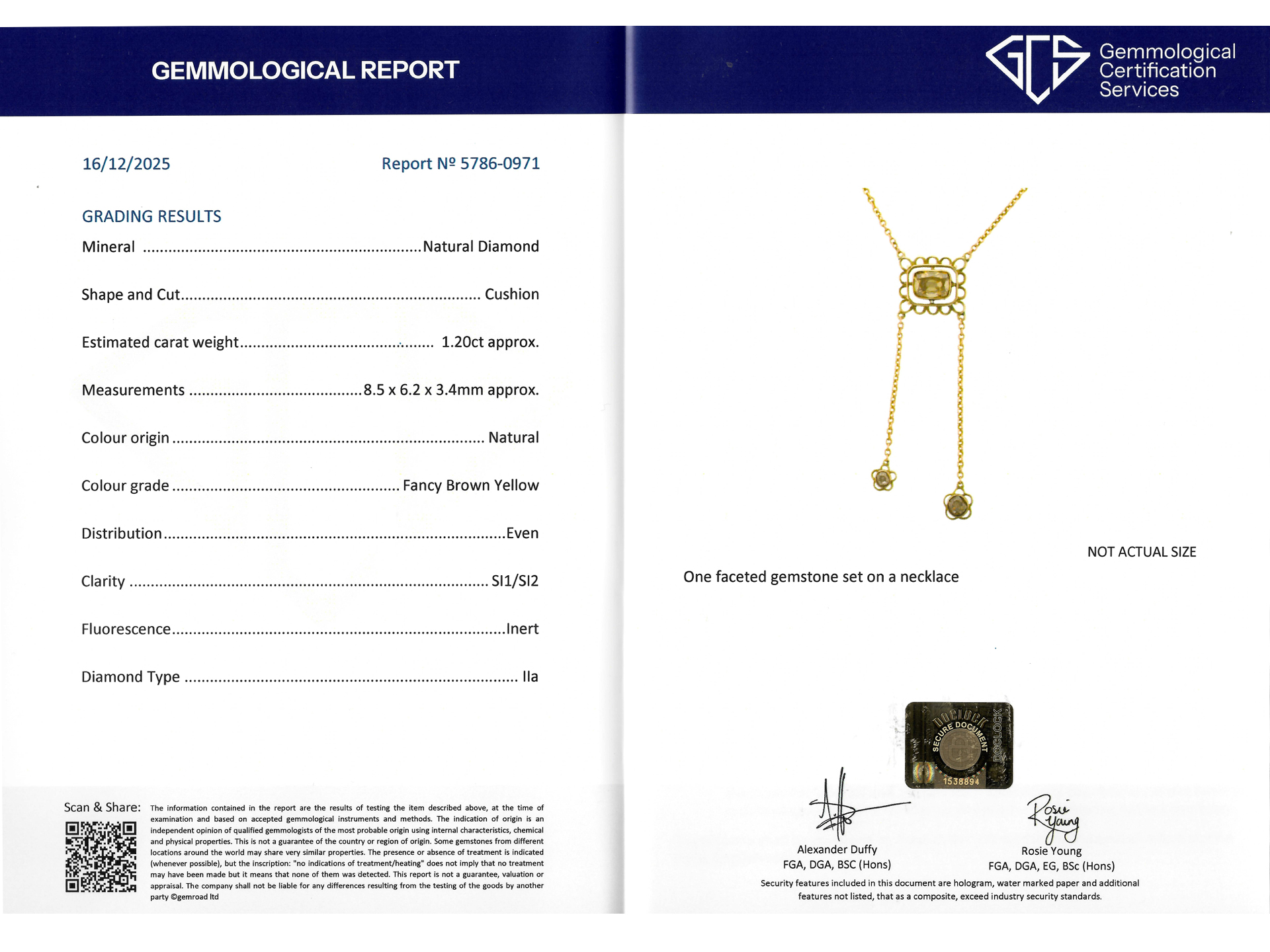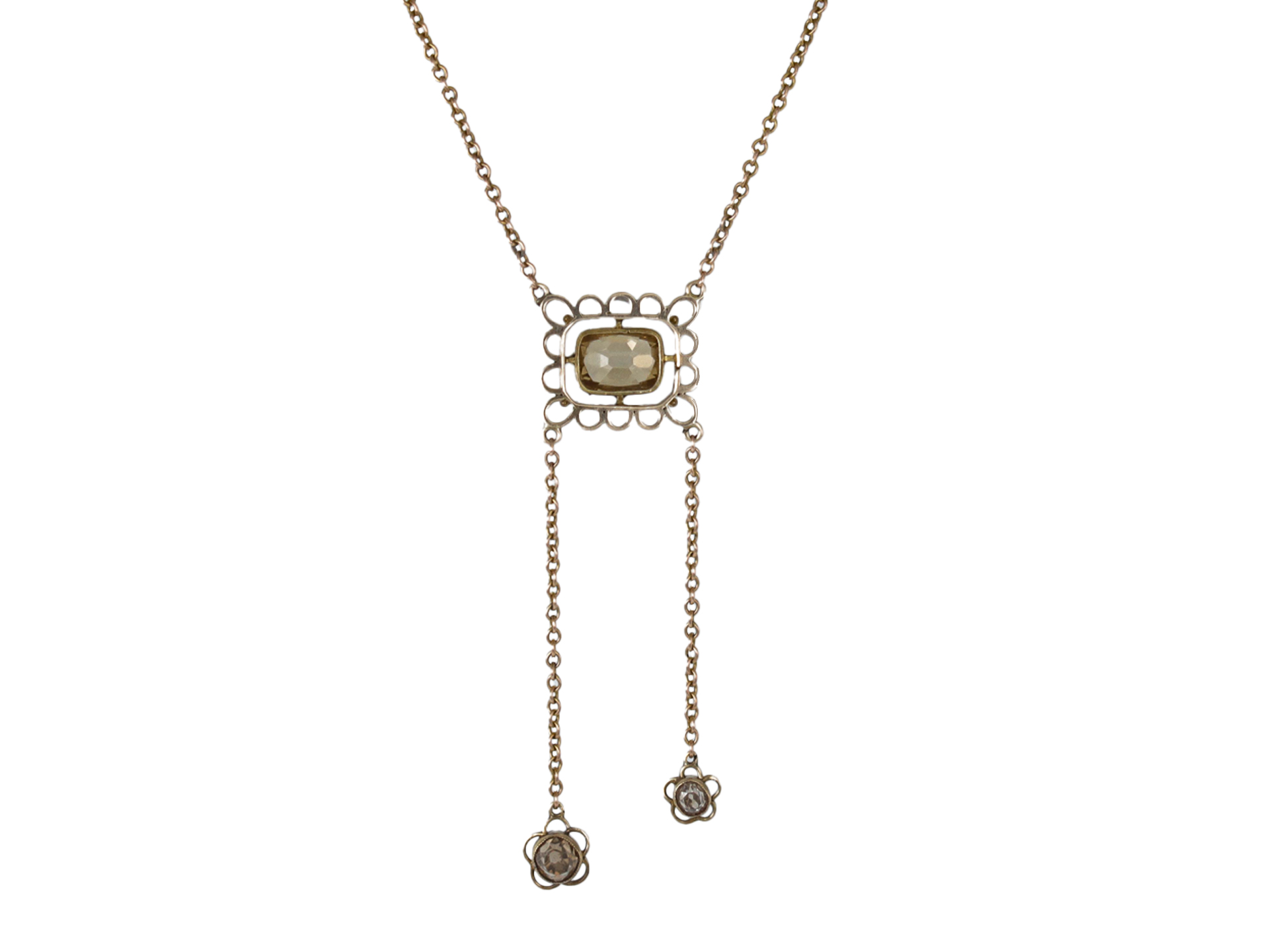 Fancy brown yellow diamond negligee pendant. Set with a cushion shape old mine natural fancy brown yellow diamond, SI1/SI2 clarity, with an approximate weight of 1.20 carats in an open back rubover setting, further decorated with two cushion shape old mine diamonds in open back rubover settings with a combined weight of 0.70 carats. The total approximate diamond weight is 1.90 carats, to an elegant negligee design featuring scalloped framework, millegrain edging and fancy shape open backholing, fitted to top with a fine trace chain and c-clasp, pendant approximately 6cm in length, chain approximate 18" in length. Tested rose gold and clasp marked 9 carat gold, circa 1915, accompanied by Gemmological Certification Services report #5786-0971.