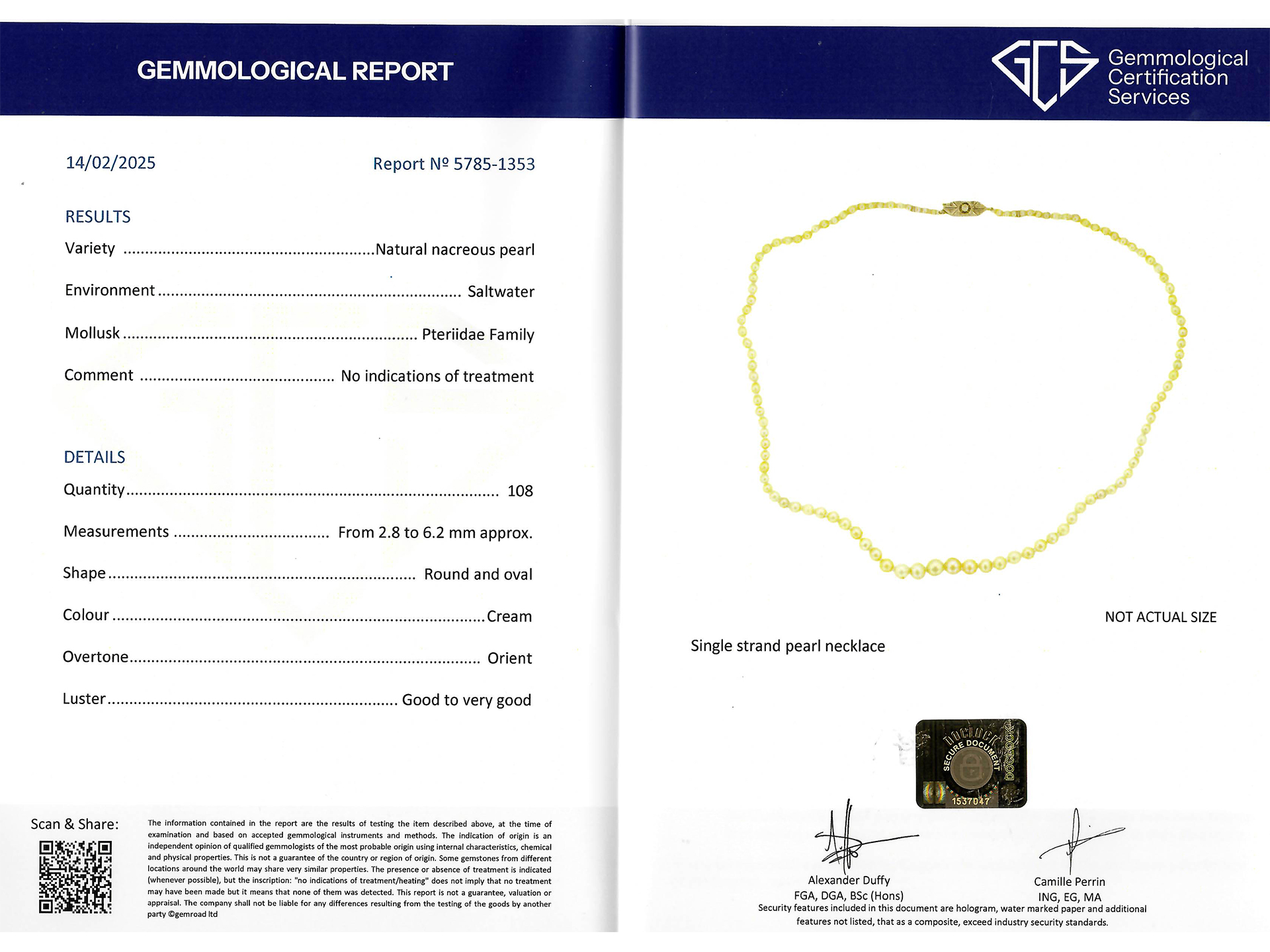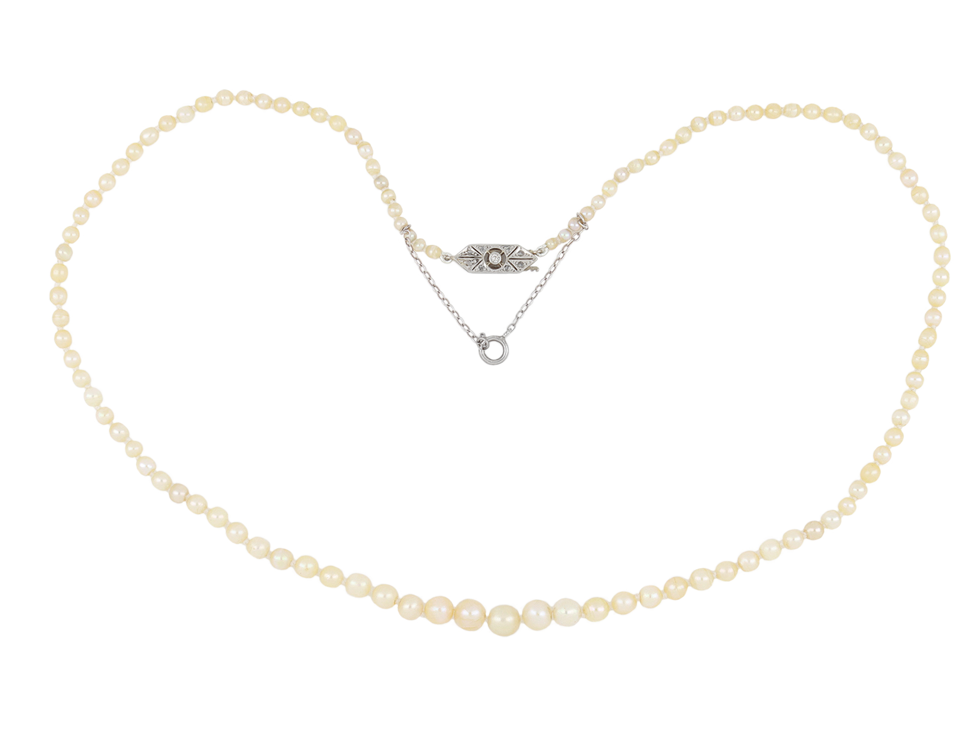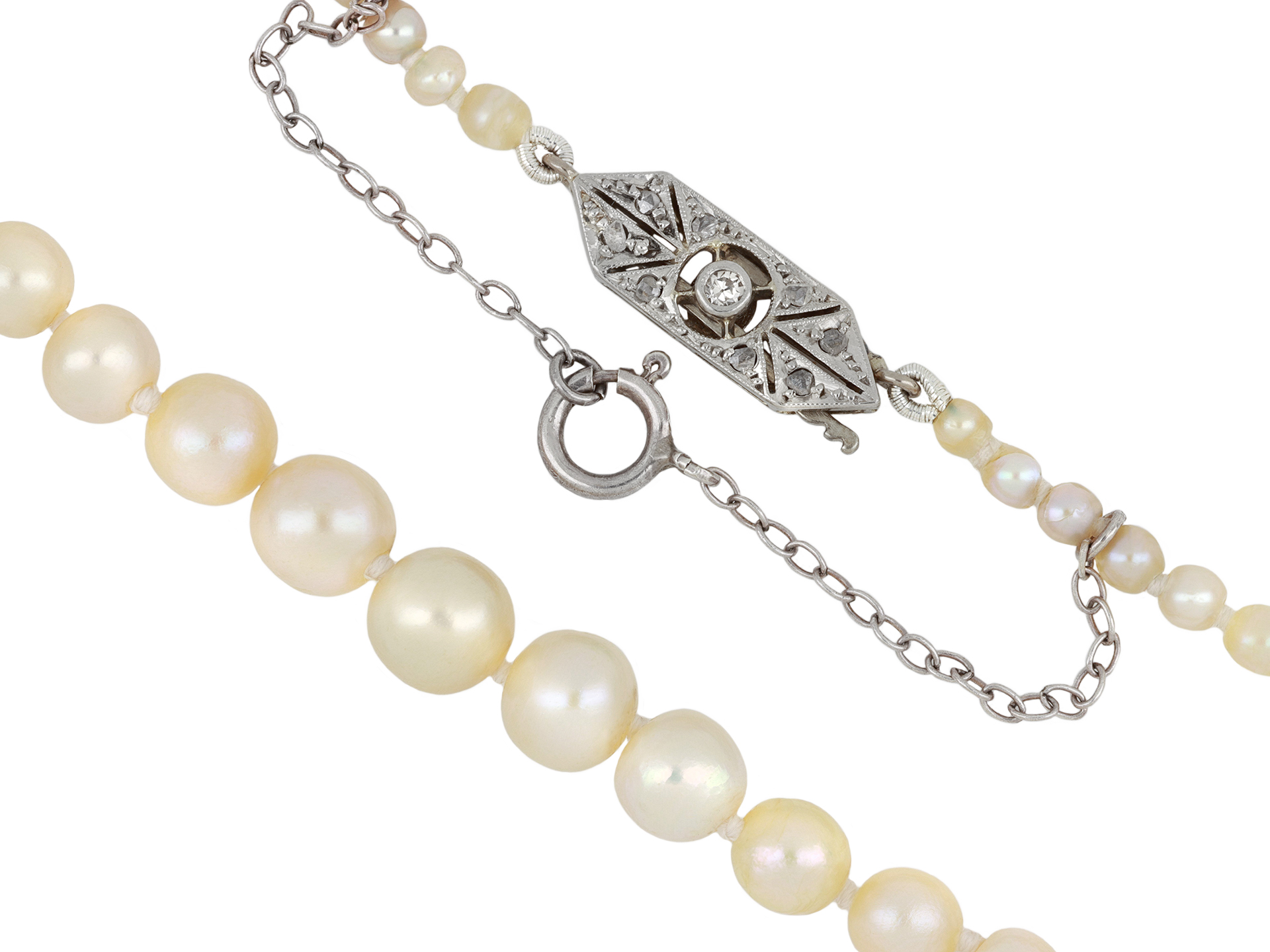 Natural pearl and diamond necklace. Set with one hundred and eight natural saltwater pearls, measurements ranging from approximately 2.8mm to 6.2mm, clasp centrally set with one round eight cut diamond in an open back rubover setting with an approximate weight of 0.03 carats, accented with eight round rose cut diamonds in open back grain settings with a combined weight of 0.08 carats. The total approximate diamond weight is 0.11 carats, to an elegantly graduating single strand design, fitted with an intricate push clasp with millgrain borders and trace link safety chain, necklace approximately 18" in length. Tested platinum and chain tested silver, circa 1930, accompanied by Gemmological Certification Services report #5785-1353, accompanied by fitted box.