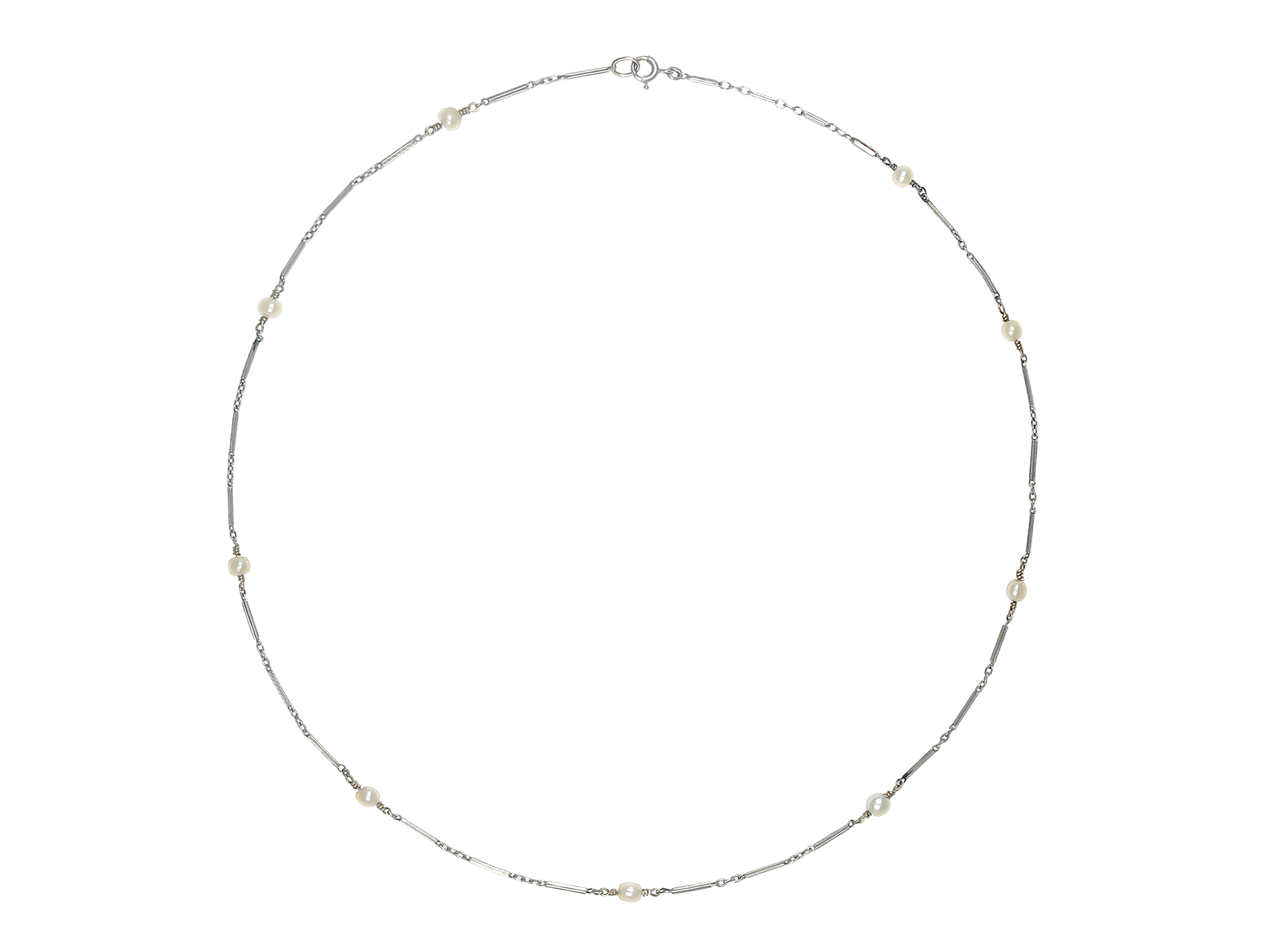 Natural pearl chain. Set with nine round natural pearl beads spaced on a fine fancy bar link chain, fitted with a secure C-clasp, approximately 15.5" in length. Chain tested platinum, clasp marked 14 carat white gold, circa 1920.