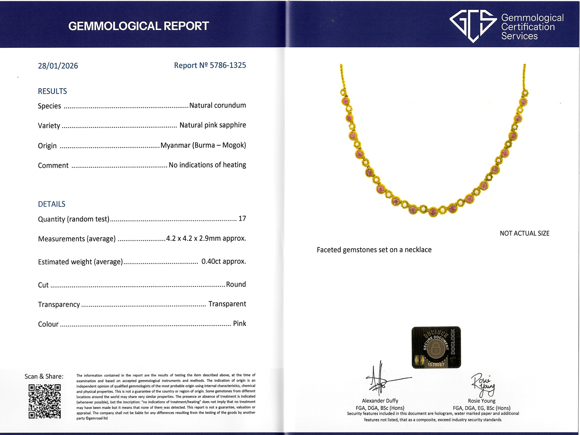 Pink Burmese sapphire and pearl necklace. Set with seventeen natural no heat pink Burmese sapphires in open back rubover settings with a combined approximate weight of 6.80 carats, further decorated with nineteen natural button shaped pearls in closed back settings, to an exceptional cannetille design featuring floral motifs, intricate rope-work and open and closed backholing, fitted with a secure push clasp with floral motif, approximately 15.5" in length. Tested yellow gold, circa 1880, accompanied by Gemmological Certification Services report #5786-1325, and fitted antique box.