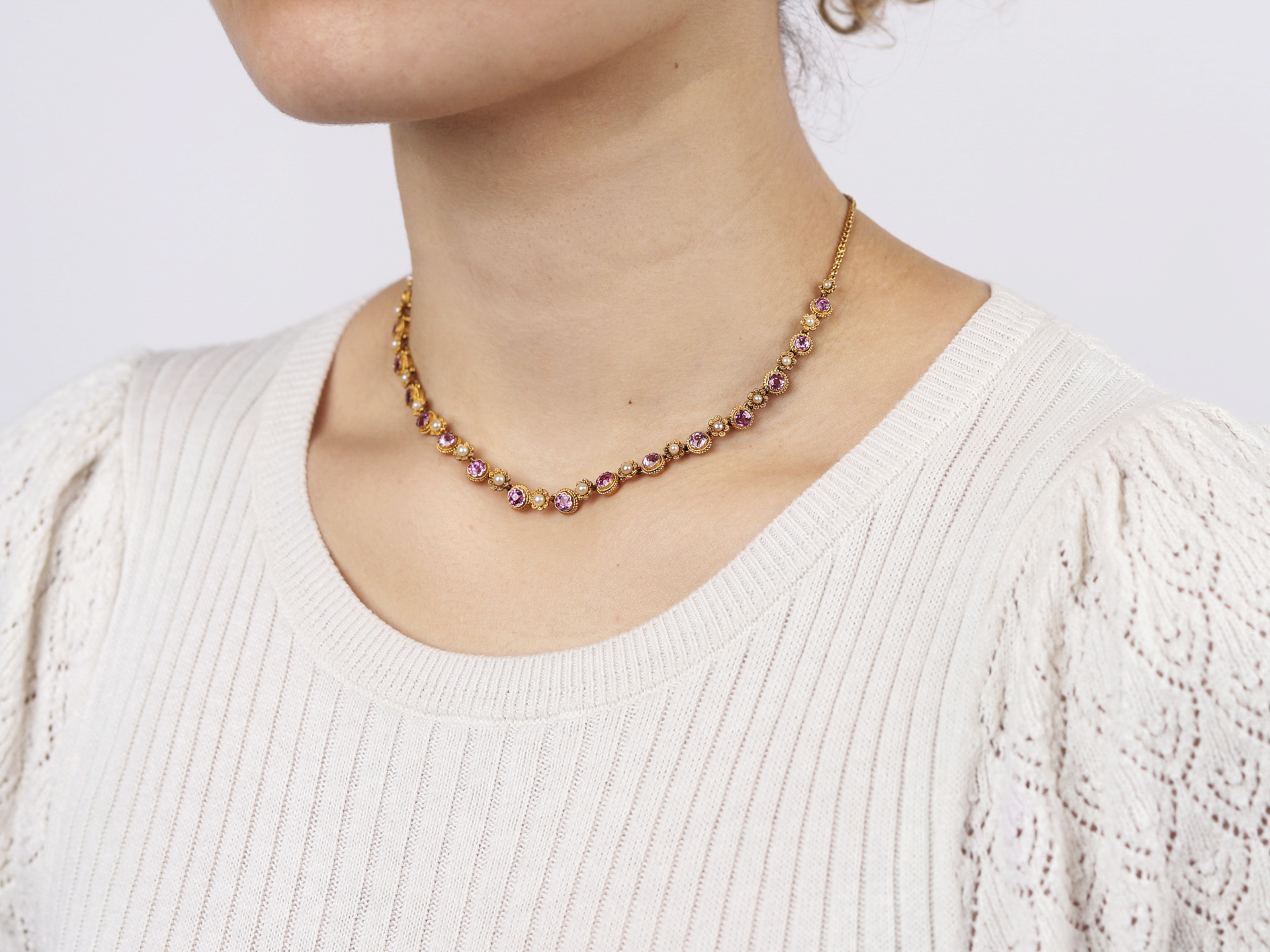 Pink Burmese sapphire and pearl necklace, circa 1880.