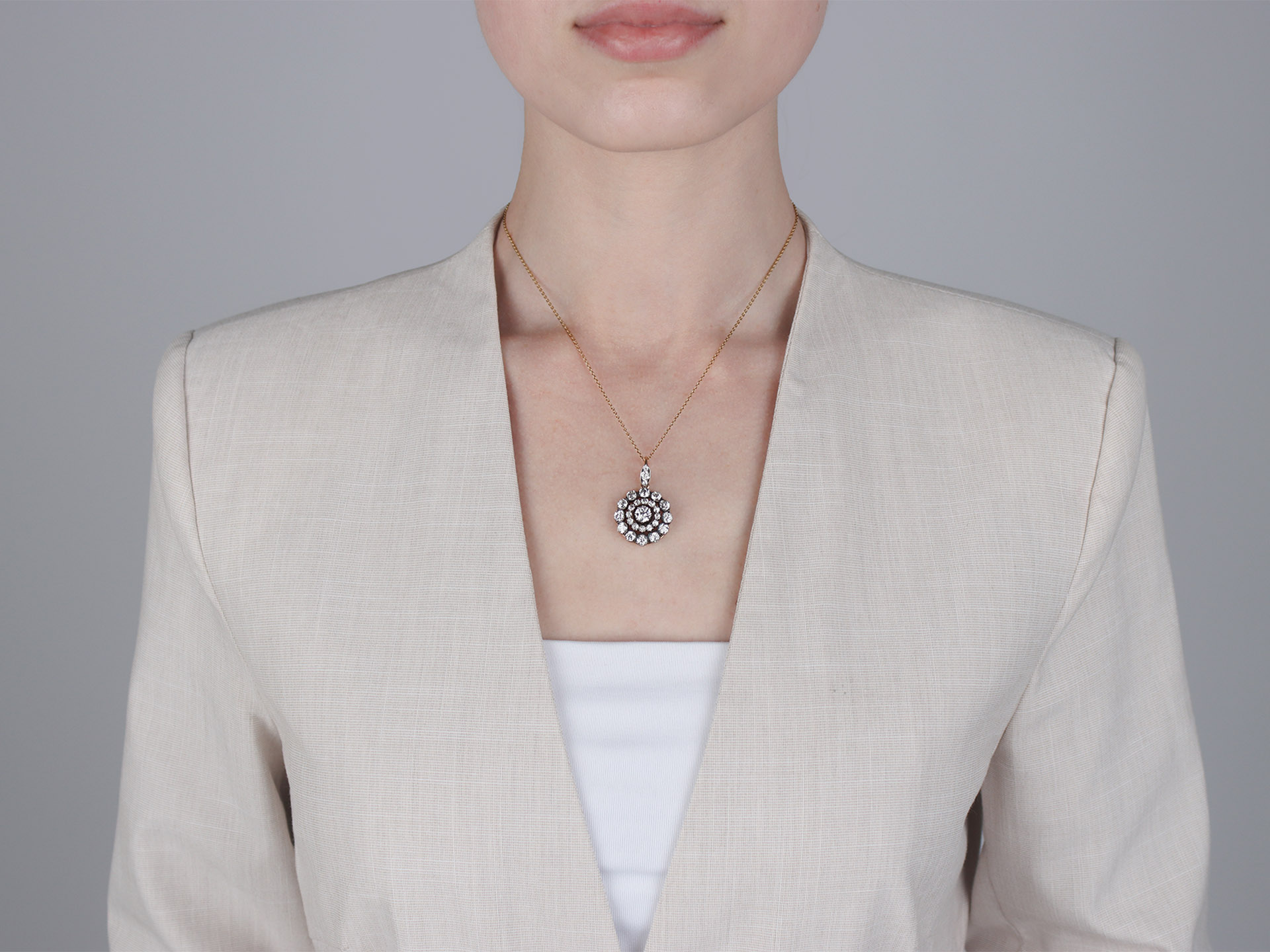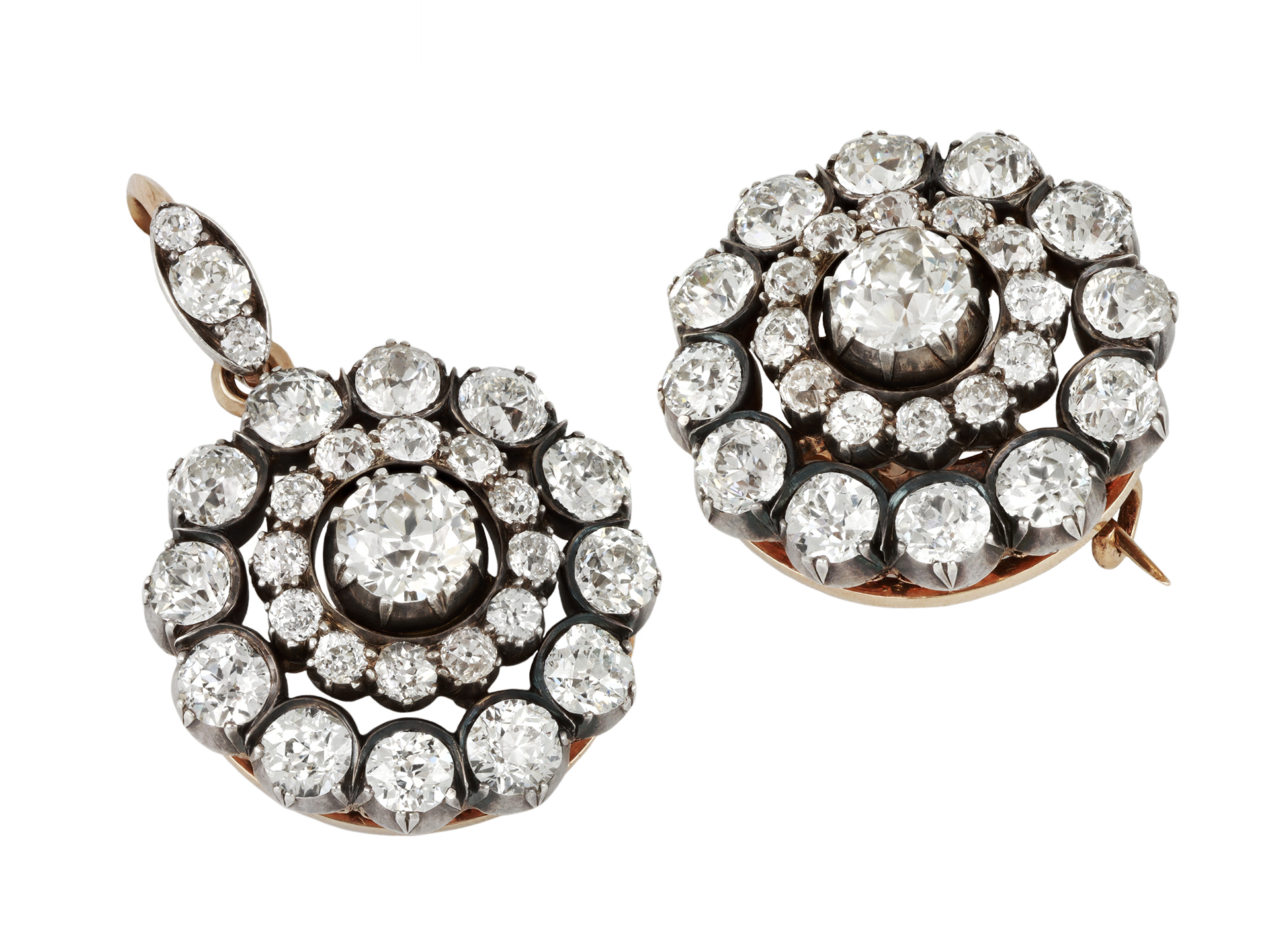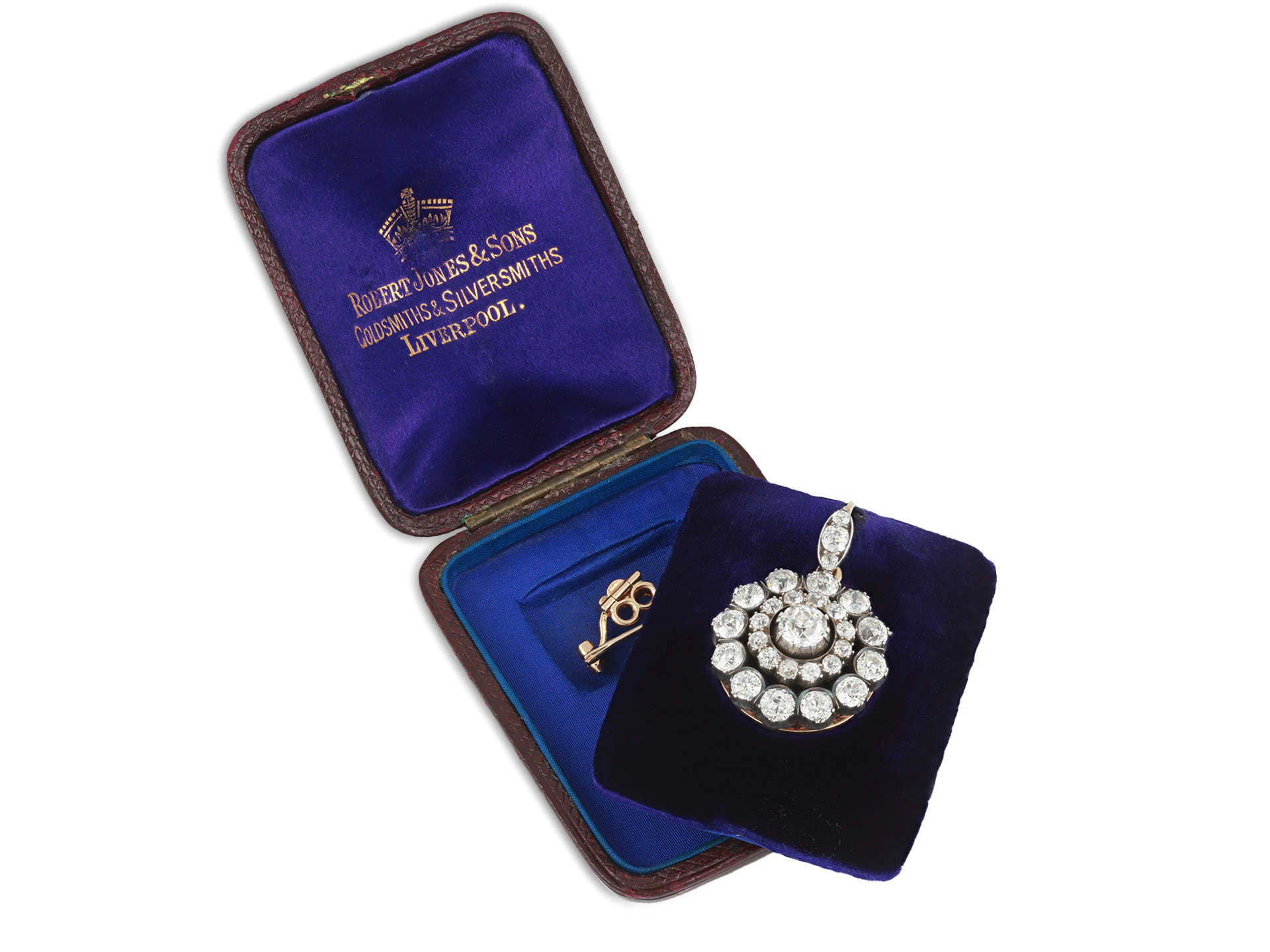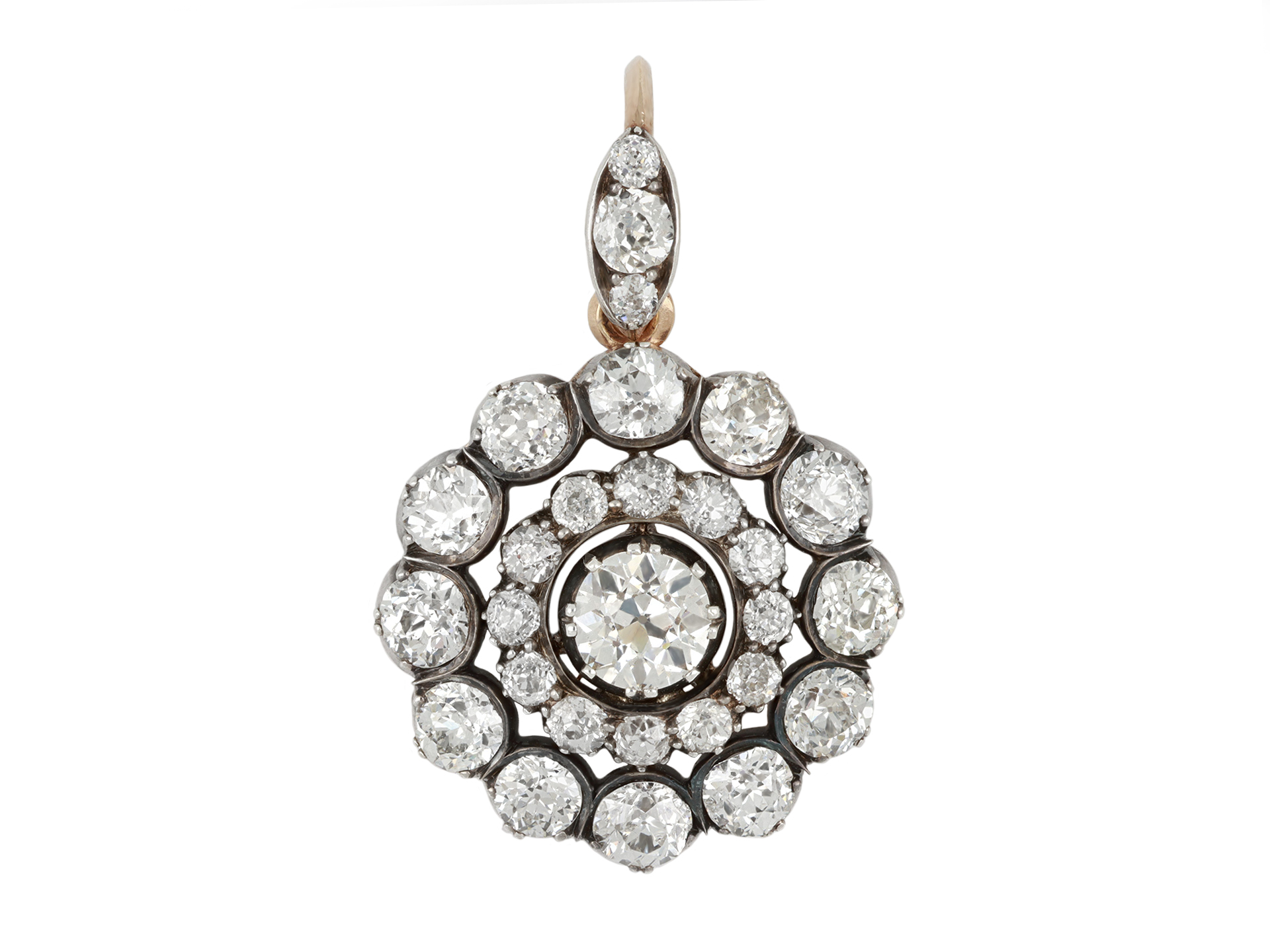 Victorian diamond cluster pendant. Set to centre with a round old cut diamond in an open back cut-down setting with an approximate weight of 0.70 carats, encircled by twenty-four round old cut diamonds in open back cut-down settings with a combined weight of 3.35 carats and decorated to the bale with three round old cut diamonds in open back grain settings with a combined weight of 0.20 carats. The total approximate diamond weight is 4.25 carats, to a convertible pendant/brooch design featuring openwork details, a scalloped gallery and fancy shape open backholing, fitted to top with a removable bale, pendant approximately 3.4cm in length. Tested yellow gold with silver settings, circa 1880, accompanied by original fitted box with compartment to store brooch pin underneath.