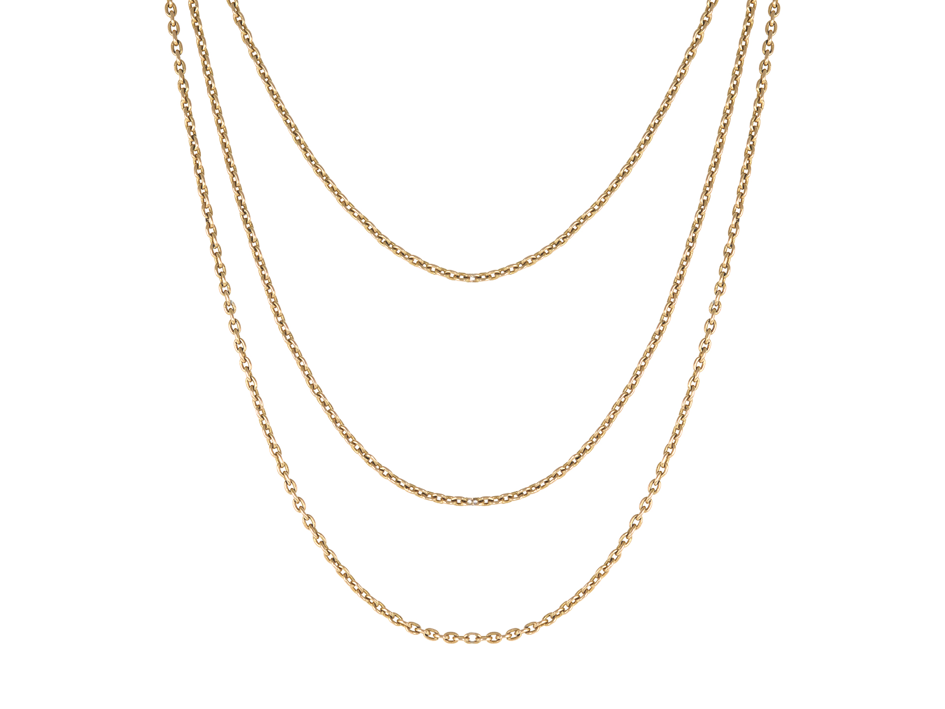 Victorian longuard chain. An elegant trace chain comprised of interlocking oval links, terminating in a secure swivel clasp, with an approximate length of 102.3 inches. Marked 15 carat yellow gold, approximately 18.75 grams in weight, circa 1900.