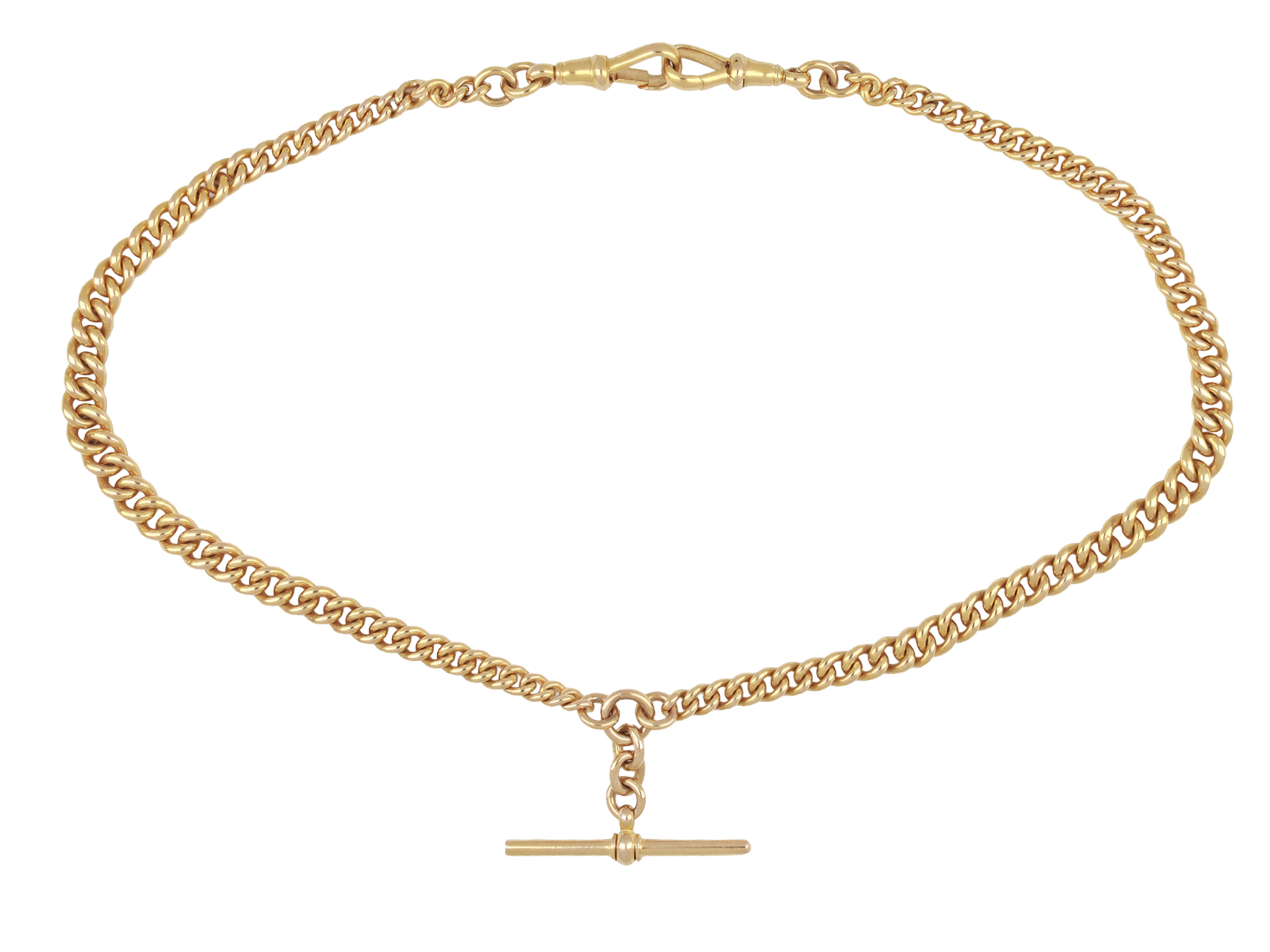 Gold Albert chain by William Henry Adams. A yellow gold Albert chain, suspending a T-bar pendant and chain section, all to a graduating curb link chain, fitted to both ends with a secure lobster clasp, approximately 16.5" in length. Marked 9 carat yellow gold, approximate 47.6 grams in weight, maker's mark 'W.H.A' for William Henry Adams, Chester, English, circa 1890.