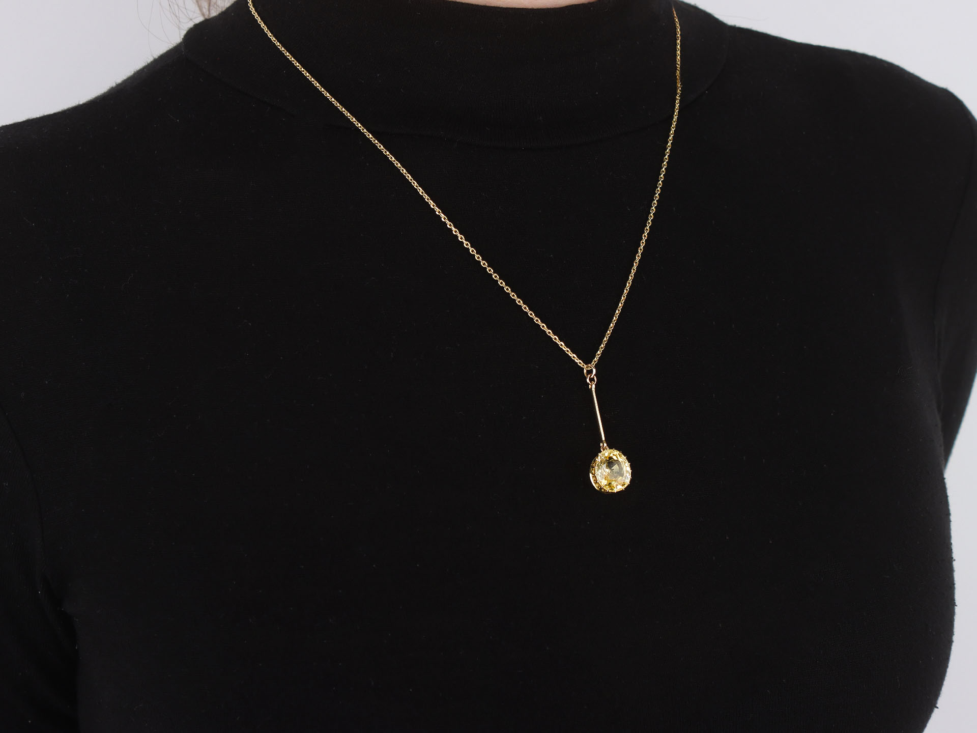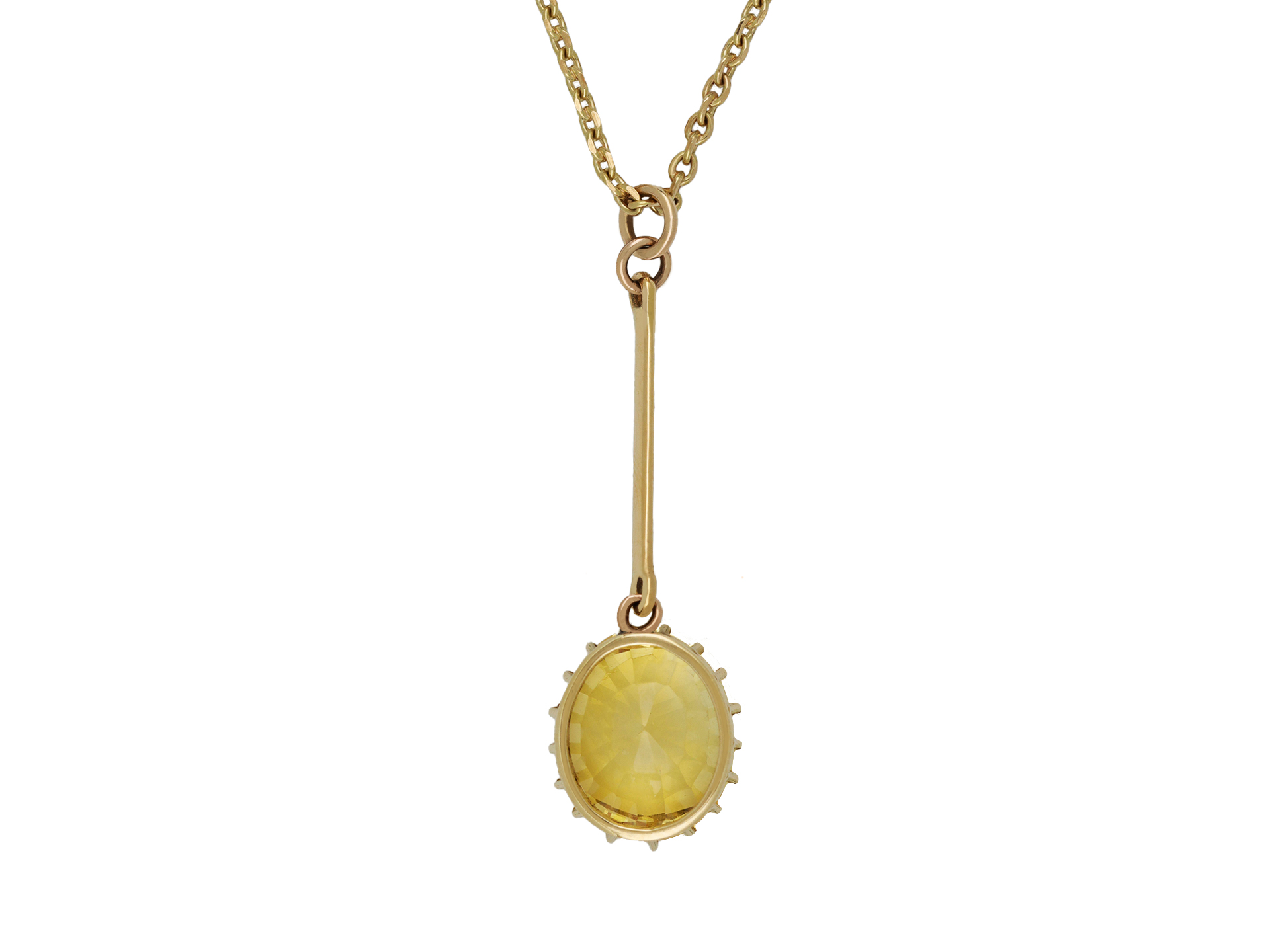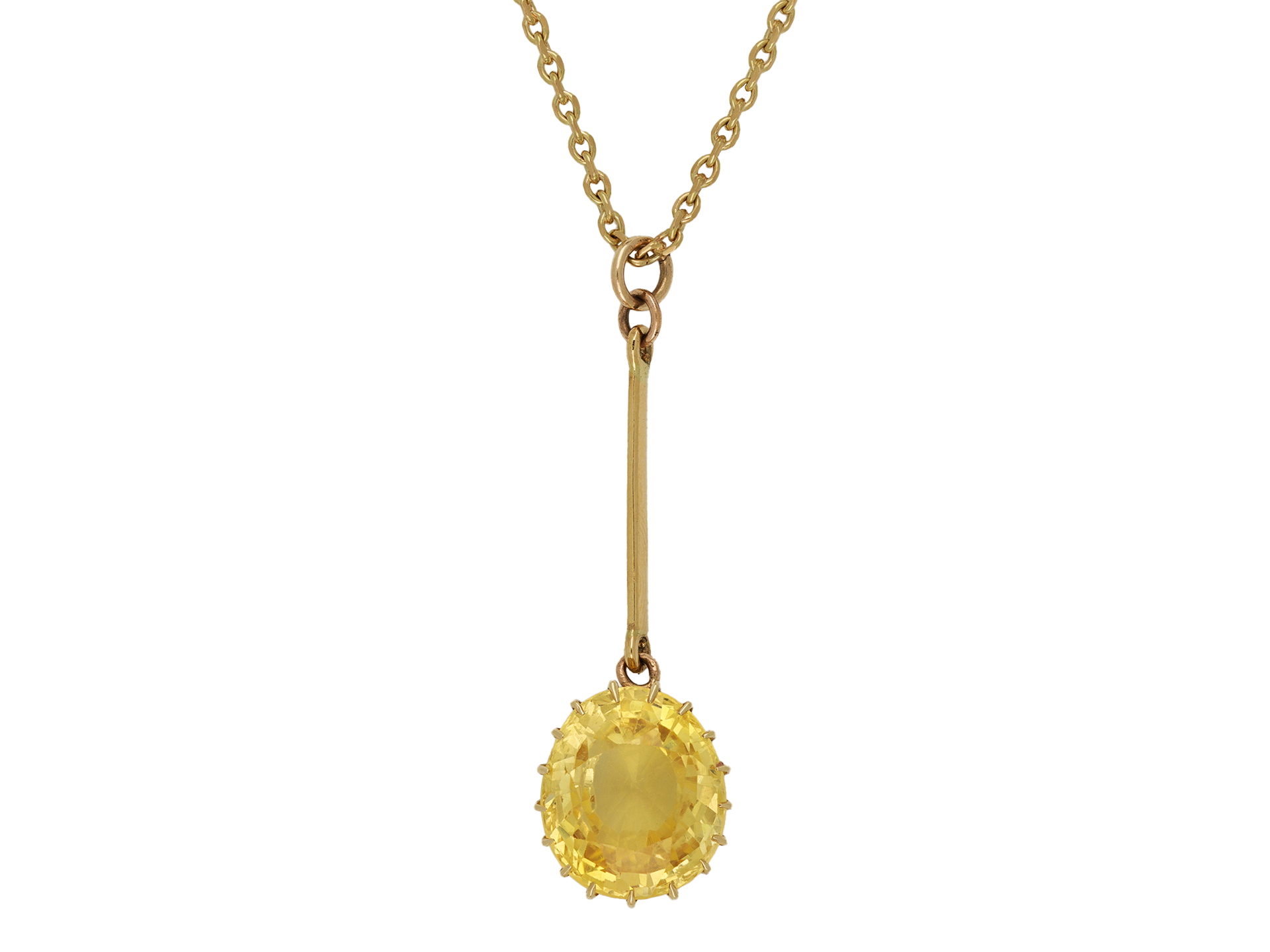 Yellow Ceylon sapphire pendant. Set with an oval old cut natural no heat yellow Ceylon sapphire in an open back claw setting with an approximate weight of 7.25 carats, to an elegant solitaire drop design featuring curving claws, a pierced gallery and open backholing, accompanied by fine trace chain, pendant approximately 3.5 cm in length, chain approximately 18" in length. Pendant tested yellow gold, circa 1900, accompanied by the Gem & Pearl Laboratory report #25560, and a fitted antique box.