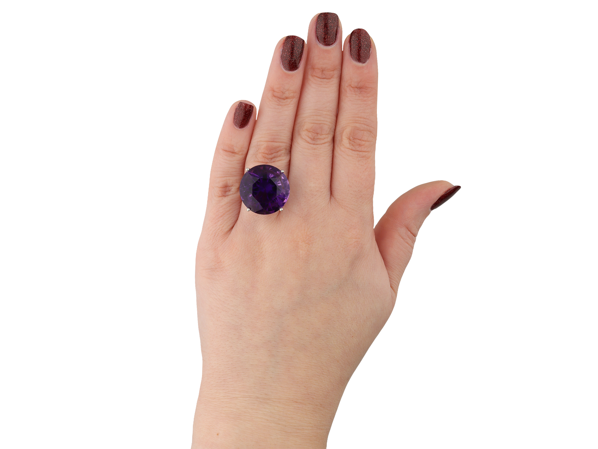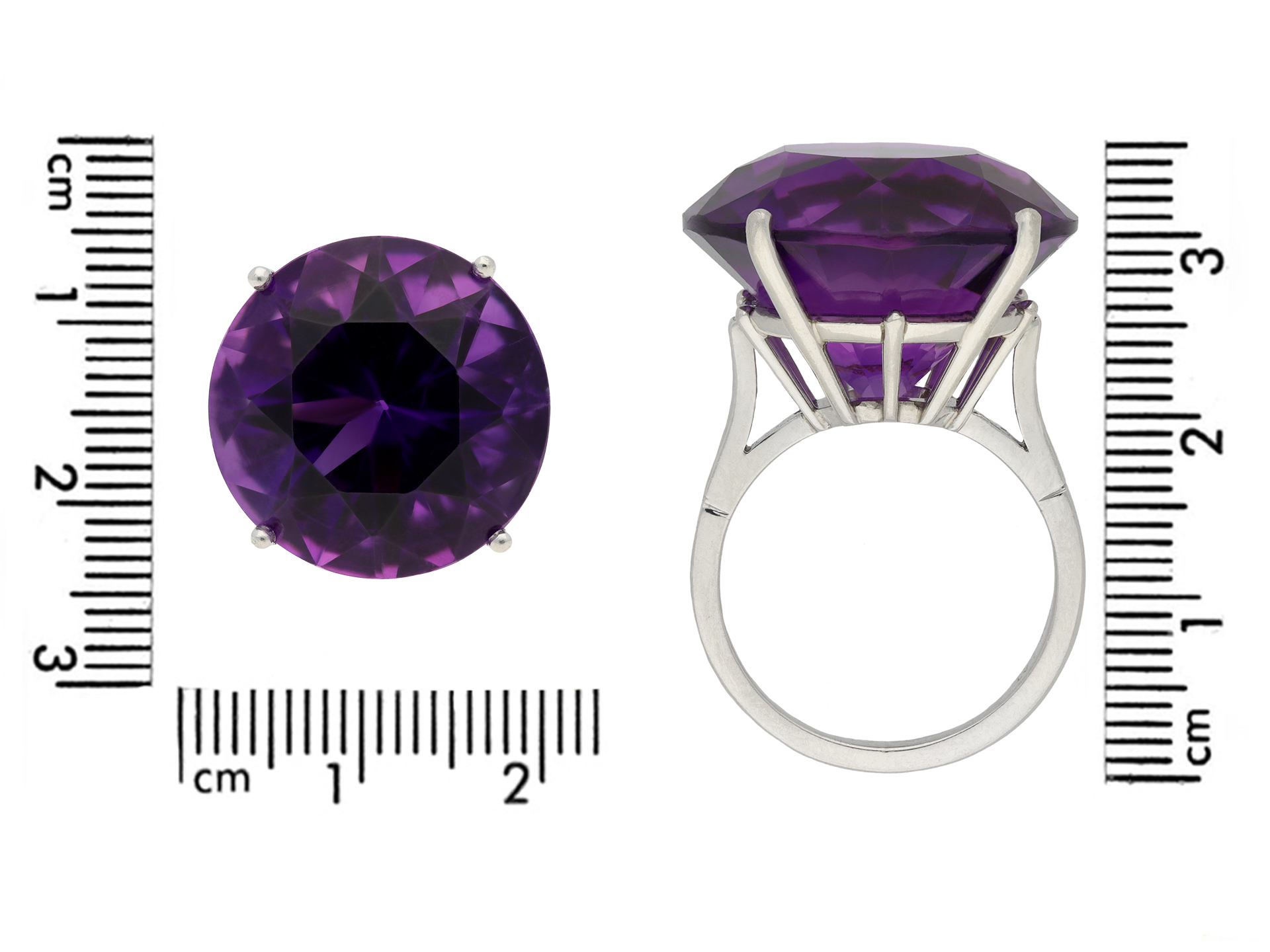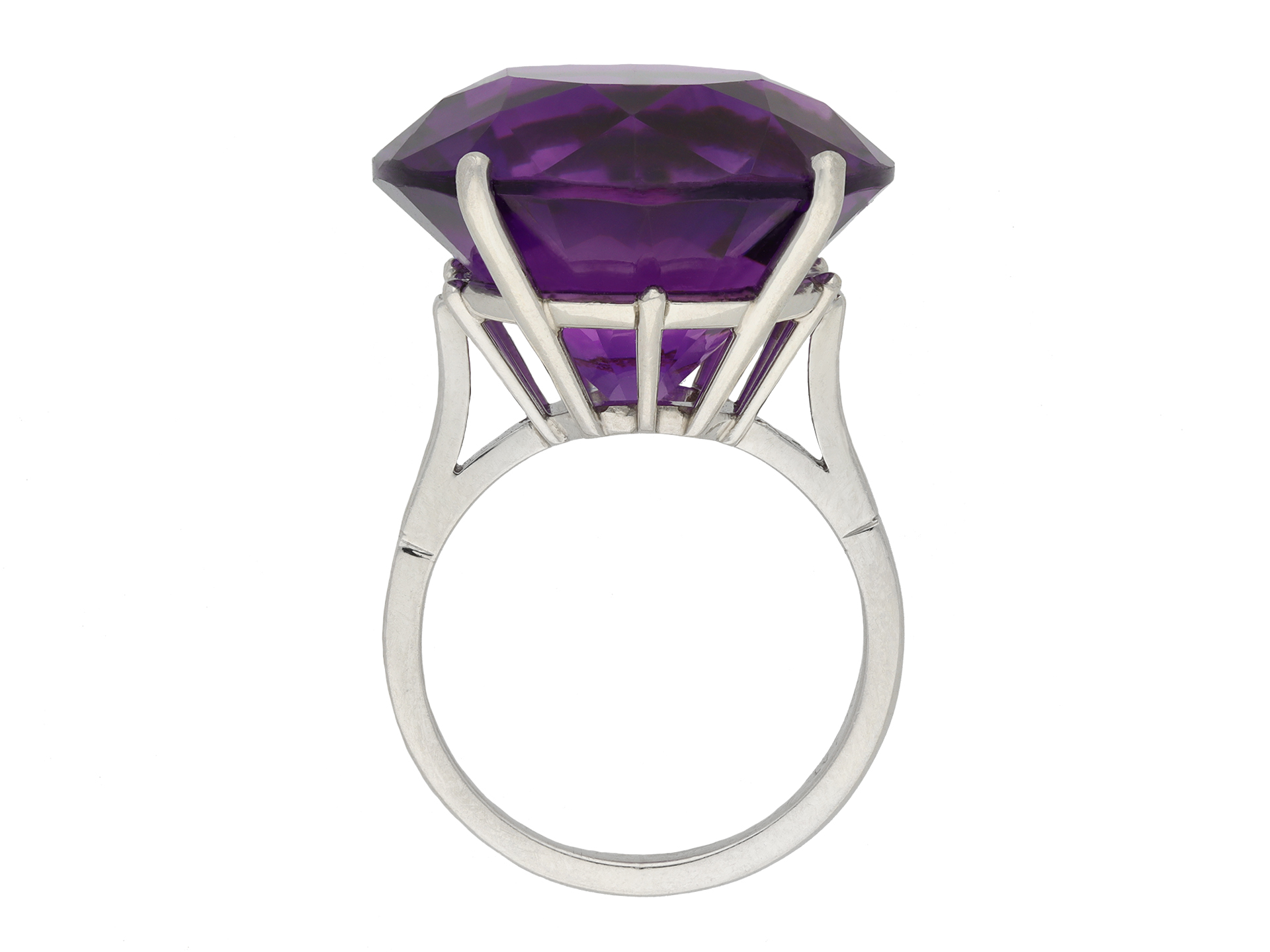 Amethyst dress ring. Set with a round old cut natural amethyst in an open back claw setting with an approximate weight of 21.60 carats, to an impressive cocktail ring design featuring curving claws, a structural open gallery and open circular backholing, leading to raised shoulders with ridged detail and flowing through to a solid D-shape shank. Marked platinum.