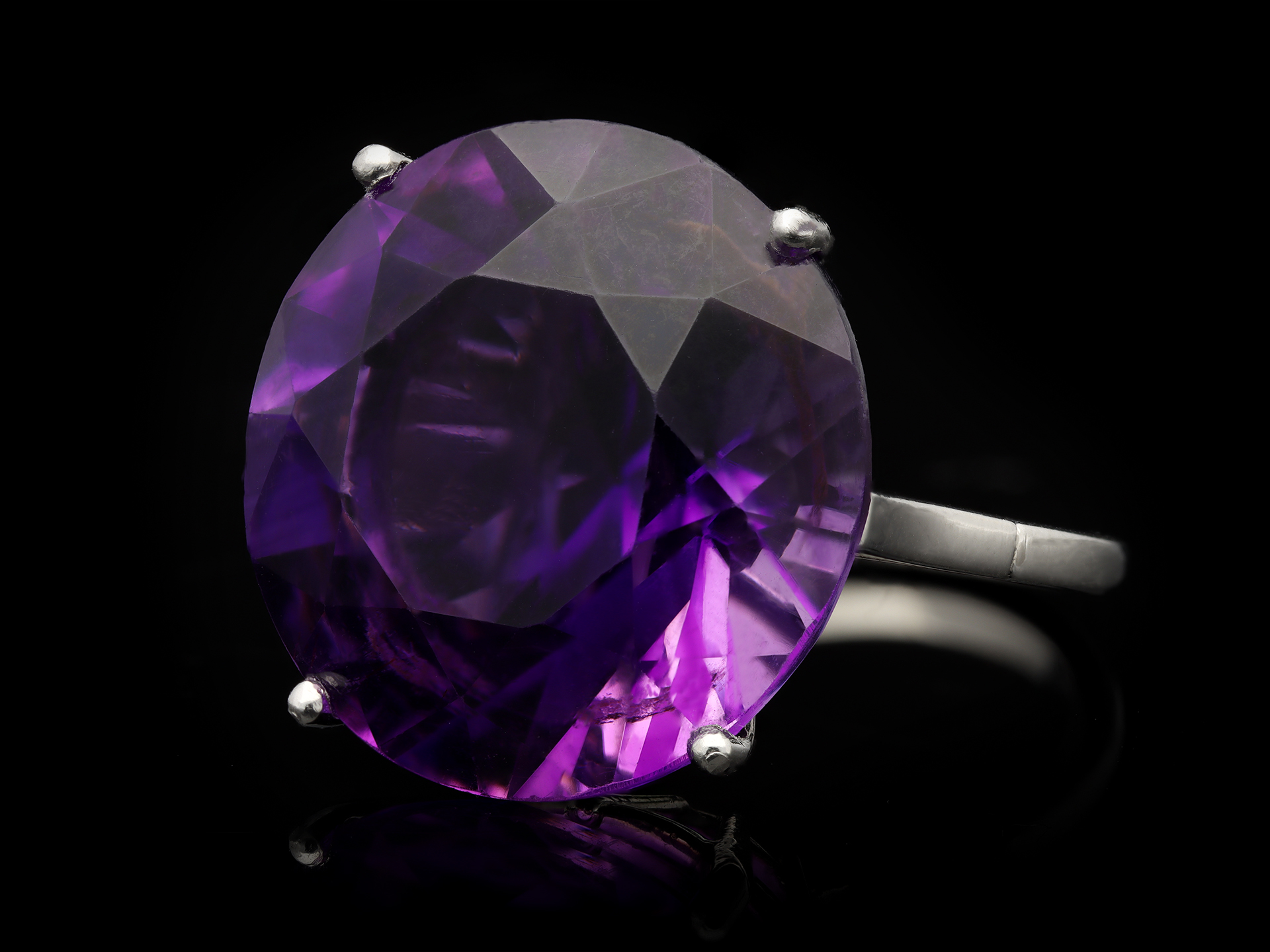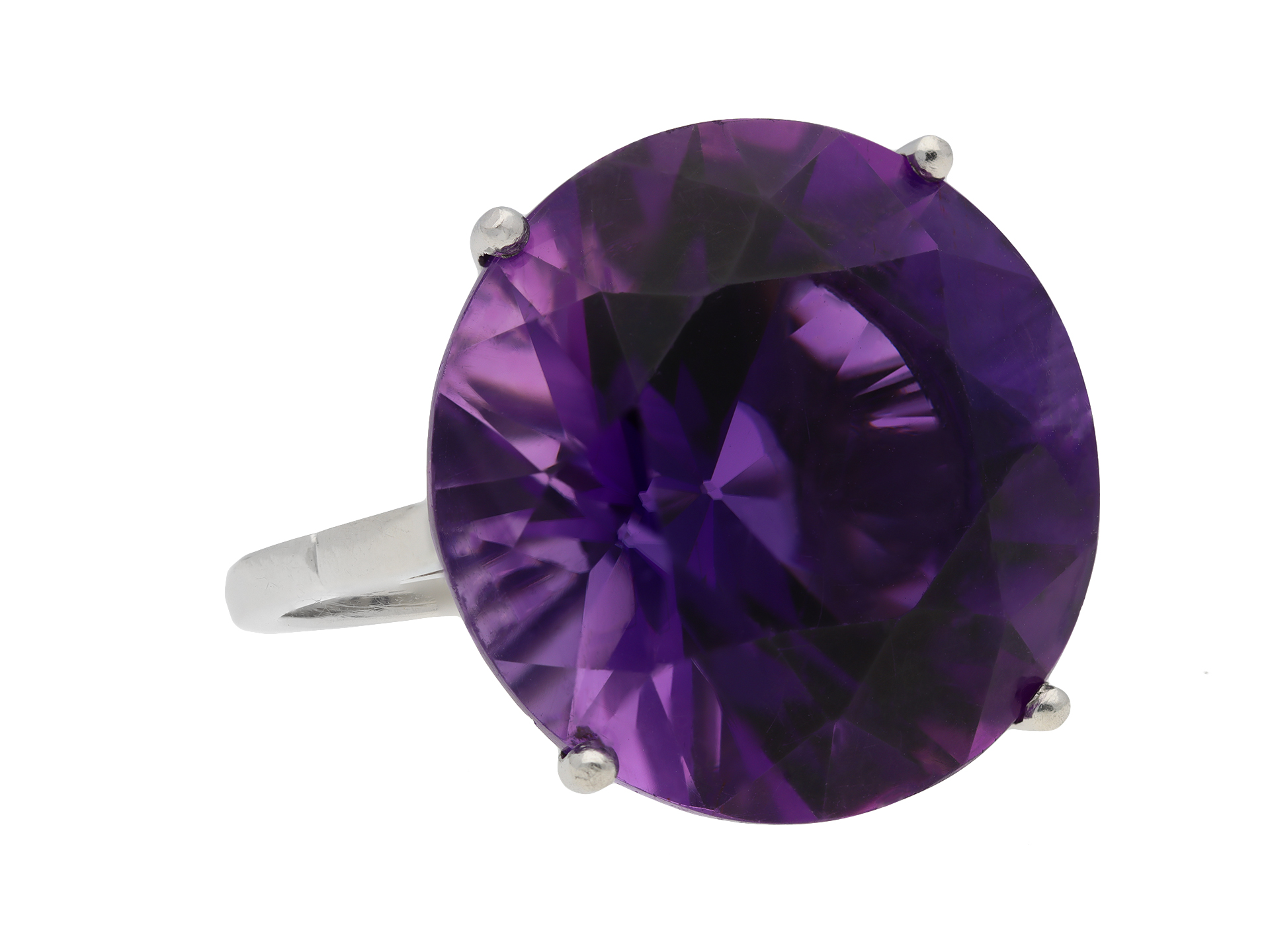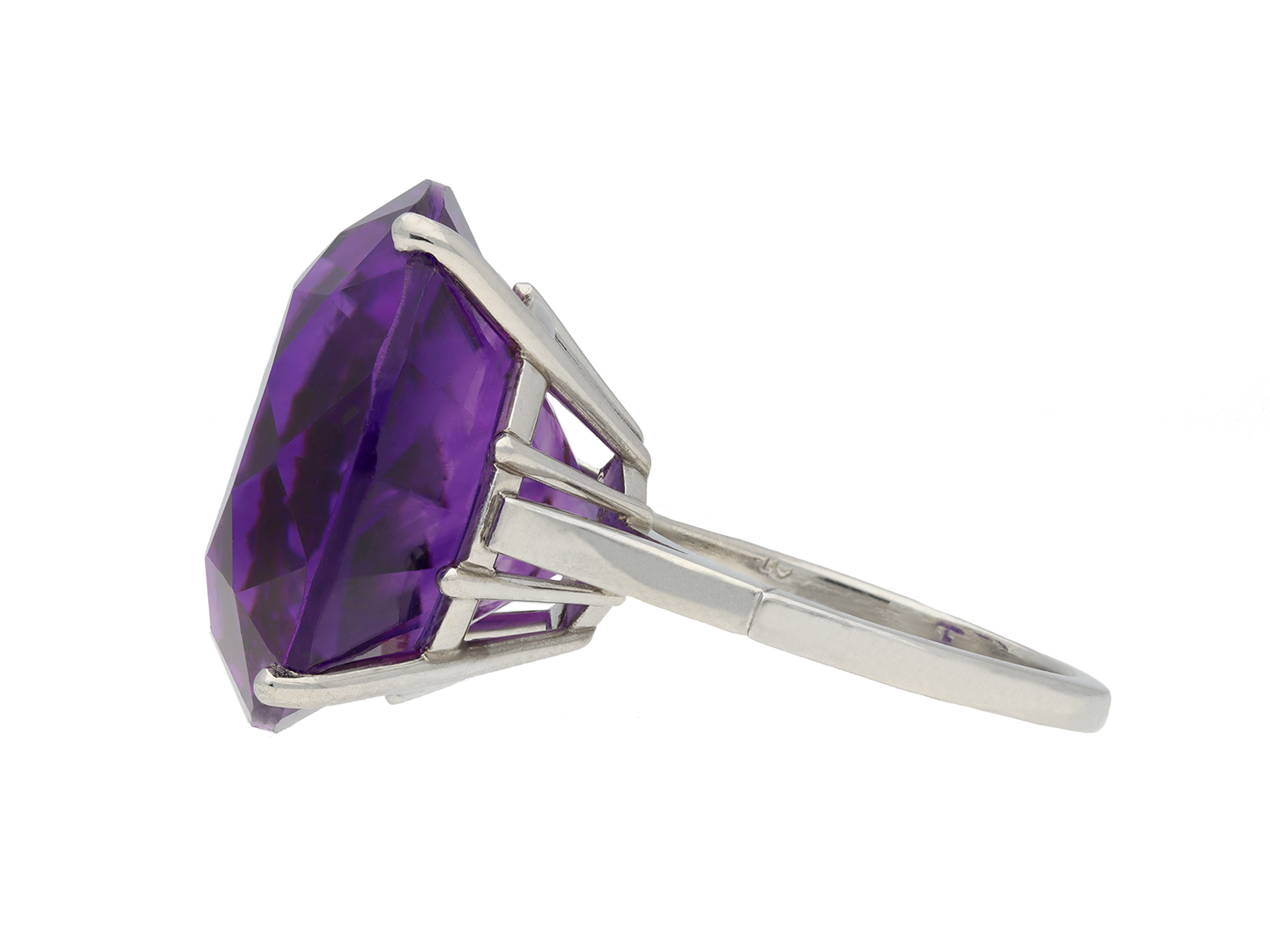 Amethyst dress ring. Set with a round old cut natural amethyst in an open back claw setting with an approximate weight of 21.60 carats, to an impressive cocktail ring design featuring curving claws, a structural open gallery and open circular backholing, leading to raised shoulders with ridged detail and flowing through to a solid D-shape shank. Marked platinum.