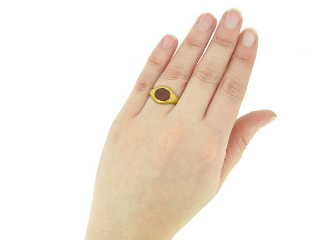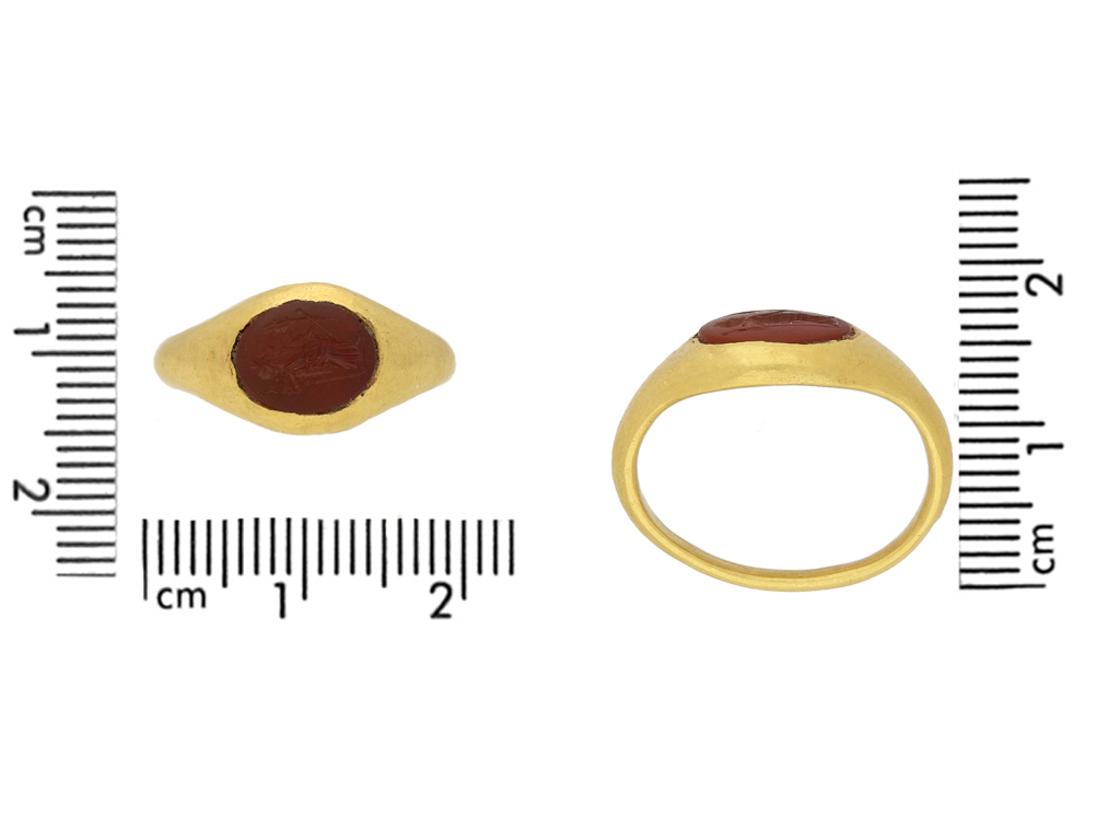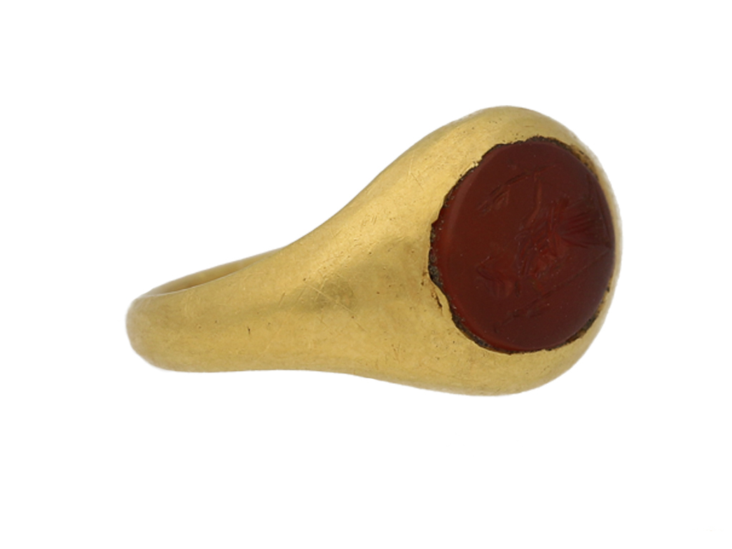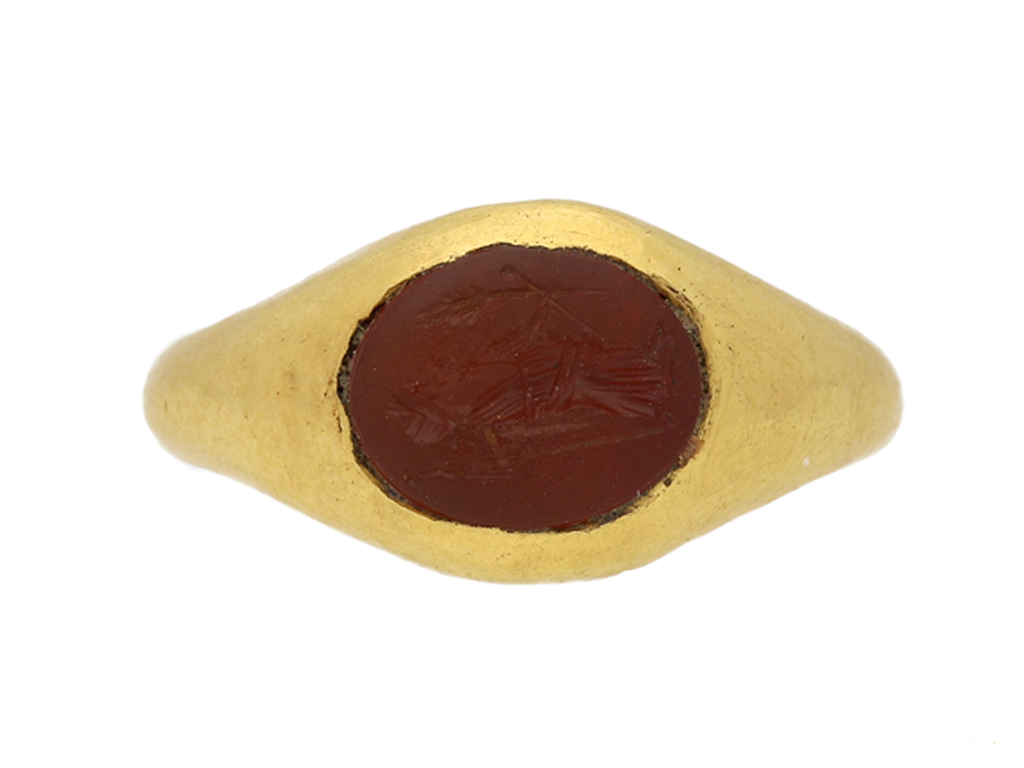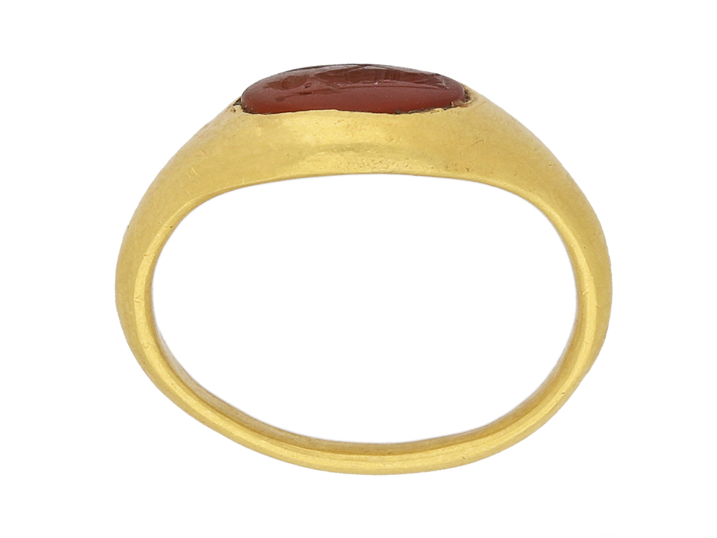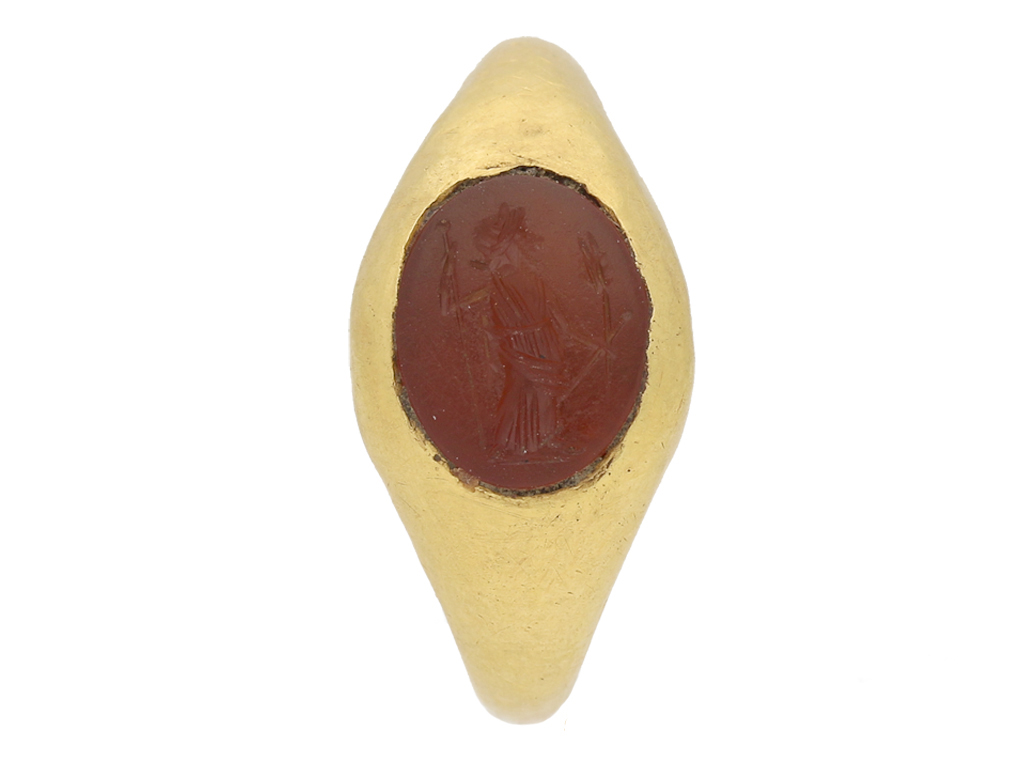 Ancient Roman Minerva intaglio ring. Set with an oval cornelian intaglio in a closed back rubover setting, finely engraved with Minerva, goddess of wisdom and war with spear and helmet, flanked by broad smoothly integrating shoulders which taper through to a solid D-shape shank. Tested yellow gold, approximately 5.78 grams in weight, circa 2nd century AD.