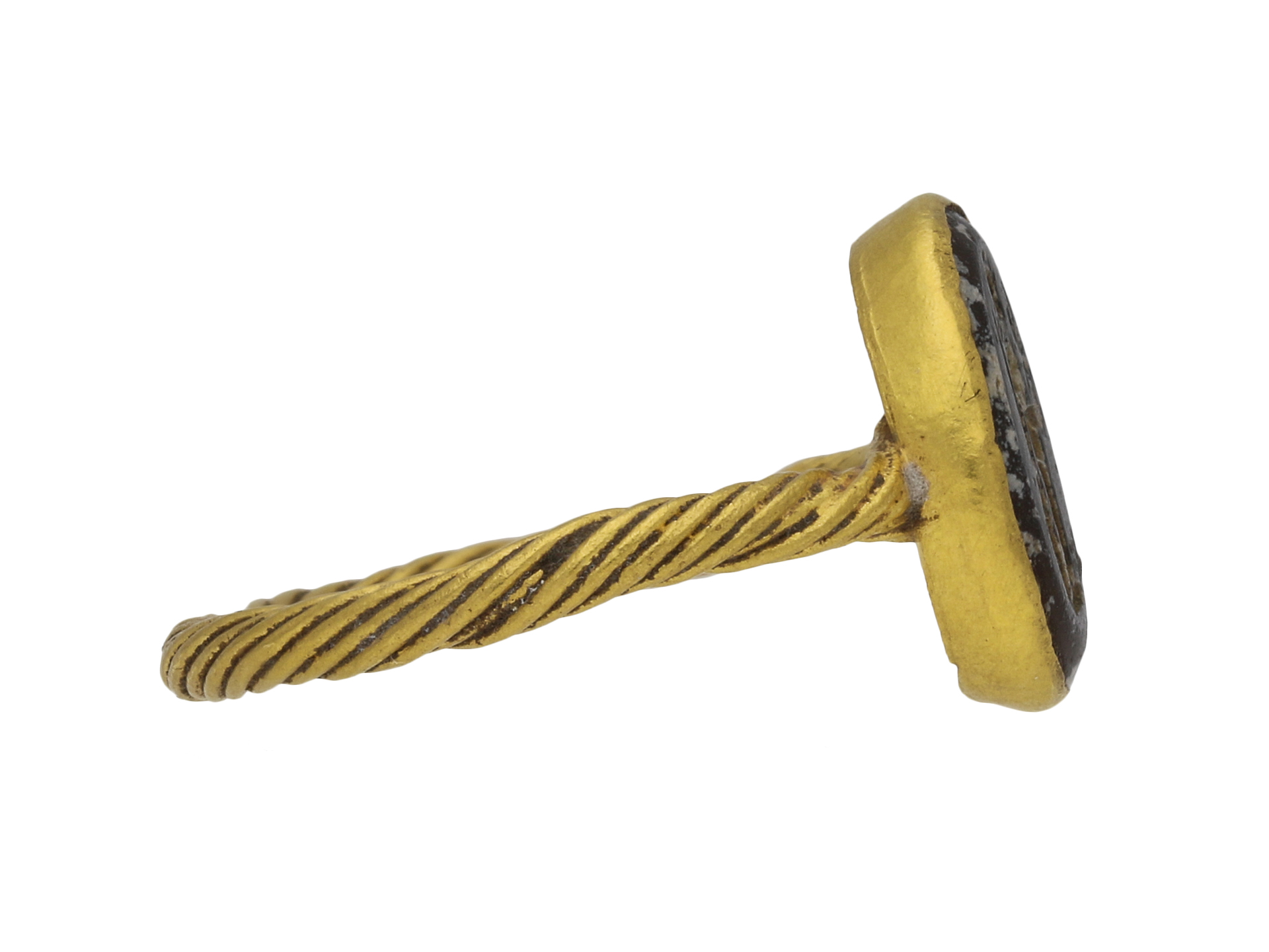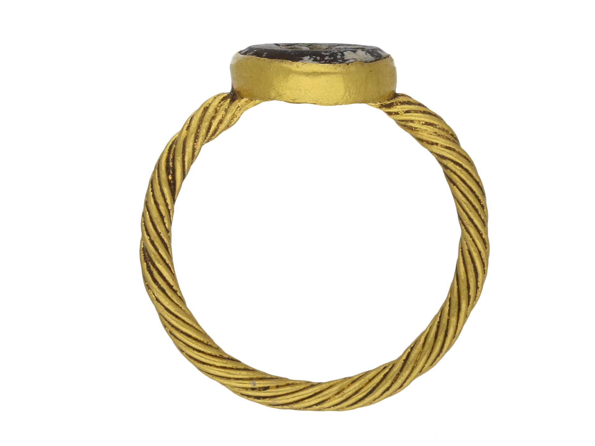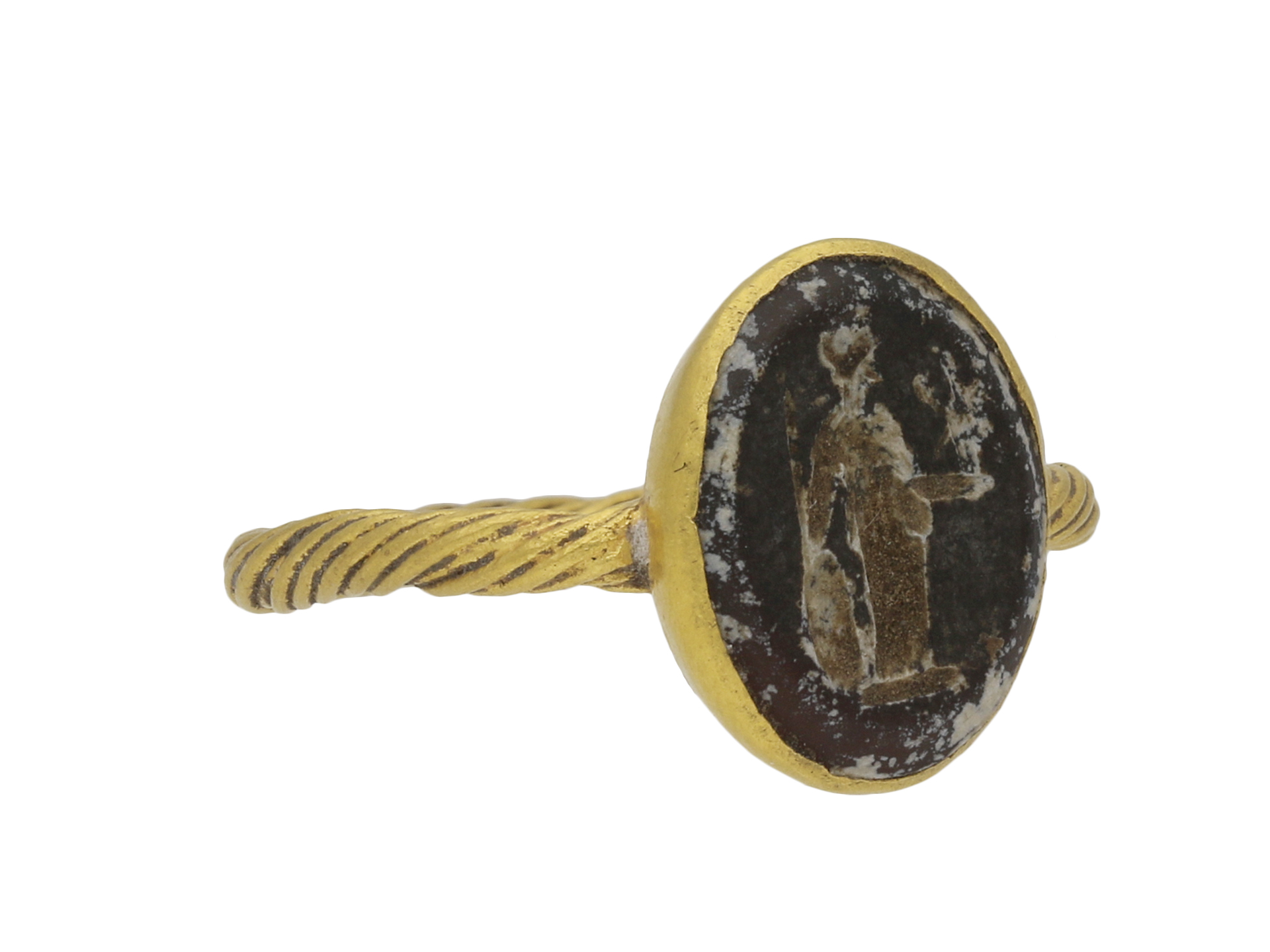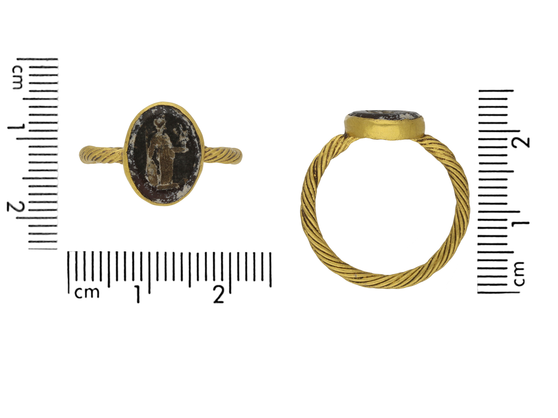 Ancient Roman goddess Minerva intaglio ring. Set with an oval brown stone intaglio depicting the Roman goddess Minerva holding a winged statue of Victory and shown with circular shield and spear in a rubover closed back setting, featuring a polished bezel and closed backholing continuing down to an intricate twisted wirework shank. Tested yellow gold, approximately 4.09g in weight, circa 2nd-3rd century AD.