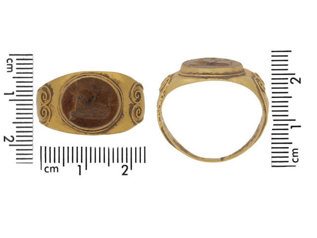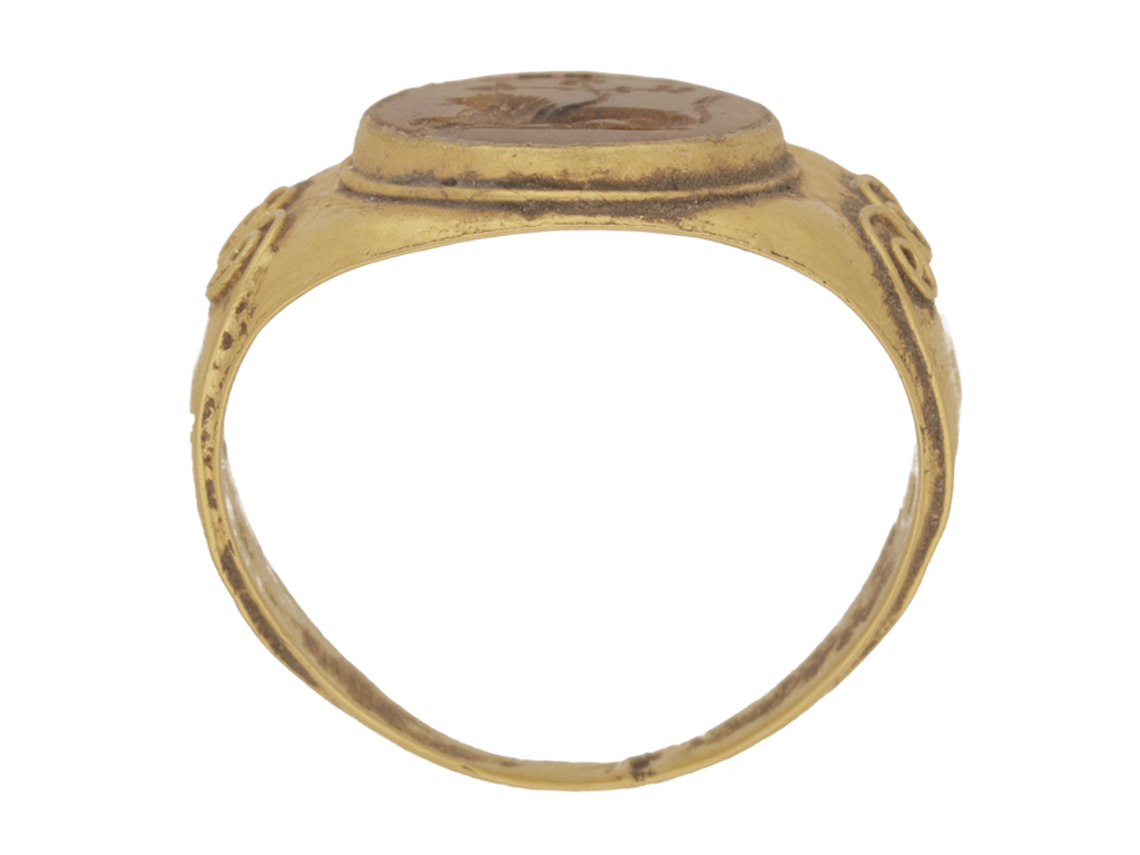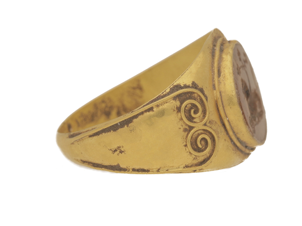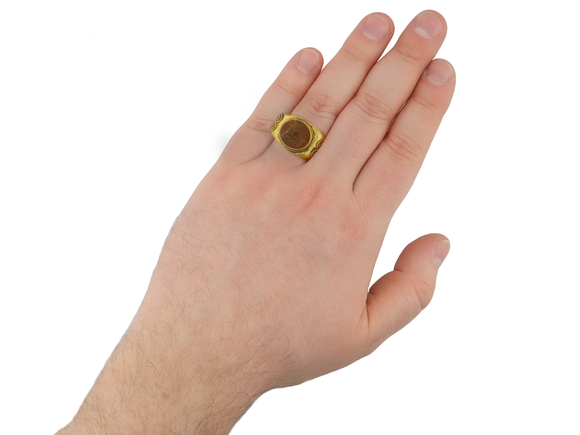 Ancient Roman ring with jasper lion intaglio. Set with an oval jasper intaglio of a sitting lion underneath a tree in a closed back Roman set setting, encompassed by a fine wire border, the broad integrated shoulders highlighted with a scrolling wirework design and tapering to reverse. Tested yellow gold, approximately 5.70 grams in weight, circa 3rd century AD.