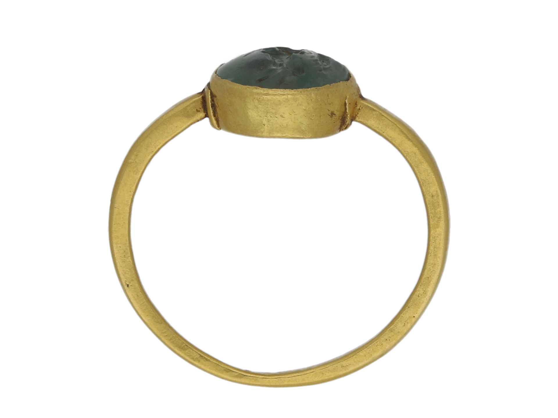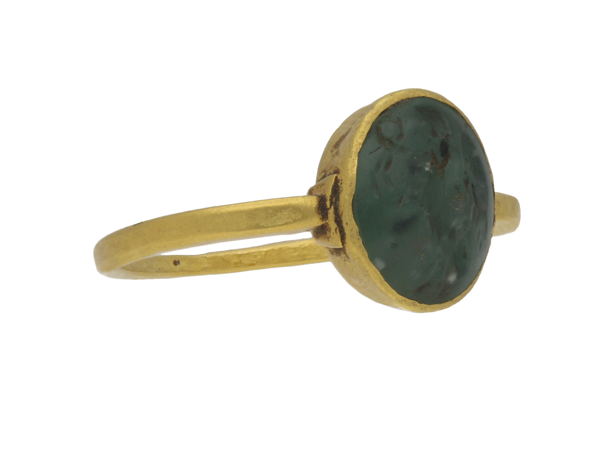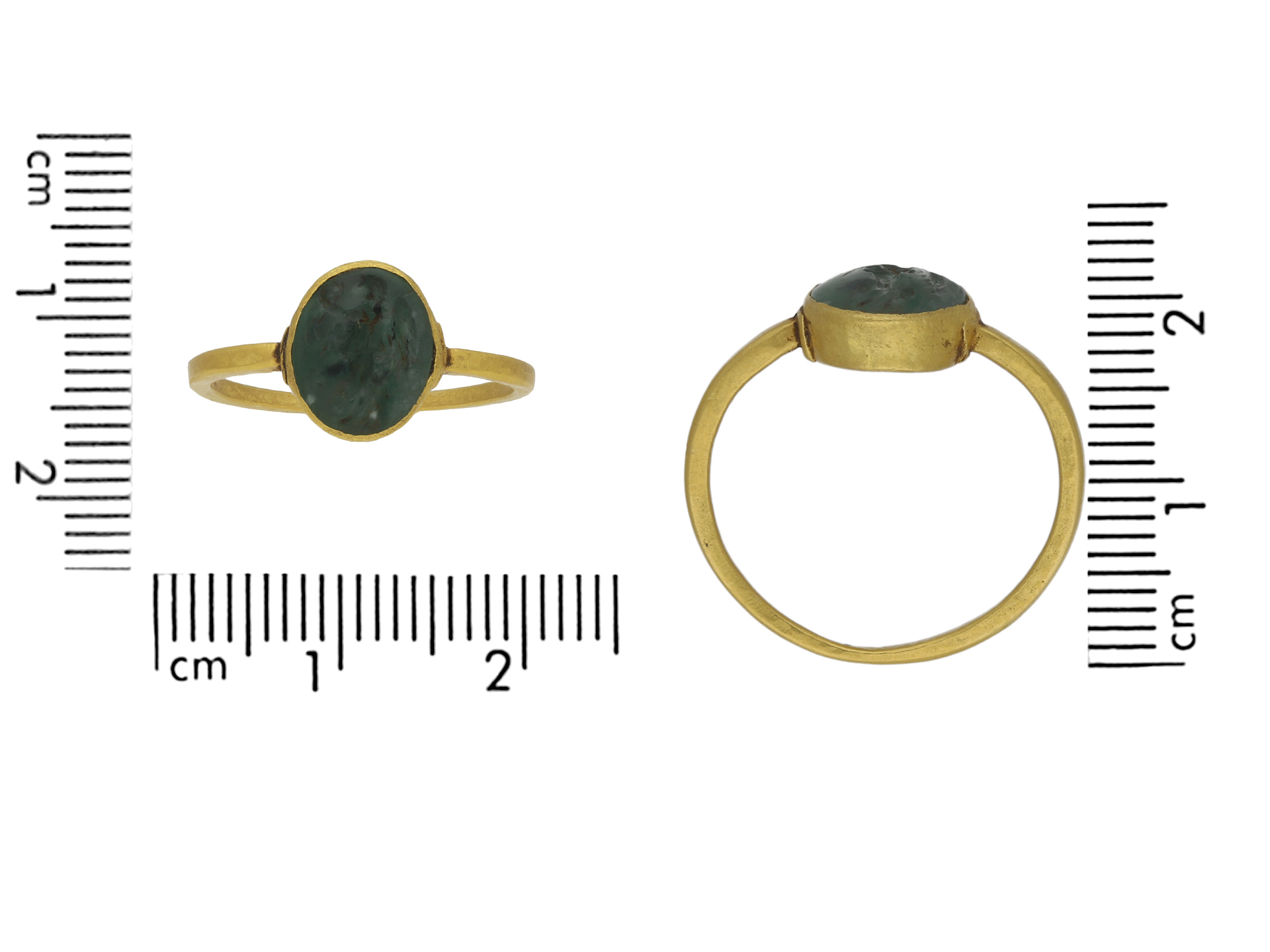 Ancient Roman signet ring engraved with Victory. Set to centre with a single green hardstone intaglio in a closed back Roman set setting featuring a full length profile of winged Victory holding up a laurel wreath, leading to smooth shoulders and flowing through to a solid square shank. Tested yellow gold, approximately 3.21 grams in weight, circa 2nd century AD.