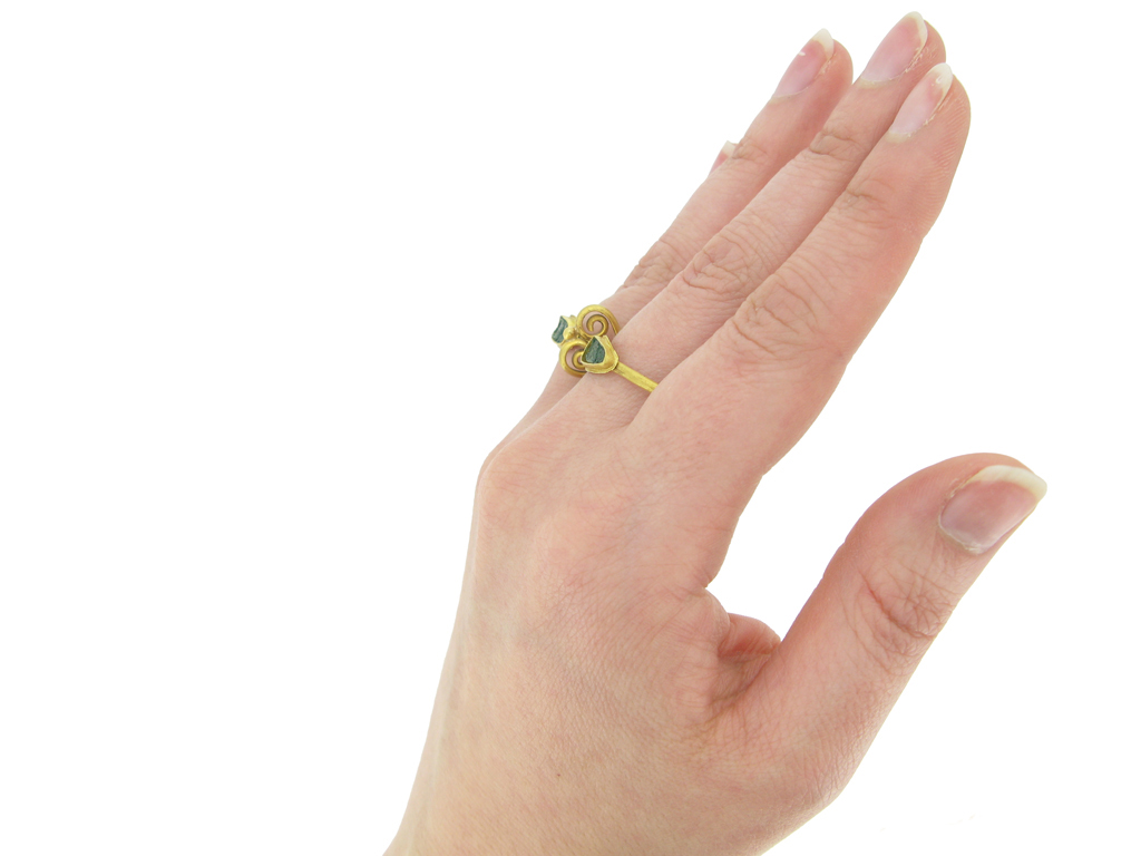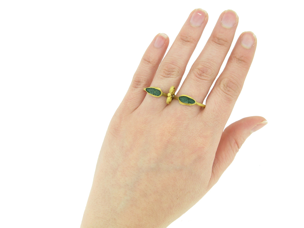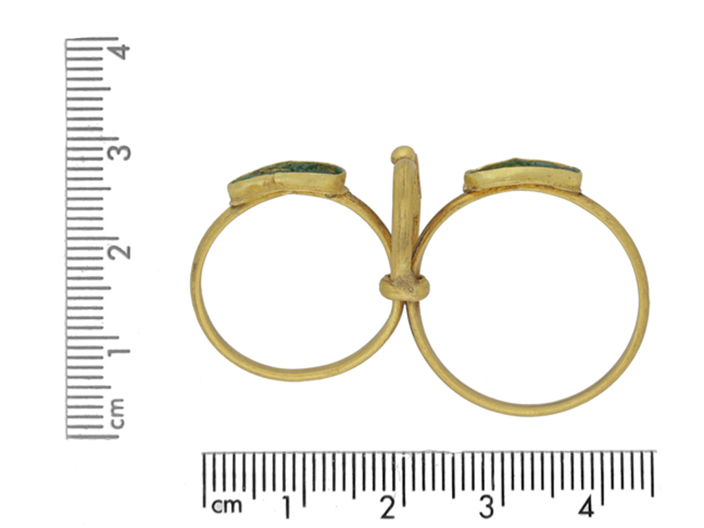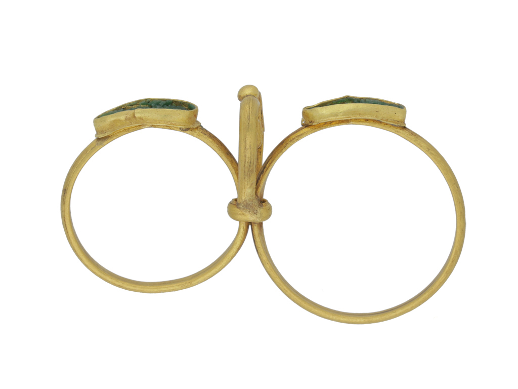 Ancient Roman twin ring set with glass. An unusual and rare ring composed of a pair of D-shape finger hoops, each set to top with a horizontal drop shape collet with green glass inlay, joined together by a decorative double wire scroll and gold granule to top. Tested yellow gold, approximately 6.19 grams in weight, circa 1st-2nd century AD.